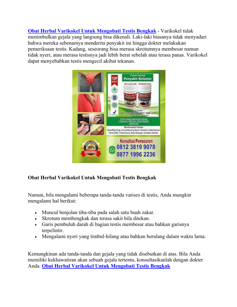Obat Herbal Varikokel Untuk Mengobati Testis Bengkak - Varikokel tidak menimbulkan gejala yang langsung bisa dikenali. Laki-laki biasanya tidak menyadari bahwa mereka sebenarnya menderita penyakit ini hingga dokter melakukan pemeriksaan testis. Kadang, seseorang bisa merasa skrotumnya membesar namun tidak nyeri, atau merasa testisnya jadi lebih berat sebelah atau terasa panas. Varikokel dapat menyebabkan testis mengecil akibat tekanan. Obat Herbal Varikokel Untuk Mengobati Testis Bengkak Namun, bila mengalami beberapa tanda-tanda varises di testis, Anda mungkin mengalami hal berikut: Muncul benjolan tiba-tiba pada salah satu buah zakar. Skrotum membengkak dan terasa sakit bila ditekan. Garis pembuluh darah di bagian testis membesar atau bahkan garisnya terpelintir. Mengalami nyeri yang timbul-hilang atau bahkan berulang dalam waktu lama. Kemungkinan ada tanda-tanda dan gejala yang tidak disebutkan di atas. Bila Anda memiliki kekhawatiran akan sebuah gejala tertentu, konsultasikanlah dengan dokter Anda. Obat Herbal Varikokel Untuk Mengobati Testis Bengkak Apa itu varikokel? Varikokel adalah pembengkakan pembuluh darah vena dalam buah zakar (skrotum). Kondisinya mirip dengan varises pada kaki. Vena membawa darah dari sel dan jaringan kembali ke jantung, untuk kemudian ditukar dengan sel darah baru yang beroksigen. Varikokel dapat terjadi pada salah satu sisi atau kedua sisi buah zakar. Penyakit yang sering juga disebut dengan varises testis ini biasanya terjadi pada sisi kiri. Kondisi ini dapat menyebabkan buah zakar jadi bengkak meregang. Apa penyebab varikokel? Sebetulnya penyebab kondisi varises pada testis tidak diketahui secara pasti. Mulanya diduga bahwa katup pembuluh darah di testis kadang suka tidak berfungsi dengan baik, atau bahkan menghilang. Jadi, aliran darah melambat karena tidak mengalir dengan lancar. Jika aliran darah melambat, darah mungkin tersumbat di pembuluh darah. Padahal pembuluh darah ini tugasnya membawa dasar dari sel dan jaringan kembali ke jantung. Pada kasus varikokel, benjolan ini biasanya terjadi pada sisi kiri karena vena di sisi itu lebih sering mendapat tekanan besar daripada sisi kanan. Bila aliran darah di testis dan skrotum tidak bekerja dengan baik, darah akan menumpuk dan menyebabkan pembengkakan. Hal inilah yang akan menyebabkan pembuluh darah di kantong testis Anda membengkak. Obat Herbal Varikokel Untuk Mengobati Testis Bengkak Mengapa varikokel sering dianggap membuat pria menjadi tidak subur? Subur tidaknya seorang pria terutama dipengaruhi oleh kualitas sperma yang diproduksi oleh testis di dalam buah zakar. Aliran darah dari jantung menuju penis ketika pria mendapatkan rangsangan seksual akan menciptakan ereksi. Di saat yang bersamaan, skrotum (buah zakar) tertarik ke dalam tubuh untuk mempersiapkan air mani. Adanya pembengkakan pembuluh darah vena akibat varises di testis ini dapat menyebabkan katup pembuluh vena tidak bisa berfungsi optimal untuk mengembalikan darah ke jantung. Darah yang terjebak di area intim ini semakin lama akan meningkatkan suhu di sekitar testis dari seharusnya. Padahal, agar testis dapat memproduksi kloter sperma yang sehat dan berkualitas, suhu di sekitarnya tak boleh melebihi dari 4 derajat di atas suhu tubuh normal. Suhu panas akan sangat memengaruhi kualitas sperma. Peningkatan suhu satu derajat saja akan mengurangi jumlah sperma sebanyak 40 persen. Ada satu saja kelainan pada sperma (baik itu bentuk yang rusak, jumlah sperma yang kurang, dan motilitas atau gerak sperma yang lambat) dapat meningkatkan risiko pria menjadi tidak subur. Inilah alasan mengapa testis berada di luar tubuh pria, di dalam lindungan skrotum: Sperma akan berada pada kondisi paling prima ketika berada di lingkungan dingin, di bawah suhu tubuh normal. Lalu, apakah semua pria yang memiliki penyakit varikokel akan mengalami gangguan kesuburan? Belum tentu. Kesuburan pria tergantung dari banyak faktor. Termasuk di antaranya adalah sudah berapa lama Anda memiliki varikokel, tingkat keparahannya, dan lokasi (di salah satu atau kedua sisi skrotum). Diagnosis dan pengobatan dini juga dapat memperbaiki peluang kesuburan Anda. Untuk memastikannya, sebaiknya Anda berkonsultasi langsung dengan dokter spesialis bedah urologi. Beberapa jenis operasi untuk mengatasi varikokel: 1. Varikoselektomi Operasi ini dilakukan di bawah pengaruh anestesi lokal atau umum. Dokter bedah nantinya akan membedah lewat jalur melalui selangkangan, atau lebih jarang, melalui perut atau paha atas. Dokter akan menggunakan ultrasound dan mikroskop bedah guna menutup vena yang terkena penumpukan aliran darah. Lalu, dokter akan mengubah rute darah melalui pembuluh darah lain yang lebih sehat. Nyeri pasca operasi biasanya akan muncul, dan selang beberapa minggu, pasien sehabis operasi varikoselektomi dapat segera kembali beraktivitas normal. 2. Embolisasi Pada operasi pembedahan ini, seorang radiologi akan memasukkan selang atau kateter ke dalam tubuh melalui leher atau selangkangan. Nantinya, alat bedah akan dibawa melalui tabung, dan ahli bedah menggunakan bersamaan dengan bahan kimia khusus untuk memblokir pembuluh darah yang tersumbat oleh jaringan parut itu. Ini adalah operasi kecil yang dapat dilakukan dengan rawat jalan. Pemulihan sehabis operasi ini juga umumnya tidak memerlukan waktu lama-lama. Anda tidak harus melakukan pembedahan atau operasi jika mengalami varises di testis. Namun, Anda mungkin ingin mempertimbangkan perawatan jika varikokel sampai menyebabkan: Testis menyusut (atrofi testis). Rasa sakit. Infertilitas atau ketidaksuburan.. Varises testis dapat menyebabkan masalah fungsi testis pada beberapa orang. Semakin dini Anda konsultasi dan mendapat perawatan, semakin baik peluang Anda untuk meningkatkan produksi sperma. Perawatan tambahan, seperti gabungan dari prosedur varikoselektomi dan embolisasi varikokel, mungkin diperlukan jika gejala Anda memburuk. Efek samping operasi Kedua prosedur pembedahan varises di testis di atas umumnya relatif aman. Namun, tetap