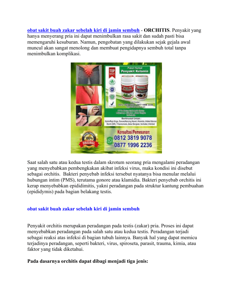 obat sakit buah zakar sebelah kiri di jamin sembuh - ORCHITIS. Penyakit yang hanya menyerang pria ini dapat menimbulkan rasa sakit dan sudah pasti bisa memengaruhi kesuburan. Namun, pengobatan yang dilakukan sejak gejala awal muncul akan sangat menolong dan membuat pengidapnya sembuh total tanpa menimbulkan komplikasi. Saat salah satu atau kedua testis dalam skrotum seorang pria mengalami peradangan yang menyebabkan pembengkakan akibat infeksi virus, maka kondisi ini disebut sebagai orchitis. Bakteri penyebab infeksi tersebut nyatanya bisa menular melalui hubungan intim (PMS), terutama gonore atau klamidia. Bakteri penyebab orchitis ini kerap menyebabkan epididimitis, yakni peradangan pada struktur kantung pembuahan (epididymis) pada bagian belakang testis. obat sakit buah zakar sebelah kiri di jamin sembuh Penyakit orchitis merupakan peradangan pada testis (zakar) pria. Proses ini dapat menyebabkan peradangan pada salah satu atau kedua testis. Peradangan terjadi sebagai reaksi atas infeksi di bagian tubuh lainnya. Banyak hal yang dapat memicu terjadinya peradangan, seperti bakteri, virus, spiroseta, parasit, trauma, kimia, atau faktor yang tidak diketahui. Pada dasarnya orchitis dapat dibagi menjadi tiga jenis: Orchitis idiopatik, merupakan jenis orchitis yang tidak diketahui dengan pasti penyebabnya. Orchitis bakteri, yang paling sering menjadi penyebab orchitis adalah Escherichia coli, Staphylococcus, dan Streptococcus. Bakteri penyebab epididimitis juga dapat menjadi penyebab munculnya orchitis. Pada pria yang aktif secara seksual, bakteri penyebab penyakit menular seksual bisa menyebabkan orchitis. Orchitis virus. Virus merupakan penyebab utama orchitis. Jenis orchitis ini paling sering dialami oleh anak laki-laki yang berusia kurang dari 10 tahun. obat sakit buah zakar sebelah kiri di jamin sembuh Apa Gejala yang Akan Dirasakan Pengidap Orchitis? Salah satu gejala yang sangat umum dari penyakit orchitis adalah nyeri pada buah zakar dan area selangkangan. Sementara itu, gejala lainnya meliputi: Area skrotum menjadi sensitif (mudah nyeri jika disentuh). Skrotum membengkak. Kelenjar getah bening di area selangkangan membengkak. Demam. Sakit saat buang air kecil dan ejakulasi. Terdapat darah dalam air mani. Prostat membesar. Mual dan muntah. Apabila kamu merasakan sakit atau pembengkakan di skrotum, terutama terjadi tibatiba, maka harus segera mungkin untuk mencari penanganan yang tepat. Untuk meredakan nyeri pada buah zakar atau testis anda bisa menggunakan cara berikut ini di rumah: Hindari penggunaan celana yang kendur. Kenakan celana yang pas atau celana atletik guna mengangkat skrotum dan meningkatkan kenyamanan. Kompres es ke daerah skrotum. Namun, hindari mengaplikasikan es langsung ke kulit karena dapat menyebabkan luka karena pembekuan. Sebaliknya, es harus dibungkus dengan kain dan lalu tempelkan pada skrotum. Tempelkan kompres es ini selama 10 hingga 15 menit pada suatu waktu, beberapa kali sehari selama 1-2 hari pertama. Cara ini diyakini ampuh membantu mengurangi pembengkakan dan rasa sakit. Penelusuran yang terkait dengan obat sakit buah zakar sebelah kiri di jamin sembuh : obat alami buah zakar sakit sebelah kanan, obat alami sakit buah zakar sebelah kiri, obat alami buah zakar bengkak sebelah kiri, obat tradisional sakit buah zakar sebelah kanan, "obat apotik buah zakar besar sebelah", obat tradisional benjolan di buah zakar, obat alami buah zakar bengkak sebelah kanan, cara mengatasi sakit buah zakar sebelah kanan Cara Alami Mengobati Buah Zakar Bengkak - Sakit Buah Zakar - Verikokel Hidrokel - Orchitis - Kencing Nanah/Gonore - ISK - Sipilis/Raja Singa Klamidia - Trikomoniasis Dan Penyakit Lainnya
