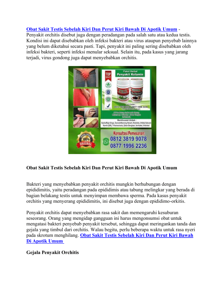 Obat Sakit Testis Sebelah Kiri Dan Perut Kiri Bawah Di Apotik Umum Penyakit orchitis disebut juga dengan peradangan pada salah satu atau kedua testis. Kondisi ini dapat disebabkan oleh infeksi bakteri atau virus ataupun penyebab lainnya yang belum diketahui secara pasti. Tapi, penyakit ini paling sering disebabkan oleh infeksi bakteri, seperti infeksi menular seksual. Selain itu, pada kasus yang jarang terjadi, virus gondong juga dapat menyebabkan orchitis. Obat Sakit Testis Sebelah Kiri Dan Perut Kiri Bawah Di Apotik Umum Bakteri yang menyebabkan penyakit orchitis mungkin berhubungan dengan epididimitis, yaitu peradangan pada epididimis atau tabung melingkar yang berada di bagian belakang testis untuk menyimpan membawa sperma. Pada kasus penyakit orchitis yang menyerang epididimitis, ini disebut juga dengan epididimo-orkitis. Penyakit orchitis dapat menyebabkan rasa sakit dan memengaruhi kesuburan seseorang. Orang yang mengidap gangguan ini harus mengonsumsi obat untuk mengatasi bakteri penyebab penyakit tersebut, sehingga dapat meringankan tanda dan gejala yang timbul dari orchitis. Walau begitu, perlu beberapa waktu untuk rasa nyeri pada skrotum menghilang. Obat Sakit Testis Sebelah Kiri Dan Perut Kiri Bawah Di Apotik Umum Gejala Penyakit Orchitis Terdapat berbagai gejala dari orchitis yang dapat berkembang secara tiba-tiba, antara lain: Pembengkakan pada satu atau kedua testis Nyeri yang terasa mulai dari yang ringan hingga yang parah Mengalami demam Mual dan muntah Badan terasa tidak nyaman (malaise) Lalu, gejala yang dapat timbul lainnya adalah nyeri selangkangan terjadi pada lipatan kulit antara paha dan perut, bukan pada testis. Penyebab dari nyeri pangkal paha yang terjadi dapat berbeda dari nyeri testis. Penyebab Penyakit Orchitis Penyakit ini umumnya disebabkan oleh bakteri dan virus. Berikut bakteri dan virus yang dapat menyebabkan seseorang mengidap orchitis: Salah satu jenis bakteri yang menyebabkan orchitis adalah Escherichia coli, Staphylococcus, dan Streptococcus. Infeksi prostat yang terjadi juga dapat menyebabkan orchitis. Bakteri ini juga dapat menyebabkan epididimitis yang menyebabkan epididimo-orkitis. Bakteri lainnya yang menyebabkan penyakit menular seksual juga dapat menyebabkan gangguan orchitis pada pria yang aktif secara seksual dengan rentang usia 19 hingga 35 tahun. Hal yang dapat kamu lakukan untuk mencegah ini terjadi adalah menggunakan kondom ketika melakukan hubungan intim dengan banyak orang. Lalu, virus yang menyebabkan gondong pada seseorang juga dapat menyebabkan gangguan pada testis. Gangguan ini umumnya terjadi pada anak laki-laki di atas 10 tahun dan terjadi mulai empat, hingga enam hari setelah gondong dimulai. Sepertiga anak laki-laki yang mengidap gangguan tersebut juga dapat mengidap atrofi testis atau menyusutnya testis. Maka dari itu, penting untuk melindungi anak dari penyakit gondong. Faktor Risiko Penyakit Orchitis Terdapat beberapa risiko yang dapat menyebabkan seseorang meningkat secara nonseksual, yaitu: Tidak diimunisasi terhadap gondong Memiliki infeksi saluran kemih berulang Melakukan operasi yang berhubungan dengan alat kelamin atau saluran kemih Terlahir dengan kelainan pada saluran kemih Perilaku seksual yang dapat menyebabkan infeksi menular seksual. Hal tersebut, meliputi: Memiliki banyak pasangan secara seksual Berhubungan intim dengan seseorang yang mengidap infeksi menular seksual Melakukan seks tanpa kondom Pernah mengidap infeksi menular seksual Komplikasi Penyakit Orchitis Penyakit tersebut dapat menyebabkan komplikasi pada pengidapnya, yaitu: Atrofi testis. Penyakit tersebut dapat menyebabkan testis pengidapnya mengalami penyusutan Abses skrotum. Jaringan yang terinfeksi dipenuhi dengan nanah Infertilitas. Gangguan ini juga dapat menyebabkan seseorang tidak subur karena produksi testosteron yang tidak memadai Penelusuran yang terkait dengan Obat Sakit Testis Sebelah Kiri Dan Perut Kiri Bawah Di Apotik Umum : obat nyeri testis di apotik, obat sakit buah zakar sebelah kiri, obat alami sakit buah zakar sebelah kiri, buah zakar sakit sebelah kiri kenapa ya, cara mengatasi sakit buah zakar sebelah kiri, cara mengatasi sakit buah zakar sebelah kanan, "obat apotik buah zakar besar sebelah", obat alami buah zakar bengkak sebelah kiri Cara Alami Mengobati Buah Zakar Bengkak - Sakit Buah Zakar - Verikokel Hidrokel - Orchitis - Kencing Nanah/Gonore - ISK - Sipilis/Raja Singa Klamidia - Trikomoniasis Dan Penyakit Lainnya