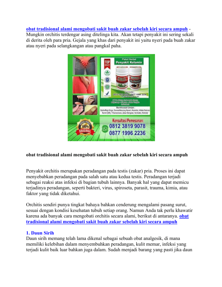 obat tradisional alami mengobati sakit buah zakar sebelah kiri secara ampuh Mungkin orchitis terdengar asing ditelinga kita. Akan tetapi penyakit ini sering sekali di derita oleh para pria. Gejala yang khas dari penyakit ini yaitu nyeri pada buah zakar atau nyeri pada selangkangan atau pangkal paha. obat tradisional alami mengobati sakit buah zakar sebelah kiri secara ampuh Penyakit orchitis merupakan peradangan pada testis (zakar) pria. Proses ini dapat menyebabkan peradangan pada salah satu atau kedua testis. Peradangan terjadi sebagai reaksi atas infeksi di bagian tubuh lainnya. Banyak hal yang dapat memicu terjadinya peradangan, seperti bakteri, virus, spiroseta, parasit, trauma, kimia, atau faktor yang tidak diketahui. Orchitis sendiri punya tingkat bahaya bahkan cenderung mengalami pasang surut, sesuai dengan kondisi kesehatan tubuh setiap orang. Namun Anda tak perlu khawatir karena ada banyak cara mengobati orchitis secara alami, berikut di antaranya. obat tradisional alami mengobati sakit buah zakar sebelah kiri secara ampuh 1. Daun Sirih Daun sirih memang telah lama dikenal sebagai sebuah obat analgesik, di mana memiliki kelebihan dalam menyembuhkan peradangan, kulit memar, infeksi yang terjadi kulit baik luar bahkan juga dalam. Sudah menjadi barang yang pasti jika daun ini bisa mengatasi gejala pembengkakan testis dengan pengolahan yang mudah tanpa menimbulkan efek samping. Segara tumbuk daun sirih kemudian campurkan dengan madu sebelum Anda mengolesnya di bagian testis. Setelah itu biarkan hingga 3 sampai 4 jam kemudian bersihkan. Jangan sampai terdapat sisa kotoran daun masih menempel pada testis, karena akan menyebabkan infeksi lagi atau gatal tak nyaman di bagian testis. Cara lainnya yang dapat Anda lakukan yaitu merebus daun sirih ini kemudian saring. Diamkan beberapa saat hingga hangat. Cairan ini bisa Anda konsumsi secara rutin 2 kali dalam sehari yaitu pada pagi dan malam hari sebagai cara mengobati orchitis secara alami. 2. Kunyit Hampir semua orang pasti mengenal bumbu dapur untuk penyedap rasa dan juga memberikan warna kuning yang alami pada masakan ini. Kunyit tentunya memiliki manfaat yang mana baik digunakan untuk membantu pemulihan infeksi pada saluran katung kemih pria. Kunyit mengandung beberapa bahan aktif yang dikenal dengan nama kurkumin sebagai suatu zat yang berguna untuk anti bakteri, anti jamur, dan anti pembengkakan. Proses penyembuhan penyakit orchitis dengan kunyit memang sudah ada sejak zaman dulu, sehingga tidak ragu lagi jika bumbu dapur ini memang solusi terbaik. 3. Jahe Jahe juga memiliki fungsi untuk menyembuhkan bagian testis yang membengkak. Selain itu juga bisa menghambat perkembangan dari bakteri secara menyeluruh di jaringan kelamin pria. Anda bisa mengonsumsi jahe yang dicampur dengan minuman, gepuk terlebih dahulu beberapa ruas jahe sebelum di seduh sehingga bisa menjadi cara mengobati orchitis secara alami. Untuk menambah selera, Anda bisa memberikan tambahan berupa susu dan juga gula Jawa. Minuman jahe yang bersifat menenangkan dan menghangatkan ini memang sudah lama jadi idola dari semua kalangan baik itu remaja, dewasa dan juga orang tua. 4. Cuka Sari Apel Bahan herbal selanjutnya ini tidak kalah manfaatnya dengan yang sebelumnya bahkan sering pula dipakai untuk menangani beberapa kondisi kesehatan lainnya. Cuka sari apel merupakan salah satu cairan yang didapatkan dari fermentasi buah apel. Hal ini bertujuan untuk memudahkan Anda dalam mengkonsumsi serta menyimpan cairan tersebut dalam kurun waktu berkala atau jangka panjang. Cuka ini memiliki manfaat yang cukup hebat dalam mengatasi testis mengalami pembengkakan atau dalam bahasa medisnya adalah orchitis. Anda dapat meminumnya secara langsung maupun mencampurnya menggunakan bahan madu. Konsumsi obat ramuan ini setiap hari sampai penyakit yang Anda derita sembuh total. 5. Bawang Merah Anda tentunya sudah kenal jika bawang putih memiliki manfaat yang ampuh dalam melawan berbagai macam penyakit. Namun tidak hanya bawang putih saja, bawang merah juga punya khasiat yang sangat bagus untuk membantu melawan penyakit pembengkakan testis atau orchitis pada pria. Cara yang digunakan juga mudah yaitu dengan menghancurkan butiran bawang merah kemudian campurkan dengan minyak wijen sampai lembut. Gosokkan ramuan ini pada testis secara rutin setiap hari. Memang akan menimbulkan rasa sedikit panas, namun Anda harus bisa menahan sebentar agar bisa menemui kesembuhan seperti yang diinginkan. obat tradisional alami mengobati sakit buah zakar sebelah kiri secara ampuh Selain digunakan untuk memasak dan selalu berada di dapur, ternyata beberapa bumbu dapur tersebut bisa menjadi langkah mudah dan cara mengobati orchitis secara alami. Dengan bahan yang alami, Anda tidak akan mendapatkan efek samping namun justru kesehatan. Hasil akan lebih maksimal ketika Anda rutin menggunakannya. Hal ini berlaku untuk bahan alami yang manapun yang Anda pilih. Penelusuran yang terkait dengan obat tradisional alami mengobati sakit buah zakar sebelah kiri secara ampuh : obat sakit buah zakar sebelah kiri, obat tradisional benjolan di buah zakar, "obat apotik buah zakar besar sebelah", cara mengatasi sakit buah zakar sebelah kiri, cara mengatasi sakit buah zakar sebelah kanan, obat nyeri testis di apotik, obat alami testis bengkak, obat testis bengkak di apotik Cara Alami Mengobati Buah Zakar Bengkak - Sakit Buah Zakar - Verikokel Hidrokel - Orchitis - Kencing Nanah/Gonore - ISK - Sipilis/Raja Singa Klamidia - Trikomoniasis Dan Penyakit Lainnya