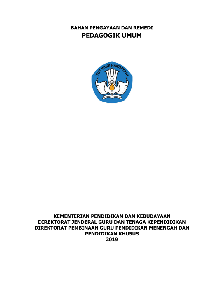 BAHAN PENGAYAAN DAN REMEDI PEDAGOGIK UMUM KEMENTERIAN PENDIDIKAN DAN KEBUDAYAAN DIREKTORAT JENDERAL GURU DAN TENAGA KEPENDIDIKAN DIREKTORAT PEMBINAAN GURU PENDIDIKAN MENENGAH DAN PENDIDIKAN KHUSUS 2019 KATA PENGANTAR Indonesia, sebagai sebuah negara kepulauan yang mempunyai wilayah geografis sangat luas dan beragam, memiliki tantangan tersendiri terkait upaya peningkatan kualitas guru. Guru merupakan garda terdepan dalam sebuah sistem pendidikan. Betapapun canggih konsep pendidikan dirancang, tanpa diimbangi oleh guru yang kompeten, maka hanya akan menjadi wacana tanpa realisasi yang optimal. Dengan kata lain kualitas guru merupakan kunci utama kualitas pendidikan. Sampai saat ini masih banyak wilayah di Indonesia yang memiliki keterbatasan akses. Wilayah seperti ini seringkali disebut sebagai daerah khusus. Keterbatasan ini berimbas pada proses peningkatan kualitas guru yang bertugas pada wilayah tersebut. Minimnya jaringan komunikasi dan beratnya jarak tempuh menjadikan para guru daerah khusus (gurdasus) relatif sulit untuk mengikuti perkembangan pendidikan sebagai upaya meningkatkan profesionalitasnya. Persoalan ini menjadi semakin nyata tatkala fakta menunjukkan bahwa banyak gurdasus tidak mampu melampaui passing grade yang dicanangkan dalam uji pengetahuan (UP) yang merupakan bagian dari Uji Kompetensi Mahasiswa Pengembangan Profesi Guru (UKMPPG) sebagai prasyarat uji profesionalitasinya. Hal ini bukanlah persoalan yang sederhana, karena kelulusan dalam UP UKMPPG merupakan salah satu indikator guru dikatakan profesional. Oleh karena itu, pemerintah melalui Direktorat Jenderal Guru dan Tenaga Kependidikan (GTK), Kementerian Pendidikan dan Kebudayaan (Kemendikbud) telah melakukan berbagai upaya untuk meningkatkan profesionalitas gurdasus. Salah satu langkah yang ditempuh pemerintah adalah melakukan pembuatan sumber belajar bagi gurdasus dalam bentuk “Bahan Pengayaan dan Remedi”. Produk ini akan dicetak dalam bentuk buku dan dibagikan bagi semua gurdasus yang belum lulus UP UKMPPG. Melalui buku ini diharapkan guru dapat berproses secara mandiri maupun terbimbing untuk meningkatkan profesionalitasnya. Lebih jauh, melalui sumber belajar buku “Bahan Pengayaan dan Remedi” ini—guru diharapkan akan terpicu untuk terus belajar dalam usaha meningkatkan kemampuan dan profesionalitasnya. Selanjutnya, buku ini pastinya mempunyai keterbatasan mengingat luasnya cakupan keilmuan yang seharusnya dimasukkan. Pendekatan pelatihan yang dikemas dalam buku ini berbasis pada kisi-kisi soal UP. Buku “Bahan Pengayaan dan Remedi” dilengkapi dengan dua jilid buku pendamping yang berisikan soal-soal latihan sebagai pengayaan tambahan. Diharapkan, guru tidak hanya menggunakan satu sumber buku ini tetapi dapat mengakses berbagai sumber-sumber pendukung lainnya. Dengan demikian diharapkan kompetensi guru akan meningkat yang pada akhirnya akan berimbas pada peningkatan kualitas pendidikan sebagai pendukung laju proses pembangunan bangsa. Tidak lupa, kami ucapkan banyak terima kasih kepada semua pihak yang terlibat dalam penyusunan buku ini. Semua kerja keras dan sumbangsih dari berbagai pihak dalam penyelesaian buku ini merupakan bentuk kesadaran bersama bahwa peningkatan kualitas di daerah-daerah khusus merupakan salah satu kunci pembangunan bangsa secara keseluruhan. Jakarta, Maret 2019 Direktur Jenderal GTK, Supriano NIP 196208161991031001 DAFTAR ISI KATA PENGANTAR .......................................................................................................ii DAFTAR ISI ................................................................................................................ iii BAB I PENDAHULUAN................................................................................................. 1 A. RASIONAL ........................................................................................................ 1 B. TUJUAN PENULISAN.......................................................................................... 2 C. CARA PENGGUNAAN BAHAN PENGAYAAN DAN REMEDI ....................................... 2 BAB II ........................................................................................................................ 3 KISI-KISI (KOMPETENSI, CAPAIAN PEMBELAJARAN, INDIKATOR ESSENSIAL, CONTOH SOAL DAN PEMBAHASAN) PEDAGOGIK UMUM .............................................................. 3 BAB III .....................................................................................................................25 SOAL-SOAL LATIHAN FORMATIF .................................................................................25 A. Soal-Soal Formatif ............................................................................................25 B. Umpan Balik ....................................................................................................31 BAB IV ......................................................................................................................32 PENUTUP ..................................................................................................................32 DAFTAR REFERENSI ...................................................................................................33 KUNCI JAWABAN SOAL-SOAL LATIHAN .......................................................................35 Bahan Pengayaan dan Remedi, Program PGDK Kemdikbud 2019 iii BAB I PENDAHULUAN A. RASIONAL Undang Undang No 14 Tahun 2005 tentang Guru dan Dosen, Pasal 8 menyatakan bahwa guru wajib memiliki kualifikasi akademik, kompetensi, sertifikat pendidik, sehat jasmani dan rohani, serta mampu mewujudkan tujuan pendidikan nasional. Hal ini berlaku pula untuk Guru daerah khusus (Gurdasus), bahwa di samping harus memenuhi kualifikasi S1/DIV, juga harus memiliki sertifikat pendidik yang diperoleh melalui PPG. Gurdasus yang telah mengabdi di daerah khusus umumnya memiliki kendala dalam meningkatkan kompetensi dan keprofesionalannya yang diperoleh melalui program PP