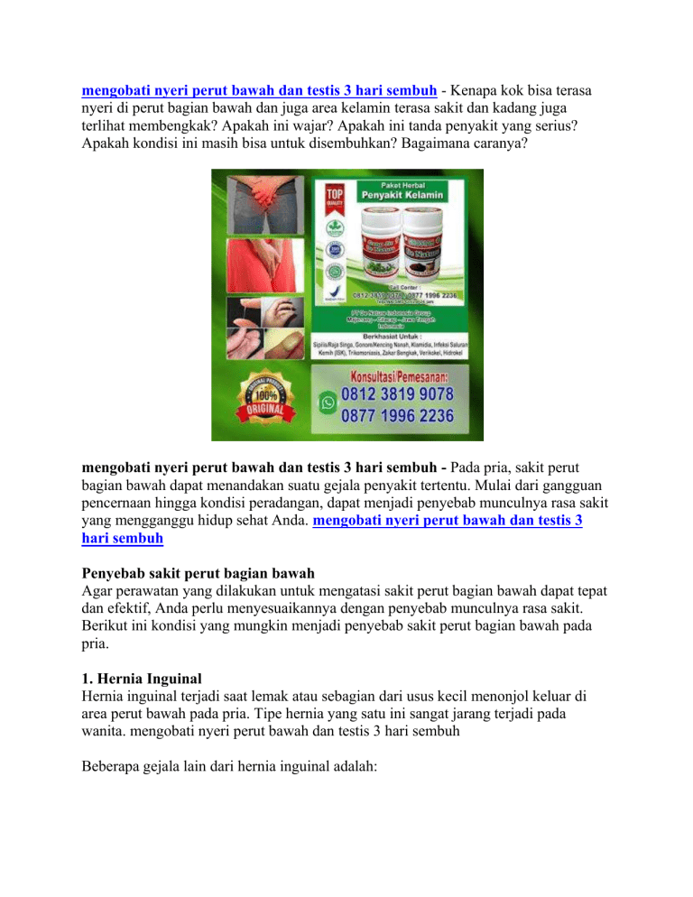 mengobati nyeri perut bawah dan testis 3 hari sembuh - Kenapa kok bisa terasa nyeri di perut bagian bawah dan juga area kelamin terasa sakit dan kadang juga terlihat membengkak? Apakah ini wajar? Apakah ini tanda penyakit yang serius? Apakah kondisi ini masih bisa untuk disembuhkan? Bagaimana caranya? mengobati nyeri perut bawah dan testis 3 hari sembuh - Pada pria, sakit perut bagian bawah dapat menandakan suatu gejala penyakit tertentu. Mulai dari gangguan pencernaan hingga kondisi peradangan, dapat menjadi penyebab munculnya rasa sakit yang mengganggu hidup sehat Anda. mengobati nyeri perut bawah dan testis 3 hari sembuh Penyebab sakit perut bagian bawah Agar perawatan yang dilakukan untuk mengatasi sakit perut bagian bawah dapat tepat dan efektif, Anda perlu menyesuaikannya dengan penyebab munculnya rasa sakit. Berikut ini kondisi yang mungkin menjadi penyebab sakit perut bagian bawah pada pria. 1. Hernia Inguinal Hernia inguinal terjadi saat lemak atau sebagian dari usus kecil menonjol keluar di area perut bawah pada pria. Tipe hernia yang satu ini sangat jarang terjadi pada wanita. mengobati nyeri perut bawah dan testis 3 hari sembuh Beberapa gejala lain dari hernia inguinal adalah: Munculnya benjolan kecil di pangkal paha yang dapat semakin membesar seiring berjalannya waktu, dan benjolan ini akan menghilang saat Anda berada pada posisi berbaring. Rasa sakit di pangkal paha semakin terasa saat Anda batuk, mengangkat barang berat, mengejan, atau berolahraga. Pembengkakan pada skrotum Hernia ini dapat menyebabkan masalah serius, seperti sumbatan pada usus. Segera konsultasikan dengan dokter apabila Anda mengalami gejala-gejala di bawah ini: Benjolan terlihat kemerahan dan memar Rasa sakit timbul secara tiba-tiba dan terus bertambah parah Sulit buang angin atau buang air Mual dan muntah Demam 2. Torsio Testis Sakit perut bagian bawah pada lelaki juga dapat disebabkan oleh torsio testis. Pada kondisi ini, testikel mengalami rotasi atau perputaran. Hal ini mengakibatkan terhambatnya aliran darah pada testis, dan menyebabkan rasa sakit serta pembengkakan. Hingga saat ini, penyebab dari kondisi ini belum diketahui secara jelas. Rotasi pada testikel dapat terjadi pada semua usia. Namun, hal lebih umum terjadi pada remaja pria berusia 12 hingga 16 tahun. Gejala lain yang dapat menyertai kondisi ini antara lain: Rasa nyeri secara tiba-tiba yang disertai dengan pembengkakan pada skrotum Mual dan muntah Demam Nyeri saat buang air kecil Torsio testis merupakan penyakit yang serius. Karena menyerang organ reproduksi, kondisi ini dapat memengaruhi kesuburan pria. Segera hubungi dokter apabila Anda mengalami gejala di atas. mengobati nyeri perut bawah dan testis 3 hari sembuh 3. Radang Prostat Sakit perut bagian bawah lelaki juga dapat menjadi gejala dari prostatitis, atau radang prostat. Pria yang mengalami gangguan ini akan mengalami nyeri saat buang air kecil. Selain itu, gejala lain yang mungkin muncul di antaranya nyeri pada pangkal paha, area panggul atau kemaluan, dan kadang menyerupai gejala flu. Kondisi ini dapat dialami oleh pria di segala usia, meski lebih umum terjadi pada pria berusia di bawah 50 tahun. Tergantung dari jenis peradangan yang dialami, prostatitis dapat muncul secara tibatiba atau bertahap. Pada beberapa kasus, radang prostat dapat sembuh secara cepat dengan sendirinya, maupun melalui perawatan tertentu. Sementara pada kasus yang lain, prostatitis dapat bertahan hingga berbulan-bulan. 4. Usus Buntu Rasa sakit pada perut juga bisa disebabkan oleh usus buntu atau yang secara medis disebut sebagai apendisitis. Usus buntu adalah bagian kecil dari usus di bagian tubuh sebelah kanan. Sakit perut bagian bawah kanan, merupakan salah satu gejala dari usus buntu. Selain itu, kondisi ini juga dapat menimbulkan gejala seperti: Demam Kehilangan nafsu makan Mual dan muntah Pembengkakan di perut bagian bawah Jika Anda mengalami rasa nyeri hebat disertai gejala-gejala seperti di atas, maka berkonsultasilah dengan dokter segera. Apabila Anda didiagnosis menderita usus buntu, maka dokter dapat merekomendasikan operasi secepatnya. mengobati nyeri perut bawah dan testis 3 hari sembuh 5. Infeksi Saluran Kemih Infeksi saluran kemih terjadi akibat infeksi yang terjadi akibat adanya kontaminasi bakteri di saluran kemih. Saluran kemih merupakan suatu sistem pembuangan di tubuh terdiri dari uretra, kandung kemih, ureter, dan ginjal. Mengalami sakit perut bagian bawah merupakan gejala yang umum dialami oleh penderita penyakit ini. Selain terasa sakit penderitanya juga akan mengalami gejala lain, seperti: Merasakan sensasi seperti panas dan terbakar saat buang air kecil Sering ingin buang air kecil Terjadi perubahan warna dan bau dari urin Demam Nyeri seperti di tusuk-tusuk pada area tubuh lain seperti di punggung bawah Sakit perut bagian bawah, terkadang sulit dibedakan dengan nyeri panggul. Sehingga, untuk mengetahui penyebab kondisi yang Anda alami secara tepat, segera hubungi dokter. Jangan tunda untuk periksa saat gejala-gejala yang telah disebutkan di atas sudah mulai Anda rasakan. Semakin cepat perawatan dilakukan, hasilnya akan semakin baik. mengobati nyeri perut bawah dan testis 3 hari sembuh Penelusuran yang terkait dengan mengobati nyeri perut bawah dan testis 3 hari sembuh : obat nyeri testis di apotik, obat sakit perut bagian bawah tengah, sakit perut bagian bawah pada pria, sakit perut bagian bawah pusar, cara mengatasi sakit buah zakar sebelah kiri, mengapa perut bagian bawah terasa sakit dan pusing dan mual, sakit perut bagian bawah kiri, obat sakit perut seperti ditusuk Cara Alami Mengobati Buah Zakar Bengkak - Sakit Buah Zakar - Verikokel Hidrokel - Orchitis - Kencing Nanah/Gonore - ISK - Sipilis/Raja Singa Klamidia - Trikomoniasis Dan Penyakit Lainnya