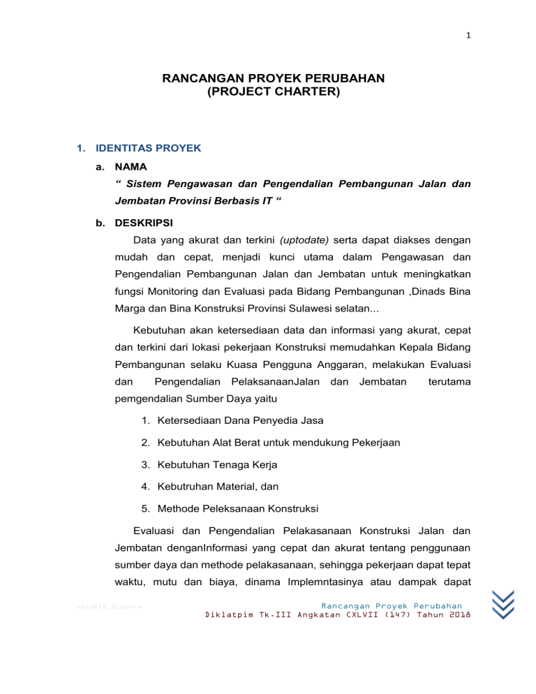 1 RANCANGAN PROYEK PERUBAHAN (PROJECT CHARTER) 1. IDENTITAS PROYEK a. NAMA “ Sistem Pengawasan dan Pengendalian Pembangunan Jalan dan Jembatan Provinsi Berbasis IT “ b. DESKRIPSI Data yang akurat dan terkini (uptodate) serta dapat diakses dengan mudah dan cepat, menjadi kunci utama dalam Pengawasan dan Pengendalian Pembangunan Jalan dan Jembatan untuk meningkatkan fungsi Monitoring dan Evaluasi pada Bidang Pembangunan ,Dinads Bina Marga dan Bina Konstruksi Provinsi Sulawesi selatan... Kebutuhan akan ketersediaan data dan informasi yang akurat, cepat dan terkini dari lokasi pekerjaan Konstruksi memudahkan Kepala Bidang Pembangunan selaku Kuasa Pengguna Anggaran, melakukan Evaluasi dan Pengendalian PelaksanaanJalan dan Jembatan terutama pemgendalian Sumber Daya yaitu 1. Ketersediaan Dana Penyedia Jasa 2. Kebutuhan Alat Berat untuk mendukung Pekerjaan 3. Kebutuhan Tenaga Kerja 4. Kebutruhan Material, dan 5. Methode Peleksanaan Konstruksi Evaluasi dan Pengendalian Pelakasanaan Konstruksi Jalan dan Jembatan denganInformasi yang cepat dan akurat tentang penggunaan sumber daya dan methode pelakasanaan, sehingga pekerjaan dapat tepat waktu, mutu dan biaya, dinama Implemntasinya atau dampak dapat ustakim_dispora Rancangan Proyek Perubahan Diklatpim Tk.III Angkatan CXLVII (147) Tahun 2018 2 mencengah terjadinya kegiatan konstruksi yang progres fisiknya menjadi terlambat, SILPA atau PUTUS KONTRAK sehingga penyerapan anggaran menjadi menjadi efektif dan tepat sasaran. c. SPONSOR Kepala Dinas Bina Marga dan Bina Konstruksi Provinsi Sulawesi selatan d. PROJECT LEADER Kepala Bidang Pembangunan, Dinas Bina Marga dan Bina Konstruksi Provinsi Sulawesi selatan. 2. LATAR BELAKANG (BURNING PLATFORM) Penyediaan Sarana dan prasarana yang berupa pembangunan Infrastruktur merupakan kegiatan andalan pemerintah Republik Indonesia di da;lam hal meningkatkan percepatan pertumbuhan ekonomi yang pada akhirnya akan berdampak pada kesejahteraan Masyarakat, Oleh sebab itu sebagian besar anggaran Pemerintah baik melalui APBN maupun melalui APBD di alokasikan untuk percepatan pembangunan Infrastruktur. Salah Satu Pembangunan Infrastruktur yang sangat penting untuk pertumbuhan ekonomi adalah Infrastruktur Jalan yang merupakan sarana transportasi yang dapat menghubungkan anatara satu kawasan dengan kawasan lainnya, untuk itu sungguh sangat penting adanya pembangunan jalan dalam pengembangan kehidupan berbangsa dan bernegara sebagai penunjang mobilitas masyarakat yang kian meningkat. Begitu pentingnya penyelenggaraan jalan sehingga Pemerintah mengeluarkan undang-undang nomor : 38 tahun 2006 tentang Jalan dan Peraturan Pemerintah nomor : 34 tahun 2006 tentang jalan, hal ini ditindak lanjuti dengan Surat Keputusan Gubernur Provinsi Sulawesiselatan Nomor : 2755/XII/Tahun 2015 tentang panjang ruas jalan dan jembatan Pemerintah ustakim_dispora yang menjadi tanggung jawab atau kewenangan Provinsi Sulawesi-Selatan yaitu sepanjang 1.500,15 Km Rancangan Proyek Perubahan Diklatpim Tk.III Angkatan CXLVII (147) Tahun 2018 3 dan panjang Jembatan 6.963 meter atau 597 buah jembatan, untuk Pembangunannya atau Peningkatan serta Pemeliharaannya.. Sesuai dengan visi Dinas Bina Marga dan Bina Konstruksi Provinsi Sulawesi-selatan BERKUALITAS “TERWUJUDNYA INFRASTRUKTUR JALAN YANG SEBAGAI PILAR AKSELERASI PEMBANGUNAN DAERAH” kondisi Jalan Provinsi saat ini pada umumnya hampir mencapai mantap, hanya saja ada beberapa segmen ruas jalan yang masih dalam kondisi rusak ringan sampai rusak berat / tidak mantap, dengan beragamnya kondisi jalan yang seperti itu serta memperhitungkan keterbatasan anggaran maka diperlukan Sistem Penyelenggaraan Pembangunan Jalan dan Jembatan yang tepat dan efektif. Alokasi penganggaran pelaksanaan pembangunan jalan dan Jembatan Provinsi disesuaikan dengan tingkat kerusakan suatu ruas jalan dengan melihat skala prioritas, sehingga pemanfaatan anggaran seefektif mungkin tetapi tujuan serta sasaran pembangunan tercapai, untuk itu pembagunan kontruksi jalan dan jembatan harus tepat waktu, mutu dan biaya, implementasinya diperlukan pengawasan dan pengendalian, terutama pengendalian Sumber Daya yang digunakan, dan methode pelaksanaan Konstriksi yang tepat . Fisik pekerjaan pembangunan jalan dan jembatan yang terlambat, atau menjadi SILPA, bahkan putus kontrak, mempengaruhi penyerapan anggaran pada Dinas Bina Marga dan Bina Konstruksi Provinsi Sulawesi sealatan, bahkan mempengaruhi penyerpan anggaran Pemerintah Provinsi Sulawesi selatan Gambaran penyerapan Anggaran dan Realisasi Pembangunan jalan dan yang selesai dikerjakan pada Dinas Bina Marga dan Bina Konstruksi 5 (lima) tahun terakhir dapat digambarkan pada tabel berikut ; ustakim_dispora Rancangan Proyek Perubahan Diklatpim Tk.III Angkatan CXLVII (147) Tahun 2018 4 Tabel : Data Nilai Kontrak dan Penyerapan Anggaran Tahun Nilai Anggaran Pembangunan Jalan Pembangunan anggaran (Rp) x 1000 (Km) Jembatan (mater) Kontrak Penyerapan Target Realisasi Target Realisasi 2013 198.737.321 175.194.907 57,46 55,91 471 330 2014 213.565.255 167.732.235 57,44 44,52 571 325 2015 289.806.435 276.087.253 56,82 51,30 232 152 2016 327.255.987 315.945.436 67,84 65,64 168 79 2017 110.730.651 105.211.398 20,80 19,80 125 45 Sumber Data : Bid Pemb.Dinas BMBK Penyerapan anggaran dan relaisasi pembangunan jalan dan jembatan yang tidak sesuai dengan target diakibatkan oleh adanya keterlambatan penyelesaian pekerjaan dan paket yang putus kontrak, seperti yang digambarkan pada tabel berikut ini : Tabel : Data Pembangunan Jalan dan Jembatan KONDISI PEMBANGUNAN JALAN DAN JEMBATAN TIAP TAHUN TAHUN ANGGARAN JALAN JUMLAH SILPA PAKET JEMBATAN PUTUS JUMLAH KONTRAK PAKET SILPA PUTUS KONTRAK 2013 27 1 - 16 9 - 2014 25 4 2 19 4 - 2015 37 4 - 10 1 1 2016 22 1 - 8 2 - 2017 14 1 - 8 - 1 Sumber Data : Bid Pemb.Dinas BMBK Hal tersebut sebenarnya tidak perlu terjadi, jika laporan harian, mingguan dan bulan dari lokasi kegiatan konstruksi cepat terdeksi, ini yang menjadi masalah karena sering laporan harian disampaika