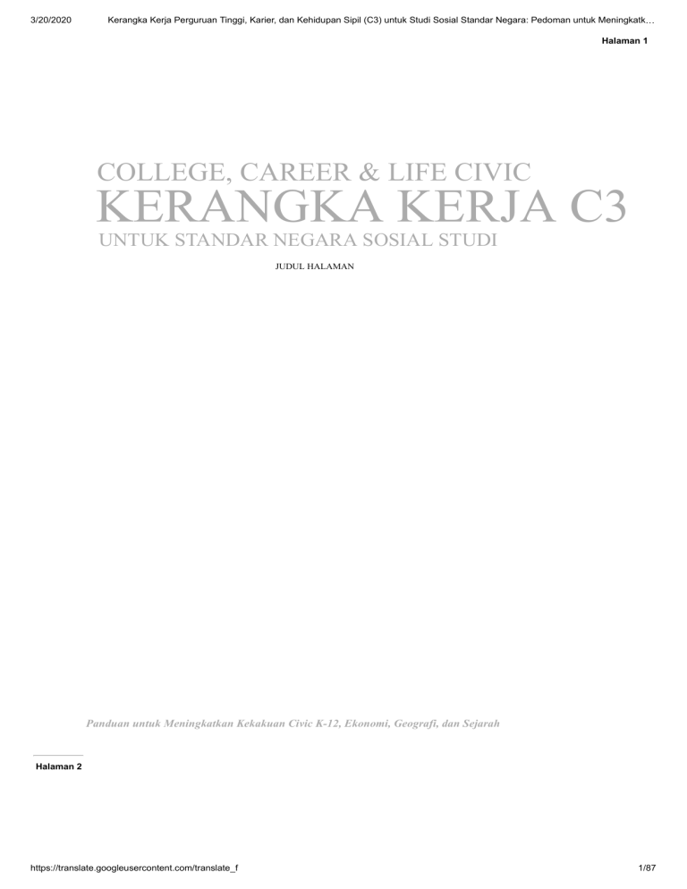 3/20/2020 Kerangka Kerja Perguruan Tinggi, Karier, dan Kehidupan Sipil (C3) untuk Studi Sosial Standar Negara: Pedoman untuk Meningkatk… Halaman 1 COLLEGE, CAREER & LIFE CIVIC KERANGKA KERJA C3 UNTUK STANDAR NEGARA SOSIAL STUDI JUDUL HALAMAN Panduan untuk Meningkatkan Kekakuan Civic K-12, Ekonomi, Geografi, dan Sejarah Halaman 2 https://translate.googleusercontent.com/translate_f 1/87 3/20/2020 Kerangka Kerja Perguruan Tinggi, Karier, dan Kehidupan Sipil (C3) untuk Studi Sosial Standar Negara: Pedoman untuk Meningkatk… Kerangka Kerja Perguruan Tinggi, Karier, dan Kehidupan Sipil (C3) untuk Standar-Standar Negara Studi Sosial: Panduan untuk Meningkatkan Ketegaran Kewarganegaraan K-12, Ekonomi, Geografi, dan Sejarah adalah produk kolaborasi antara lima belas organisasi profesional berikut berkomitmen untuk memajukan pendidikan studi sosial: American Bar Association Asosiasi Sejarah Amerika Asosiasi Ahli Geografi Amerika Kampanye untuk Misi Sipil Sekolah Pusat Pendidikan Kewarganegaraan Yayasan Hak Konstitusional Chicago Yayasan Hak Konstitusional AS Dewan Pendidikan Ekonomi Dewan Nasional untuk Pendidikan Geografis Dewan Nasional untuk Pendidikan Sejarah Dewan Nasional untuk Studi Sosial Masyarakat Geografis Nasional Hari Sejarah Nasional Street Law, Inc. Asosiasi Sejarah Dunia Penerbit dokumen adalah Dewan Nasional untuk Studi Sosial, Silver Spring, MD. Teks dokumen, dan / atau kutipan darinya, dapat diperbanyak secara bebas. Tidak ada perlu mendaftar ke Dewan Nasional untuk Studi Sosial untuk izin untuk mereproduksi teks atau kutipan. Halaman 3 Daftar Tabel ISI PENGANTAR Proses Pengembangan Kerangka Kerja Perguruan Tinggi, Karier, dan Kehidupan Sipil (C3) untuk Standar Negara Studi Sosial ............................................. .................................................. ....................... 7 Tim Kepemimpinan Kerangka C3 .............................................. .................................................. ....................... 7 Tim Penulisan ................................................ .................................................. .................................................. .... 8 Peserta Proyek .................................................... .................................................. ............................................ 9 C3 Framework Gugus Tugas Organisasi Profesi ........................................... ....................................... 9 Kerangka Kerja C3 Dewan Guru Kolaborasi ............................................. .................................................. 10 CARA MEMBACA KERANGKA KERJA C3 Keseluruhan Organisasi Dokumen ................................................... .................................................. ...................... 12 Arc Permintaan ................................................ .................................................. .................................................. ...... 12 Tinjauan Seni Bahasa Inggris / Literasi Koneksi Inti Umum ........................................ ............ 12 https://translate.googleusercontent.com/translate_f 2/87 3/20/2020 Kerangka Kerja Perguruan Tinggi, Karier, dan Kehidupan Sipil (C3) untuk Studi Sosial Standar Negara: Pedoman untuk Meningkatk… Dimensi dan Subbagian ............................................... .................................................. ........................... 12 Struktur Unik Dimensi 2 ............................................. .................................................. ....................... 12 Indikator Kerangka Kerja C3 dan Jalur K-12 .......................................... .................................................. ....... 13 Lampiran ..................................................... .................................................. .................................................. ... 13 Apa Yang Tidak Dicakup .................................................. .................................................. ......................................... 14 ARC PERTANYAAN DARI KERANGKA C3 Narasi Arc Permintaan Kerangka C3 ......................................... .................................................. 16 Tinjauan Umum tentang Koneksi dengan Seni Bahasa Inggris / Standar Umum Inti Seni Bahasa Inggris .............. 20 DIMENSI 1. Mengembangkan Pertanyaan dan Pertanyaan Perencanaan .......................................... ........................ 23 Seni Bahasa Inggris / Literasi Koneksi Inti Umum .......................................... .................... 26 DIMENSI 2. Menerapkan Konsep dan Alat Disiplin .............................................. ............................. 29 CIVICS ..................................................... .................................................. ................................................. 31 Lembaga Sipil dan Politik Partisipasi dan Musyawarah: Menerapkan Kebaikan Sipil dan Prinsip Demokratis Proses, Aturan, dan Hukum Kerangka C3 • 3 Halaman 4 EKONOMI ................................................. .................................................. ..................................... 35 Pengambilan Keputusan Ekonomi Pertukaran dan Pasar Ekonomi Nasional Ekonomi Global GEOGRAFI ................................................. .................................................. ..................................... 40 Representasi Geografis: Pandangan Spasial Dunia Interaksi Manusia-Lingkungan: Tempat, Wilayah, dan Budaya Populasi Manusia: Pola dan Pergerakan Spasial Interkoneksi Global: Mengubah Pola Spasial SEJARAH ................................................. .................................................. ............................................. 45 Ubah, Kontinuitas, dan Konteks Perspektif Sumber dan Bukti Historis Penyebab dan Argumentasi Seni Bahasa Inggris / Literasi Koneksi Inti Umum .......................................... .................... 50 DIME