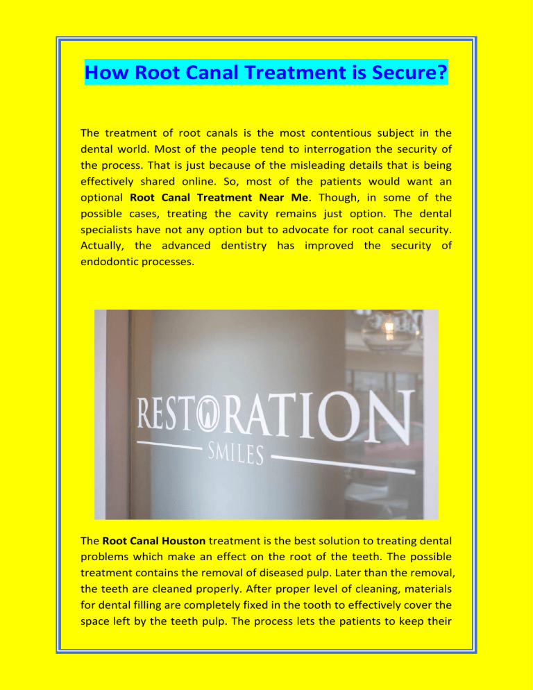How Root Canal Treatment is Secure? The treatment of root canals is the most contentious subject in the dental world. Most of the people tend to interrogation the security of the process. That is just because of the misleading details that is being effectively shared online. So, most of the patients would want an optional Root Canal Treatment Near Me. Though, in some of the possible cases, treating the cavity remains just option. The dental specialists have not any option but to advocate for root canal security. Actually, the advanced dentistry has improved the security of endodontic processes. The Root Canal Houston treatment is the best solution to treating dental problems which make an effect on the root of the teeth. The possible treatment contains the removal of diseased pulp. Later than the removal, the teeth are cleaned properly. After proper level of cleaning, materials for dental filling are completely fixed in the tooth to effectively cover the space left by the teeth pulp. The process lets the patients to keep their teeth in a good condition. On the other hand, the tooth is completely dead just because the living tissue was eliminated and you completed Cheap Root Canal Near Me. Clearly, it is a best suitable solution as it avoids teeth loss. The security of this treatment completely depends on how it is completely done. As per to different researches, the germ infections in the root canal are at complete. The Root Canal Doctor Near Me and researchers contend that in some cases, just 44% of the germs are eliminated. Therefore, the residual 56% of the germs will keep on causing harm to nearby teeth. That will conclude in serious ongoing dental issues. Here are some methods in which root canal from Root Canal Dentist Near Me can lead to more dental issues. Contaminations both outside and inside the pulp cavity Bad immune response because of pulp cavity filling Tissues irritation by accretion of cholesterol crystals Cystic cuts on the pretentious root Mark of curative tissue in the root canal part After the treatment performed by dentist near me, the remaining germ could lead to more infection if not controlled. So, the patients are assumed antibiotic care. The antibiotics suggested by affordable dental specialists have their own poor side effects. Clearly, the antibiotics prescribed by emergency dentist near me are not effective in the swelling and pain reduction. That proves they couldn’t be useful for patients that have experienced root canal process. To confirm high quality treatment, think about the following parts. Treatment Quality You have to confirm you are getting good quality Affordable Root Canal Near Me. Thus, don’t just select any dentists available in your nearby area. You can confirm their past achievements in providing effective level of treatment. Take some of your time and check the reviews shared by their earlier patients. These dentists that offered effective and quality treatment would have many positive reviews. Stay away from best dentists with some complaints from earlier customers.