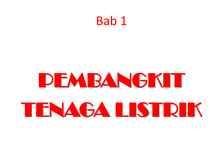 Bab 1 PEMBANGKIT TENAGA LISTRIK 150 kV 500 kV INDUSTRI 150 kV TRAFO STEP UP 20/500 kV 20 kV TRAFO GITET 500/150 kV PEMBANGKIT PLTA PLTD PLTP PLTG PLTU PLTGU BISNIS TRAFO GI 150/20 kV TRAFO DISTRIBUSI 220 V 220 V SOSIAL RUMAH PUBLIK FUNGSI PEMBANGKIT • Membangkitkan Energi Listrik dengan cara mengubah energi primer menjadi Energi Listrik • Komponen utama: – Generator – Turbin (Penggerak Mula) KLASIFIKASI PEMBANGKIT BERDASAR PROSES KONVERSI ENERGI • Thermis: melalui pemanasan suhu tinggi (PLTU, PLTG, PLTD, PLTP, PLTGU, PLTN) • Non Thermis: tanpa melalui pemanasan suhu tinggi (PLTA, PLTM, PLTB) KLASIFIKASI PEMBANGKIT BERDASAR JENIS ENERGI PRIMER • Fosil: menggunakan bahan bakar fosil (Minyak bumi, gas atau batu bara) (PLTU, PLTG, PLTGU, PLTD) • Non Fosil (Renewable Energy): menggunakan energi primer yang tidak habis pakai (PLTA, PLTM, PLTB, PLTS) PLTA CARA KERJA PLTA CARA KERJA PLTA PLTU PLTU PLTU PLTG PLTG PLTG PLTGU PLTGU PLTP PLTP PLTN PLTS CARA KERJA PLTA PLT SAMPAH