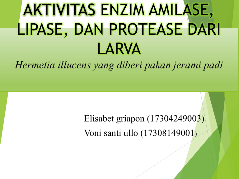 AKTIVITAS ENZIM AMILASE, LIPASE, DAN PROTEASE DARI LARVA Hermetia illucens yang diberi pakan jerami padi Elisabet griapon (17304249003) Voni santi ullo (17308149001) Latar belakang Kemampuan larva hermetia illucens untuk hidup dalam sampah organik membuka kemungkinan lain, yaitu potensi larva H. illucens untuk menghasilkan enzim amilase, lipase, dan protease. Larva H. illucens banyak ditemukan hidup di tumpukan sampah organik atau pada kotoran hewan ternak. Melihat fenomena tersebut, larva H. illucens diduga mengekskresikan senyawa kimia berupa enzim untuk menghidrolisis substrat yang digunakan sebagai pakannya. Berdasarkan hal tersebut maka dilakukan “Uji Aktivitas Enzim Amilase, Lipase, Dan Protease dari Ekstrak Usus Larva Hermetia illucens ” untuk mempelajari potensi larva H. illucens sebagai penghasil enzim amilase, lipase, dan protease serta pendegradasi limbah organik. Setiap enzim memiliki aktivitas maksimum pada suhu tertentu, aktivitas enzim akan semakin meningkat dengan bertambahnya suhu hingga suhu optimum tercapai. Setelah itu kenaikan suhu lebih lanjut akan menyebabkan aktivitas enzim menurun (Megiadari, 2009) Amilase dapat diperoleh dari berbagai sumber mikroorganisme, tanaman, dan hewan (Aiyer, 2005). Enzim protease mempunyai dua pengertian, yaitu proteinase yang mengkatalisis hidrolisis molekul protein menjadi fragmen-fragmen yang lebih sederhana, dan peptidase yang menhdirolisis fragmen polipeptida menjadi asam amino. Enzim proteoitik yang berasal dari mikroorganisme adalah protease yang mengandung proteinase dan peptidase (Frazier dan Westhoff, 1983) Enzim lipase adalah enzim yang bekerja untuk menghidrolisis lemak dan minyak. Berdasarkan fungsi fisiologisnya enzim lipase mempunyai peranan penting menghidrolisis lemak dan minyak menjadi asam lemak dan gliserol yang dibutuhkan dalam proses metabolisme. Enzim lipase ini dapat memecah ikatan ester pada lemak sehingga menjadi asam lemak dan gliserol (Poedjiadi dan Supriyanti, 2007). Oliver (2004) melaporkan bahwa larva H. illucens mengandung 42% protein. Sheppard dan Newton (1994) juga melaporkan hal yang serupa, bahwa kandungan protein yang tinggi pada larva lalat black soldier dapat digunakan sebagai pakan ternak atau ikan. Tujuan 1. Mengukur aktivitas enzim amilase, lipase, & protease yang di isolasi dari usus larva H. illucens 2. Mengetahui suhu optimum enzim amilase, lipase, dan protease yang di hasilkan dari ekstrak usus larva H. illucens Metode Bahan utama yang digunakan adalah larva H. illucens dari daerah cibiru bandung. Bahan kimia yang digunakan meliputi bahan proses ekstraksasi dan bahan kimia untuk uji aktivitas amilase, lipase, dan protease. Parameter yang di uji adalah suhu inkubasi pada lima taraf (30˚c, 35˚c, 40˚c, 45˚c, dan 50˚c). Sebanyak 200 ekor larva di beda pada bagian dorsal dengan membuat sayatan membujur dari kepala hingga anus, kemudian ususnya dipisahkan dan dan disimpan dalam pelarut buffer fosfat (PBS) Ph 7,2 dalam suhu 4˚c. Usus larva divorteks selama ± 1 menit, kemudian di disentrifugasi dengan kecepatan 14.000 rpm selama 10 menit supernatan diambil dengan mikropipet 1 ml yang digunakan sebagai ekstrak enzim kasar untuk dil akukan uji aktivitas enzim amilase, lipase, dan protease. Uji Aktivitas Amilase Sebelum uji aktivitas amilase dilakukan, terlebih dahulu membuat kurva standar glukosa. Larutan glukosa 1000 ߤg/ml sebanyak 100 ml, diencerkan menjadi berbagai konsentrasi dari 100-600 ߤg/ml. Tiap konsentrasi dimasukkan kedalam tabung reaksi masing-Masing 1 ml kemudian ditambahkan reagen DNS 1,5 ml dan diinkubasi pada suhu 37°C selama 5 menit, lalu didinginkan dengan air mengalir, kemudian dilakukan pengukuran absorbansi dengan menggunakan spetrofotometer pada panjang gelombang 540 nm. Uji amilase dilakukan dengan menambahkan amilum 1% sebanyak 1 ml pada ekstrak enzim kasar sebanyak 1 ml, kemudian diinkubasi pada variasi suhu 30°C, 35°C, 40°C, 45°C, dan 50°C selama 10 menit. Aktivitas enzim dihentikan dengan menambahkan 2 ml DNS, kemdian diinkubasi pada suhu 37°C selama 5 menit. Uji Aktivitas Lipase Konsenrasi yang digunakan adalah konesntrasi 31,68 ; 63,38 ; 95,04 ; 126,72 ; 158,84 (x 10-2M). Variasi konsentrasi tersebut dibuat dengan menggunakan larutan standar asam oleat 3,168 M, larutan tersebut diambil sebannyak 1; 2; 3; 4; 5 mL lalu dincerkan dengan Heksana sampai 10 mL. Campuran selanjutnya diambil 4 mL dan ditambahkan reagen tembaga (II) asetat 1 mL diaduk 1 menit. Pengukuran dilakukan dengan menggunakan spektrofotomter pada panjang gelombang 715 nm. Penentuan aktivitas lipase dilakukan dengan menggunakan metode Kwon dan Rhee, yaitu substrat yang digunakan dalam metode ini adalah minyak zaitun. minyak zaitun sebanyak 1 mL, ditambahkan dengan 1 mL buffer fosfat pH 7,2 dan 1 mL larutan enzim Campuran ini di vortes selama 10 meint dan selanjutnya diinkubasi pada waterbath selama 20 menit. Selanjutnya campuran ditambahkan larutan 1 mL HCl 6N dan 5 mL heksana . Campuran selanjutnya dikocok kuat dengan menggunakan voteks tube dan lapisan atas diambil sebanyak 4 mL, kemudian ditambahkan 1 mL reagen tembaga (II) asetat dan diaduk 1 menit Campuran diukur dengan spektrofotometer pada panjang gelombang 715 nm. Aktivitaslipase diukur pada suhu inkubasi yang bervariasi yaitu 30°C, 35°C, 40°C, 45°C, dan 50°C dengan menggunakan inkubator, dan masing-masing variasi diperlakukan sama seperti penentuan aktivitas yang sebelumnya Uji Aktivitas Protease Aktivitas protease dilakukan berdasarkan metode Bergmeyer (Sebanyak 1 mL larutan 2% kasein dicampur) pH 8,0, 0,20 mL asam khlorida 0,05 M dan 0,20 mL ekstrak enzim protease (ekstrak usus larva Hermetia illucens) yang akan ditetapkan aktivitasnya. Kemudian diinkubasi pada watterbathdengan variasi suhu dengan 1 mL buffer borat (0,01 yang ditetapkan yaitu : yaitu 30°C, 35°C, 40°C, 45°C, dan 50°C selama 10 menit lalu ditambahkan 2 mL asam trikhloroasetat (TCA) 0,1 M,kemudian diinkubasi selama 10 menit lalu lakukan sentrifugasi Bagia