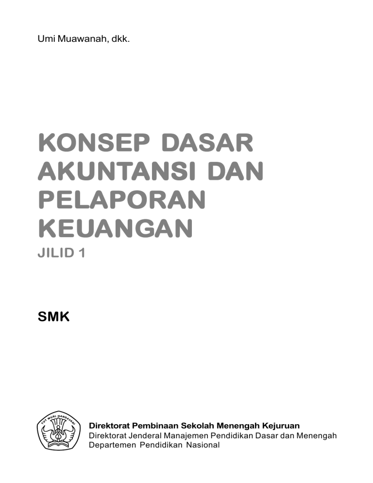 Umi Muawanah, dkk. KONSEP DASAR AKUNTANSI DAN PELAPORAN KEUANGAN JILID 1 U T W UR I HAND AY A N I T SMK Direktorat Pembinaan Sekolah Menengah Kejuruan Direktorat Jenderal Manajemen Pendidikan Dasar dan Menengah Departemen Pendidikan Nasional Hak Cipta pada Departemen Pendidikan Nasional Dilindungi Undang-undang KONSEP D ASAR DASAR AKUNT ANSI D AN AKUNTANSI DAN PEL APORAN PELAPORAN KEU ANG AN KEUANG ANGAN JILID 1 Untuk SMK Penulis : Umi Muawanah Fahmi Poernawati Perancang Kulit : TIM Ukuran Buku : 17,6 × 25 cm MUA k MUAWANAH, Umi Konsep Dasar Akuntansi dan Pelaporan Keuangan Jilid 1 untuk SMK/ oleh Umi Muawanah, Fahmi Poernawati ------ Jakarta: Direktorat Pembinaan Sekolah Menengah Kejuruan, Direktorat Jenderal Manajemen Pendidikan Dasar dan Menengah, Departemen Pendidikan Nasional, 2008. x, 266 hlm Daftar Pustaka : hlm 261 Daftar Istilah : hlm 263–265 ISBN : 978-602-8320-51-1 978-602-8320-52-8 Diterbitkan oleh Direktorat Pembinaan Sekolah Menengah Kejuruan Direktorat Jenderal Manajemen Pendidikan Dasar dan Menengah Departemen Pendidikan Nasional Tahun 2008 Dicetak oleh: PT MACANAN JAYA CEMERLANG Jalan Ki Hajar Dewantoro Klaten Utara, Klaten 57438, PO Box 181 Telp. (0272) 322440, Fax. (0272) 322603 E-mail: [email protected] KATA SAMBUTAN Puji syukur kami panjatkan kehadirat Allah SWT, berkat rahmat dan karunia Nya, Pemerintah, dalam hal ini, Direktorat Pembinaan Sekolah Menengah Kejuruan Direktorat Jenderal Manajemen Pendidikan Dasar dan Menengah Departemen Pendidikan Nasional, telah melaksanakan kegiatan penulisan buku kejuruan sebagai bentuk dari kegiatan pembelian hak cipta buku teks pelajaran kejuruan bagi siswa SMK. Karena buku-buku pelajaran kejuruan sangat sulit didapatkan di pasaran. Buku teks pelajaran ini telah melalui proses penilaian oleh Badan Standar Nasional Pendidikan sebagai buku teks pelajaran untuk SMK dan telah dinyatakan memenuhi syarat kelayakan untuk digunakan dalam proses pembelajaran melalui Peraturan Menteri Pendidikan Nasional Nomor 45 Tahun 2008 tanggal 15 Agustus 2008. Kami menyampaikan penghargaan yang setinggi-tingginya kepada seluruh penulis yang telah berkenan mengalihkan hak cipta karyanya kepada Departemen Pendidikan Nasional untuk digunakan secara luas oleh para pendidik dan peserta didik SMK. Buku teks pelajaran yang telah dialihkan hak ciptanya kepada Departemen Pendidikan Nasional ini, dapat diunduh (download), digandakan, dicetak, dialihmediakan, atau difotokopi oleh masyarakat. Namun untuk penggandaan yang bersifat komersial harga penjualannya harus memenuhi ketentuan yang ditetapkan oleh Pemerintah. Dengan ditayangkan soft copy ini diharapkan akan lebih memudahkan bagi masyarakat khususnya para pendidik dan peserta didik SMK di seluruh Indonesia maupun sekolah Indonesia yang berada di luar negeri untuk mengakses dan memanfaatkannya sebagai sumber belajar. Kami berharap, semua pihak dapat mendukung kebijakan ini. Kepada para peserta didik kami ucapkan selamat belajar dan semoga dapat memanfaatkan buku ini sebaik-baiknya. Kami menyadari bahwa buku ini masih perlu ditingkatkan mutunya. Oleh karena itu, saran dan kritik sangat kami harapkan. Jakarta, 17 Agustus 2008 Direktur Pembinaan SMK iii iv KATA PENGANTAR P uji syukur kehadirat Allah SWT penulis panjatkan atas dapat diselesaikannya penulisan buku akuntansi ini. Buku ini merupa-kan buku pelajaran akuntansi yang berisi tentang materi pelajaran akuntansi tingkat dasar yang dirancang untuk para siswa Sekolah Menengah Kejuruan (SMK) program keahlian Akuntansi. Namun demikian, buku ini tidak menutup kemungkinan digunakan pula oleh para siswa Sekolah Menengah Atas (SMA) jurusan Ilmu Pengetahuan Sosial (IPS) atau pihak lain atau pemula yang berminat untuk memahami akuntansi. Karena penulis berharap bahwa buku ini bisa digunakan oleh berbagai pihak, maka penyampaian materi dalam buku inipun disusun secara sederhana. Dan dalam menyusun buku ini, penulis beranggapan bahwa para pembaca belum pernah mempelajari akuntansi. Tujuan ditulisnya buku ini untuk: (1) menjelaskan kepada para pembaca tentang pengertian akuntansi, (2) memberikan pemahaman tentang siklus akuntansi dalam kaitannya untuk menyusun laporan keuangan perusahaan, (3) memberikan penjelasan tentang pengertian umum laporan keuangan yang dapat digunakan oleh para pengambil keputusan baik perusahaan maupun dalam kehidupan sehari-hari untuk dasar pengambilan keputusan keuangan, (4) menjelaskan tentang konsep-konsep yang mendasari perlakuan akuntansi atas suatu transaksi, (5) memberikan pengetahuan dasar yang kuat bagi para pembaca yang akan mempelajari akuntansi di tingkat lanjutan serta di bidang bisnis dan keuangan, dan (6) memberikan landasan yang kuat bagi para pembaca yang ingin mengembangkan karirnya di bidang akuntansi, bisnis dan keuangan. Karena begitu kompleks dan banyaknya topik yang akan dibahas dalam buku ini, materi yang disajikan dalam buku ini disesuaikan dengan kurikulum yang berlaku di Sekolah Menengah Kejuruan (SMK) program keahlian Akuntansi. Penyajian buku ini terbagi kedalam 3 (tiga) bagian, yaitu buku ke 1 (satu) akan menjelaskan siklus akuntansi secara umum dan praktik siklus akuntansi pada perusahaan jasa, buku ke 2 (dua) berisi tentang akuntansi pada perusahaan dagang. Pembahasan pada buku 1 (satu) dan buku 2 (dua) menitik beratkan pada perusahaan perorangan, sedangkan buku ke 3 (tiga) menjelaskan tentang konsep dasar akuntansi, yakni konsep yang mendasari perlakuan akuntansi atas suatu transaksi. v Pemahaman tentang proses akuntansi yang terangkai dalam siklus akuntansi merupakan prasyarat untuk mempelajari masalah-masalah lain dalam bidang akuntansi. Pada buku satu, penulis sengaja memilih perusahaan jasa untuk menerapkan proses kegiatan dalam siklus akuntansi, karena transaksitransaksi perusahaan jasa perorangan relatif sederhana dibandingkan dengan jenis perusahaan yang lainnya. Dengan demikian diharapkan bahwa pembaca akan lebih mudah memahami tahapan-tahapan kegiatan mulai dari pencatatan transaksi hingga menjadi se