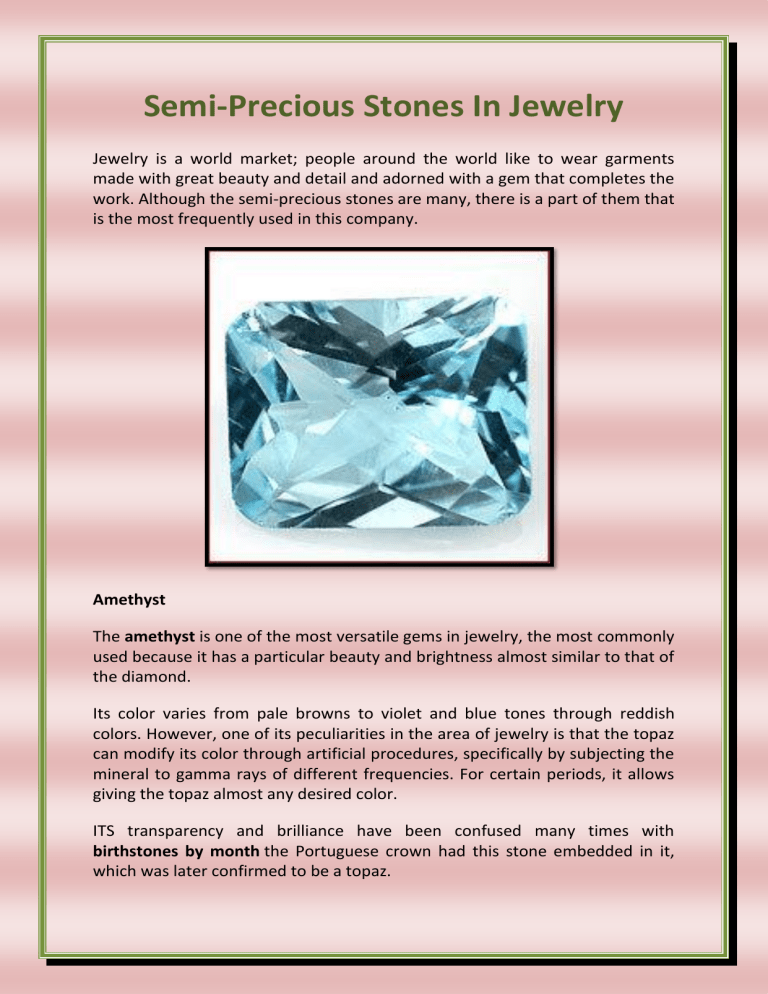 Semi-Precious Stones In Jewelry Jewelry is a world market; people around the world like to wear garments made with great beauty and detail and adorned with a gem that completes the work. Although the semi-precious stones are many, there is a part of them that is the most frequently used in this company. Amethyst The amethyst is one of the most versatile gems in jewelry, the most commonly used because it has a particular beauty and brightness almost similar to that of the diamond. Its color varies from pale browns to violet and blue tones through reddish colors. However, one of its peculiarities in the area of jewelry is that the topaz can modify its color through artificial procedures, specifically by subjecting the mineral to gamma rays of different frequencies. For certain periods, it allows giving the topaz almost any desired color. ITS transparency and brilliance have been confused many times with birthstones by month the Portuguese crown had this stone embedded in it, which was later confirmed to be a topaz. Moissanite The moissanite is a special stone among many stones classified as semiprecious, and one of the things that makes them most valuable is the beauty of its colors, especially the red ones. Its beauty, at first glance, is capable of surpassing even that of precious stones such as ruby. It is only under ultraviolet light and other scientific procedures that the difference between citrine and spinel can be seen. This stone is widely used and highly valued in jewelry, garments made with this stone are usually very valuable, however within the range of what is accessible to the public. Alexandrite The alexandrite is a stone with many varieties. However, the most valued in jewelry is noble opal, a kind of opal characterized by the different colors that can be seen in it, very intense colors in the form of lamellae within the gem that can be seen while the opal is moving. The tourmaline has a captivating beauty, beyond the fact that they are not as shiny or crystalline as other gems, their use was also frequently established for the jewelry of royalty and important personalities of the Middle Ages. This mineral also has mysticism, which relates it to deities and to spiritual and healing powers that make it even more special. The birthstone colors, for example, is one of the most valuable, both for its beauty and rarity and for what it represents; some acquire jewelry with opals as a kind of talisman or amulet. Aquamarine This stone has a particular beauty associated with its color and crystallinity. These characteristics are what mainly makes them valuable in the world of jewelry. Some of the garnet gems, after being polished and worked, have such a beauty that it has come to be compared to the emerald. The Pearl The pearl is a different gem from the others, and this is because its origin, unlike most, is not due to geological processes that involve high temperatures or extreme pressures; but it has an animal origin. Pearls have been used since ancient times for the manufacture of jewelry, more specifically to create pearl necklaces, which came to be widely used by women who were part of the world's royal families, aristocrats of the time. Tanzanite necklaces are highly valued and expensive in jewelry, to the point that they are not accessible to all social strata.