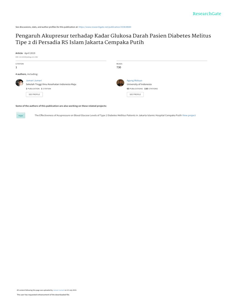 See discussions, stats, and author profiles for this publication at: https://www.researchgate.net/publication/333638684 Pengaruh Akupresur terhadap Kadar Glukosa Darah Pasien Diabetes Melitus Tipe 2 di Persadia RS Islam Jakarta Cempaka Putih Article · April 2019 DOI: 10.31539/joting.v1i1.536 CITATION READS 1 730 4 authors, including: Jumari Jumari Agung Waluyo Sekolah Tinggi Ilmu Kesehatan Indonesia Maju University of Indonesia 1 PUBLICATION 1 CITATION 63 PUBLICATIONS 116 CITATIONS SEE PROFILE SEE PROFILE Some of the authors of this publication are also working on these related projects: The Effectiveness of Acupressure on Blood Glucose Levels of Type 2 Diabetes Mellitus Patients in Jakarta Islamic Hospital Cempaka Putih View project All content following this page was uploaded by Jumari Jumari on 15 July 2019. The user has requested enhancement of the downloaded file. Journal of Telenursing (JOTING) Volume 1, Nomor 1, Juni 2019 e-ISSN : 2684-8988 p-ISSN : 2684-8996 DOI: https://doi.org/10.31539/joting.v1i1.536 PENGARUH AKUPRESUR TERHADAP KADAR GLUKOSA DARAH PASIEN DIABETES MELITUS TIPE 2 Jumari1, Agung Waluyo2, Wati Jumaiyah3, Dhea Natashia4 Program Studi Ilmu Keperawatan, Sekolah Tinggi Ilmu Kesehatan Indonesia Maju1 Fakultas Ilmu Keperawatan, Universitas Indonesia2 Program Studi Magister Keperawatan, Universitas Muhammadiyah Jakarta3,4 E-mail: [email protected] ABSTRAK Penelitian ini bertujuan untuk mengidentifikasi pengaruh akupresur terhadap kadar glukosa darah pada pasien diabetes melitus tipe 2. Penelitian ini menggunakan quasiexperimental design dengan pendekatan pre-post test design pada 32 responden. Mereka dibagi menjadi kelompok intervensi (n = 16) dan kelompok kontrol (n = 16). Pengujian perbedaan rata-rata kadar glukosa darah pada kelompok intervensi dan kontrol menggunakan uji paired t test. Hasil penelitian menunjukkan perbedaan yang signifikan dalam kadar glukosa darah antara kelompok intervensi dan kelompok kontrol (t = 4,22; p = 0,001). Akupresur merupakan intervensi yang efektif untuk menurunkan kadar glukosa darah pada pasien diabetes melitus tipe 2. Akupresur dapat direkomendasikan sebagai salah satu terapi komplementer mandiri dalam pelayanan asuhan keperawatan pada pasien diabetes melitus tipe 2. Kata kunci: Akupresur, Diabetes Melitus Tipe 2, Kadar Glukosa Darah. ABSTRACT However limited study had examined the effect of acupressure to reduce blood glucose levels in patients with type 2 diabetes mellitus. This quasi experimental trial was conducted to identify the effect of acupressure on blood glucose level in patients with type 2 diabetes mellitus. Purposive samples of 32 patients were enrolled. They were divided into intervention (n = 16) and control group (n = 16). Paired t-test have been used to examine the effectiveness of acupressure before and after intervention. The results showed a significant difference in blood glucose levels between the intervention group and the control group (t = 4.22; p = 0.001). Acupressure is an effective intervention to reduce blood glucose levels in patients with type 2 diabetes mellitus. Acupressure can be recommended as one of the independent complementary therapies in nursing care among patient with type 2 diabetes mellitus. Keywords: Acupressure, Blood Glucose Level, Type 2 Diabetes Mellitus. PENDAHULUAN Pravalensi dan insidensi penderita DM tipe 2 meningkat secara signifikan dari tahun ke tahun,penyakit ini menjadi sebuah ancaman kesehatan global (PERKENI, 2015).Studi populasi Diabetes Mellitus tipe 2 di berbagai negara melaporkan bahwa jumlah penderita DM di dunia telah mencapai 425 juta jiwa, dimana prevalensi diabetes 38 2019. Journal of Telenursing (JOTING) 1 (1) 38-50 cenderung lebih tinggi pada pria (221 juta jiwa)dibanding wanita (204 juta jiwa). Angka kematian akibat dari DM yang dilaporkan adalah sebesar 4 juta jiwa, diprediksi jumlah penderita DM Pada tahun 2045 mengalami peningkatan yang mencapai 629 juta jiwa.Amerika Serikat menempati urutan ke tiga dunia dengan pravalensi penderita diabetes melitus 30,2 juta jiwa. Tahun 2045 diperkirakan terjadi peningkatan 35,6 juta jiwa. Di Asia timur negara cina menempati posisi tertinggi pertama dunia dengan jumlah penderita diabetes melitus sebanyak 114,4 juta jiwa. Pada tahun 2045 diperkirakan meningkat 134,3 juta jiwa (IDF, 2017). Indonesia menempati urutan ke 6 sebagai negara dengan jumlah penderita DM terbanyak didunia setelah China, India, United States, Brazil dan Mexico. Berdasarkan area geografis, sebaran penderita DM terbanyak adalah diwilayah DI Yogyakarta sebanyak 2,6%, disusul oleh DKI Jakarta 2,5%, dan Sulawesi Utara sebanyak 2,4% (Riset Kesehatan Dasar, 2013). Data Kementerian Kesehatan tahun 2013 diperoleh informasi 6,7% kematian disebabkan oleh komplikasi penyakit DM yang menjadikan penyakit ini sebagai pembunuh nomor 3 di negara ini. Karena kebanyakan penderita diabetes tidak menyadari bahwa mereka menderita penyakit ini sampai terjadi komplikasi fatal. Pengelolaan diabetes melitus menjadi hal yang penting karena penyakit ini merupakan penyakit yang diderita seumur hidup, untuk itu diperlukan pencegahan agar memperlambat timbulnya komplikasi sedini mungkin (PERKENI, 2015). Mengendalikan kadar glukosa darah yang tinggi merupakan salah satu cara terbaik untuk menghindari komplikasi diabetes melitus. Jika diabetes melitus tidak ditangani dengan tepat mengakibatkkan sering terjadinya komplikasi penyakit penyerta seperti neuropati, hipertensi, jantung koroner, retinopati, nefropati, dan gangren (Miharja, 2009). Kesadaran dan disiplin dalam melakukan pengobatan penyakit diperlukan untuk mencegah terjadinya komplikasi. Pengendalian kadar glukosa darah dapatberupa pemberian obat antihiperglikemia oral (OHO) maupun obat antihiperglikemia suntik, terapi ini diberikan tergantung pada tingkat keparahan penyakit yang diderita pasien. Terapi farmakologis diberikan bersama dengan pengaturan makan dan latihan jasmani (gaya hidup sehat) (PERKENI, 2015).Terdapat beberapa 