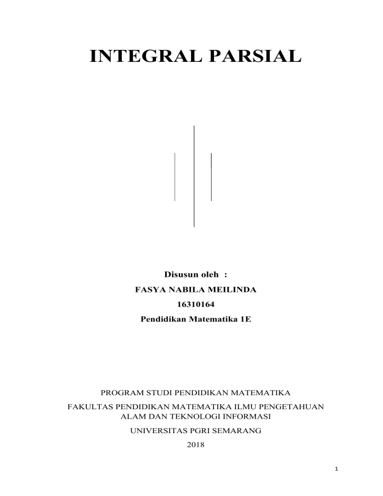 INTEGRAL PARSIAL Disusun oleh : FASYA NABILA MEILINDA 16310164 Pendidikan Matematika 1E PROGRAM STUDI PENDIDIKAN MATEMATIKA FAKULTAS PENDIDIKAN MATEMATIKA ILMU PENGETAHUAN ALAM DAN TEKNOLOGI INFORMASI UNIVERSITAS PGRI SEMARANG 2018 1 I. INTEGRAL PARSIAL Integral Parsial adalah suatu cara untuk menaikan pangkat suatu bilangan dua perkalian fungsi yang berbeda sehingga fungsi bilangan tersebut dapat menaikan pangkatnya (diintegralkan). Integral parsial dihubungkan dengan fungsi bilangan (π’) dan (ππ£) yang fungsi tersebut akan dikali dan diintegralkan sesuai dengan aturan rumus integral parsial. Integral Parsial memiliki cara khusus dimana dua bilangan fungsi dari (π’) dan (ππ£) akan dihitung untuk mencari penurunan pangkat dari (π’) atau biasa disebut (du) dan mencari kenaikan pangkat (ππ£) atau biasa disebut (v). Bilangan fungsi-fungsi diatas memiliki hubungan yang sangat penting dalam integral parsial Sering kali terdapat banyak pendapat yang menyatakan bahwa integral parsial hampir sama penyederhanaannya seperti integral subtitusi. Padahal dalam konsep penyederhanaan integral parsial lebih rumit dibandingkan integral subtitusi. Integral parsial menyederhanakan fungsi dengan pemilihan fungsi yang akan diturunkan dan yang akan diintegralkan untuk membuat fungsi-fungsi baru yang akan digunakan pada rumus integral parsial. Integral parsial merupakan suatu metode yang sering digunakan untuk mengintegralkan hasil kali dua fungsi, yang berdasarkan pada formula hasil kali dua fungsi sebagai berikut. π(π’ . π£) = π’ ππ£ + π£ ππ’ Dengan mengintegralkan kedua ruas, diperoleh : ∫ π (π’ . π£) = ∫ π’ ππ£ + ∫ π£ ππ’ π’ . π£ = ∫ π’ ππ£ + ∫ π£ ππ’ ∫ π’ ππ£ = π’ π£ − ∫ π£ ππ’ Bentuk integral parsial di atas dapat dicirikan dalam dua bagian yaitu bagian yang diturunkan dan bagian yang diintegralkan. Dalam keadaan ini, integral parsial sering dikenal sebagai integral sebagian. Pada formula integral parsial, ∫ π’ ππ£ dapat dicirikan bahwa integralnya terdiri dari dua bagian, yaitu sebuah fungsi u dan sebuah diferensial dari fungsi ππ£ . Pemilihan fungsi π’ dapat diambil apabila diturunkan terus menerus hasil akhirnya nol atau bentuk turunannya mempermudah pengintegralan bentuk ∫ π’ ππ£, sedangkan ππ£ dipilih atau diambil agar dapat dengan mudah diintegralkan. 2 II. INTEGRAL PARSIAL TERHADAP FUNGSI ALJABAR Integral parsial terhadap fungsi aljabar dapat diselesaikan berdasarkan formula, tabulasi, maupun dengan konsep dasar berkata – kata tentang tururnan, integral, dan lawan tanda yang akan dijelaskan pada contoh berikut. Petunjuk : Pergunakan formula ο· ∫(ππ₯ + π)π ππ₯ = 1 (ππ₯ + π)π+1 + πΆ π(π + 1) ο· ∫ π’ ππ£ = π’ π£ − ∫ π£ ππ’ Petunjuk : Aturan berkata – kata : Proses awal : Tulis – integralkan Proses kedua : Lawan tanda- turunkan-integralkan Proses selanjutnya: Lakukan berulang- ulang proses kedua sampai turunan menemui nol, stop dan tambahkan C. Contoh 1 Selesaikan integral parsial ∫ π₯√4π₯ ππ₯ Jawab : Cara formula: 1 ∫ π₯√4π₯ ππ₯ = ∫ π₯ (4π₯ − 1)2 ππ₯ Misalkan : π’ = π₯ βΎ ππ’ = ππ₯ 1 ππ£ = (4π₯ − 1)ππ₯ βΎ π£ = ∫(4π₯ − 1)2 ππ₯ 1 = ∫(4π₯ − 1)2 = π (4π₯ − 1) 4 1 1 ∫(4π₯ − 1)2 π(4π₯ − 1) 4 1 1 2 . (4π₯ − 1)2 4 3 3 2 (4π₯ − 1)2 = 12 3 1 = (4π₯ − 1)2 6 1 = (4π₯ − 1)√4π₯ − 1 6 = 3 3 1 1 π₯ (4π₯ − 1)√4π₯ − 1 − ∫ (4π₯ − 1)2 ππ₯ 6 6 ∫ π₯√4π₯ ππ₯ = = 3 π (4π₯ − 1) 1 1 π₯ (4π₯ − 1)√4π₯ − 1 − ∫(4π₯ − 1)2 6 6 4 = 3 1 1 π₯ (4π₯ − 1)√4π₯ − 1 − ∫(4π₯ − 1)2 π (4π₯ − 1) 6 24 = 5 1 1 2 π₯ (4π₯ − 1)√4π₯ − 1 − . . (4π₯ − 1)2 + πΆ 6 24 5 = 1 6 2 π₯ (4π₯ − 1)√4π₯ − 1 − 120 . (4π₯ − 1)2 √4π₯ − 1 + πΆ 1 1 π₯ (4π₯ − 1)√4π₯ − 1 − . (4π₯ − 1)2 √4π₯ − 1 + πΆ 6 60 1 1 π½πππ. ∫ π₯√4π₯ ππ₯ πππππβ π₯ (4π₯ − 1)√4π₯ − 1 − . (4π₯ − 1)2 √4π₯ − 1 + πΆ 6 60 = Cara tabulasi : πππ‘π’π ππππππ‘π’πππ ∫ π₯ √4π₯ − 1 ππ₯, πππ π’π π’π π‘ππππ π ππππππ ππππππ’π‘. Turunkan Integralkan ∫π₯ √4π₯ − 1 dx 1 2 . (4π₯ − 1)√4π₯ − 1 4 3 1 1 2 (−) . . (4π₯ − 1)2 √4π₯ − 1 6 4 5 1 (+) 0 ∫ π₯ √4π₯ − 1 ππ₯ = 1 1 π₯ (4π₯ − 1)√4π₯ − 1 − . (4π₯ − 1)2 √4π₯ − 1 + πΆ 6 60 Cara berkata – kata (cara Kino) : ∫ π₯ √4π₯ − 1 ππ₯ = ? Proses awal : Tulis x≡x Integralkan √4π₯ − 1 1 2 .( ) (4π₯ − 1)2 √4π₯ − 1 4 1.2 + 1 1 ≡ (4π₯ − 1)√4π₯ − 1 6 ≡ Diperoleh 1 6 (4π₯ − 1)√4π₯ − 1 4 Proses kedua : 1 1 Lawan tanda (6 π₯) ≡ − 6 π₯ Turunkan (− 6 π₯) ≡ − 6 Integralkan (4π₯ − 1)√4π₯ − 1 ≡ 1 1 ≡ 1 1 4 2 . (1.2+1) (4π₯ − 1)2 √4π₯ − 1 1 (4π₯ − 1)2 √4π₯ − 1 10 1 1 Diperoleh (− 6) . 10 (4π₯ − 1)2 √4π₯ − 1 ≡ − 60 . (4π₯ − 1)2 √4π₯ − 1 Proses ketiga : 1 1 − (60) = 60 Lawan tanda 1 Turunkan (60) ≡ 0 (π π‘ππ) ≡ +C Tulis Diperoleh 1 1 π₯ (4π₯ − 1)√4π₯ − 1 − . (4π₯ − 1)2 √4π₯ − 1 + πΆ 6 60 ∫ π₯ √4π₯ − 1 ππ₯ = 1 1 π₯ (4π₯ − 1)√4π₯ − 1 − . (4π₯ − 1)2 √4π₯ − 1 + πΆ 6 60 π½πππ ∫ π₯ √4π₯ − 1 ππ₯ πππππβ Contoh 2 Selesaikanlah∫ x√4π₯ − 1 dx dengan cara manipulasi aljabar dan substitusi Jawab: 1 1 ∫ x √4x − 1 dx = ∫ 4 (4x − 1)√4x − 1 dx + 4∫ √4x − 1 dx 1 1 = 4∫ (4x − 1)√4x − 1 dx + 4∫ √4x − 1 dx .................... (1) Bentuk (1) merupakan bentuk integral substitusi dan diselesaikan den