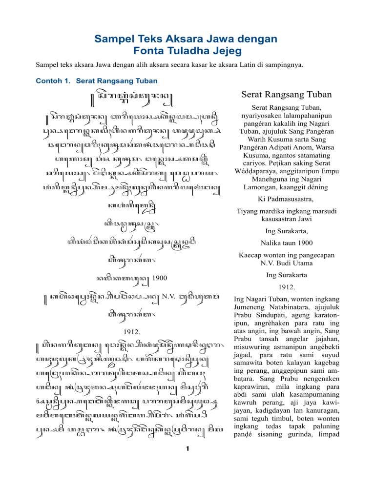 Sampel Teks Aksara Jawa dengan Fonta Tuladha Jejeg Sampel teks aksara Jawa dengan alih aksara secara kasar ke aksara Latin di sampingnya. Contoh 1. Serat Rangsang Tuban ꧋ ꦱꦼꦫꦠ꧀ꦫꦁꦱꦁꦠꦸꦨꦤ꧀ Serat Rangsang Tuban ꧋ ꦱꦼꦫꦠ꧀ꦫꦁꦱꦠꦸ ꦁ ꦨꦤ꧀ ꦚꦫꦶꦪꦪꦺꦴꦱ꧀ꦱꦏꦼꦤ꧀ꦭꦭꦩ꧀ꦥꦃꦲꦤ꧀ꦤꦶ ꦥꦸꦤ꧀ꦦꦪꦔꦺꦫꦤ꧀ꦏ ꦏꦭꦶꦃꦲꦶꦤꦒꦫꦶꦠꦸꦨꦤ꧀ ꦲꦗꦸꦗꦸꦭꦏ꧀ꦱꦁ ꦦꦪꦔꦺꦫꦤ꧀ꦮꦫꦶꦃꦏꦸꦯꦸꦩꦱꦂꦠꦯꦁ ꦦꦪꦔꦺꦫꦤ꧀ꦲꦢꦶꦦꦡꦶ ꦲꦪꦟꦺꦴꦩ꧀ ꦮꦂꦰ ꦏꦸꦯꦸꦩ꧈ ꦔꦺꦪꦤꦴ ꦴꦱ꧀ꦱꦠꦩꦠꦴꦶ ꦕꦫꦶꦪꦪꦺꦴꦱ꧀꧈ ꦥꦼꦛꦶ ꦏ꧀ꦏ ꦤ꧀ꦱꦏꦶꦱꦼꦫꦠ꧀ ꦪꦮ ꦢ ꦥ ꧀ꦝ ꦫꦪꦺ꧈ ꦲꦁꦒꦶ ꦠꦴ ꦤ꧀ꦤꦶꦥꦸꦤ꧀ꦲꦼꦩ꧀ꦩꦤ꧀ꦤꦼꦃꦓꦸꦤ꧀ꦤꦲꦶꦤꦒꦫꦶꦭꦪꦩꦁꦴꦔꦺꦤ꧀ ꦏꦲꦁꦒꦪ ꦶ ꦠꦤꦤ꧀ꦤꦶ Serat Rangsang Tuban, nyariyosaken lalampahanipun pangéran kakalih ing Nagari Tuban, ajujuluk Sang Pangéran Warih Kusuma sarta Sang Pangéran Adipati Anom, Warsa Kusuma, ngantos satamating cariyos. Peṭikan saking Serat Wédḍaparaya, anggitanipun Empu Manehguna ing Nagari Lamongan, kaanggit déning Ki Padmasusastra, Tiyang mardika ingkang marsudi kasusastran Jawi ꦏꦶꦦꦢ꧀ꦩꦯꦸꦱꦱ ꦱ ꧈ Ing Surakarta, ꦠꦶꦪꦺꦁꦩꦢ ꦂ ꦶꦏꦲꦶꦏꦁꦩꦱꦸ ꦂ ꦢꦶꦏꦱꦸꦱꦱ ꦱ ꦤ꧀ꦗꦮꦶ Nalika taun 1900 ꦲꦶꦯꦸꦫꦏꦂꦠ꧈ Kaecap wonten ing pangecapan N.V. Budi Utama Ing Surakarta ꦤꦭꦶꦏꦠꦲꦸꦤ꧀ 1900 1912. ꧋ ꦏꦲꦼꦕꦪꦥ꧀ꦮꦺꦴꦤꦴꦼ ꦤ꧀ꦲꦶꦥꦔꦺꦼꦕꦥ꧀ꦥꦤ꧀ N.V. ꦧꦸꦢꦶꦲꦸꦠꦩ ꦲꦶꦯꦸꦫꦏꦂꦠ꧈ 1912. ꧋ ꦲꦶꦤꦒꦫꦶꦠꦸꦧꦤ꧀ ꦪꦮꦴꦤꦴꦼ ꦤ꧀ꦲꦶꦏꦁꦗꦸꦩꦼꦤ꧀ꦤꦼꦟꦺꦡꦨꦶꦤ꧀ꦤꦛꦫ꧈ ꦲꦗꦸꦗꦸꦭꦏ꧀ꦦꦿꦨꦯꦶ ꦟꦺ꧀ꦢꦸ ꦦꦡꦶ꧈ ꦲꦒꦼꦏꦫꦪꦡꦴꦤ꧀ꦤꦶꦥꦸꦤ꧀ ꦲꦪꦔꦿꦺꦃꦲꦏꦼꦤ꧀ꦥꦫꦫꦠꦸꦲꦶꦔꦺꦠꦱ꧀ꦲꦔꦺꦶꦤ꧀ ꦲꦶꦧꦮꦃ ꦲꦔꦺꦶꦤ꧀ ꦯꦁ ꦦꦿꦨꦠꦤ꧀ꦱꦃꦲꦔꦺꦼꦭꦂꦗꦗꦃꦲꦤ꧀ ꦩꦶꦱꦸꦮꦸꦂꦫꦶ ꦄꦱ꧀ꦩꦤ꧀ꦤꦶꦥꦸꦤ꧀ꦲꦪꦔꦺꦧꦼ ꦏ꧀ꦏꦶ ꦗꦒꦢ꧀ ꦥꦫꦫꦠꦸꦱꦩꦶꦱꦸꦪꦸꦢ꧀ ꦩꦮꦶꦠꦪꦧꦴꦠꦼ ꦤ꧀ꦏ ꦭꦪꦺꦤ꧀ꦏ ꦒꦼꦧꦒ꧀ꦲꦶꦥꦼꦫꦁ꧈ ꦲꦁꦒꦥ ꦼ ꧀ꦥꦶ ꦥꦸꦤ꧀ꦱꦩꦶ ꦲ ꦩ ꦛ ꧀ꦧ ꦫ꧉ ꦯꦁ ꦦꦿꦨꦤꦼꦔꦺꦼꦤ꧀ꦤꦏꦼ ꦤ꧀ꦏ ꦥꦿꦮꦶꦫꦤ꧀ ꦩꦶꦭ 1 Ing Nagari Tuban, wonten ingkang Jumeneng Natabinaṭara, ajujuluk Prabu Sindupati, ageng karatonipun, angrèhaken para ratu ing atas angin, ing bawah angin, Sang Prabu tansah angelar jajahan, misuwuring asmanipun angébekti jagad, para ratu sami suyud samawita boten kalayan kagebag ing perang, anggepipun sami ambaṭara. Sang Prabu nengenaken kaprawiran, mila ingkang para abdi sami ulah kasampurnaning kawruh perang, aji jaya kawijayan, kadigdayan lan kanuragan, sami teguh timbul, boten wonten ingkang teḍas tapak paluning panḍé sisaning gurinda, limpad ꦲꦶꦏꦁꦥꦫꦲꦧꦤꦶꦱꦩꦶꦲꦸꦭꦃꦏꦱꦩ꧀ꦥꦸꦂꦤꦤ꧀ꦤꦶꦏꦮꦿꦸꦃꦥꦼꦫꦁ꧈ ꦲꦗꦶ ꦗꦪꦺꦏꦮꦶꦗꦪꦺꦤ꧀ ꦏꦢꦶꦒꦪꦺ ꦤ ꦤ꧀ꦭ ꦤ꧀ꦏ ꦤꦸꦫꦒꦤ꧀ ꦱꦩꦶꦠꦒꦸ ꦼ ꦃ ꦠꦶ ꦩ ꧀ꦧꦸꦭ꧀ ꦪꦧꦴꦠꦼꦪꦤ꧀ꦮꦺꦴꦤꦴꦼ ꦤ꧀ꦲꦶꦏꦁꦠꦝ ꦼ ꦱꦴ ꦥꦏ꧀ꦥꦭꦤ꧀ꦤꦶ ꦥꦪꦟꦺ꧀ꦝꦱꦱ ꦶ ꦤ꧀ꦤꦶꦒꦸꦫꦶꦤꦤ꧈ ꦭꦶꦩ꧀ꦥꦢ꧀ꦲꦶꦮꦶꦪꦮꦏꦱꦸꦒꦶꦃꦒꦼꦭꦂ ꦥꦤ꧀ꦤꦶꦏꦼꦥ꧀ꦥꦶꦱꦠꦱꦼ ꦏꦴꦶ ꦪꦧꦴꦠꦼ ꦤ꧀ꦏ ꦚꦤꦤ꧀ꦲꦶꦩꦼꦱꦃ꧈ ꦱꦸꦩꦼ ꦉꦥ꧀ꦥꦶꦥꦸꦤ꧀ꦱꦩ꧀ꦥꦸꦤ꧀ꦏ ꦪꦱꦥ꧀ꦏ ꦊꦧꦼꦠ꧀ꦲꦶꦧꦾꦸꦲꦏꦭꦮꦼꦫꦠ ꦶ ꧀ ꦲꦪꦔꦺꦭ꧀ꦮꦼꦔꦺꦤ꧀ꦤꦶꦥꦸꦤ꧀ ꦪꦏꦴꦤꦴ ꦥ꧀ꦥꦶꦏꦥꦿꦮꦶꦫꦤ꧀ ꦏꦱꦸꦢꦶ ꦫꦤ꧀ꦱꦂ ꦠꦏꦮꦼꦒꦒ ꦶ ꧀ꦤ꧀ꦤꦶꦥꦱꦁꦒꦭ ꦼ ꦂꦮꦲꦸ꧇ ꦲꦢꦩꦼꦭ꧀ꦩꦶꦫꦱ ꦶ ꧀ꦱꦶ ꦥꦫꦫꦠꦸꦲꦶꦏꦁꦪꦢꦪꦫꦁꦱꦩꦶꦏꦮꦼꦏꦸꦲꦶꦗꦗꦃꦲꦤ꧀ꦤꦶꦥꦸꦤ꧀ꦤꦒꦫꦶ ꦠꦸꦨꦤ꧀꧈ ꦒꦂꦮꦤ꧀ꦤꦶꦥꦸꦤ꧀ꦱꦁ ꦦꦿꦨꦱꦔꦺꦁꦢꦱꦱꦔꦺ꧈ ꦤꦔꦺꦶꦥꦸꦠ ꦤ꧀ꦤꦶꦥꦸꦤ꧀ꦤꦩꦸꦁꦏꦏꦭꦶꦃꦱꦩꦶꦏꦏꦸꦁ꧈ ꦲꦶꦏꦁꦱꦼꦥꦸꦃꦩꦶꦗꦭ ꦶ ꧀ꦱꦏꦶꦒꦂꦮ ꦥꦔꦽꦪ ꦩ ꧀ꦧꦠꦸꦫꦱ꧀ꦱꦶ ꦦꦟꦺ꧀ꦝꦶꦠ꧈ ꦏꦥꦫꦶꦔꦺꦤ꧀ꦤꦩꦫꦪꦢꦤ꧀ꦮꦺꦫꦶꦃ ꦏꦸꦯꦸꦩ꧈ ꦲꦶꦏꦁꦲꦪꦤꦩ꧀ꦩꦶꦪꦪꦺꦴꦱ꧀ꦱꦏꦶꦒꦂꦮꦥꦢ꧀ꦩꦶꦥꦸꦠꦤ꧀ꦤꦶ ꦫꦠꦸ꧈ ꦏꦥꦫꦶꦔꦺꦤ꧀ꦤꦩꦫꦪꦢꦤ꧀ꦮꦺꦂꦰꦏꦸꦯꦸꦩ꧈ ꦥꦸꦤ꧀ꦤꦶꦏꦲꦶꦏꦁ ꦒꦶꦤ꧀ꦤꦝꦁꦲꦒ ꦁ ꦼꦪ ꦤꦴ ꦴꦱ꧀ꦱꦶ ꦏꦫꦪꦠꦴꦤ꧀ꦤꦶꦥꦸꦤ꧀ꦲꦶꦏꦁꦫꦩ꧈ ꦫꦪꦢꦤ꧀ꦏ ꦏꦭꦶꦃꦫꦸꦏꦸꦤ꧀ꦲꦶꦪꦒꦤ꧀ꦤꦶꦥꦸꦤ꧀ꦱꦢꦸꦭꦂꦫꦤ꧀ ꦫꦪꦢꦤ꧀ꦱꦼ ꦥꦸꦃꦱꦔꦺꦼꦪꦠ꧀ꦩꦴꦪꦩꦁꦴꦝꦠꦼꦲꦏ ꦶ ꦁꦫꦪꦺꦶ꧈ ꦱꦂꦠꦲꦗꦿꦶꦃ ꦲꦱꦶꦃꦤꦫꦶꦩꦃꦲꦶꦥ ꦤ꧀ꦢꦸ ꦩ꧀ꦲꦶꦏꦁ ꦱꦩ꧀ꦥꦸꦤꦤꦪꦢꦴꦱ꧀ꦊꦉꦱ꧀ꦱꦶ ꦥꦸ ꦤ꧀ꦗꦸ ꦩꦤ꧀ꦤ ꦼ ꦼꦦꦪꦔꦺꦫꦤ꧀ꦲꦒꦼ ꦢꦪꦢꦴꦱ꧀ꦮꦼꦮꦏꦸ ꦼ ꦤ꧀ꦤꦶꦥꦿꦗ꧉ ꦫꦪꦢꦤ꧀ꦲꦪꦤꦩ꧀ꦱꦔꦺꦼꦠ꧀ꦠꦽꦱꦱꦲ ꦫꦸꦩꦼꦏꦸꦃꦲꦒꦼꦒꦸꦁꦔꦺꦤ꧀ꦤꦶꦥꦸ ꦤ ꦠ ꧀ꦝ ꦼꦲꦏ ꦶ ꦁꦫꦏꦥꦿꦱꦱꦠ꧀ꦝꦠꦼꦲꦏ ꦶ ꦁ ꦫꦩ꧈ ꦩꦶꦭꦗꦸꦩꦼꦤ꧀ꦤꦼꦔꦺꦥꦸ ꦶ ꦤ꧀ꦦꦪꦔꦺꦫꦤ꧀ꦲꦢꦶꦦꦡꦶꦪꦧꦴꦠꦼꦤ꧀ꦲ ꦢꦩꦼ ꦭ꧀ꦏꦼ ꦪꦩꦪ