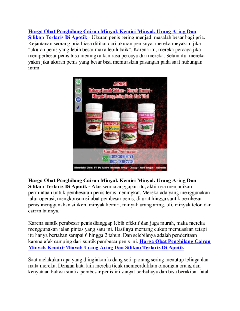 Harga Obat Penghilang Cairan Minyak Kemiri-Minyak Urang Aring Dan Silikon Terlaris Di Apotik - Ukuran penis sering menjadi masalah besar bagi pria. Kejantanan seorang pria biasa dilihat dari ukuran penisnya, mereka meyakini jika "ukuran penis yang lebih besar maka lebih baik". Karena itu, mereka percaya jika memperbesar penis bisa meningkatkan rasa percaya diri mereka. Selain itu, mereka yakin jika ukuran penis yang besar bisa memuaskan pasangan pada saat hubungan intim. Harga Obat Penghilang Cairan Minyak Kemiri-Minyak Urang Aring Dan Silikon Terlaris Di Apotik - Atas semua anggapan itu, akhirnya menjadikan permintaan untuk pembesaran penis terus meningkat. Mereka ada yang menggunakan jalur operasi, mengkonsumsi obat pembesar penis, di urut hingga suntik pembesar penis menggunakan silikon, minyak kemiri, minyak urang aring, oli, minyak telon dan cairan lainnya. Karena suntik pembesar penis dianggap lebih efektif dan juga murah, maka mereka menggunakan jalan pintas yang satu ini. Hasilnya memang cukup memuaskan tetapi itu hanya bertahan sampai 6 hingga 2 tahun. Dan selebihnya adalah penderitaan karena efek samping dari suntik pembesar penis ini. Harga Obat Penghilang Cairan Minyak Kemiri-Minyak Urang Aring Dan Silikon Terlaris Di Apotik Saat melakukan apa yang diinginkan kadang setiap orang sering menutup telinga dan mata mereka. Dengan kata lain mereka tidak memperdulikan omongan orang dan kenyataan bahwa suntik pembesar penis ini sangat berbahaya dan bisa berakibat fatal jika nekad dilakukan. Namun ada juga yang hanya ikut ikutan teman dan melihat hasilnya tapi tidak mengetahui resikonya. Untuk itu, mari kita cari tahu bersama apa sebenarnya bahaya, risiko, atau efek samping bagi kesehatan yang bisa ditimbulkan oleh suntik pembesar penis. Efek samping dan berbagai bahaya menyuntikan sesuatu pada penis atau Mr. P : Cedera fatal pada penis. Sakit ketika ereksi maksimal. Bentuk penis akan berbeda dari bentuk umumnya. Meskipun terlihat besar, penis sulit untuk ereksi. Penis membengkak dan meradang. Penis mengkerut. Bisa menyebabkan kanker. Bisa menyebabkan silikonoma. Penis menjadi kaku dan mengeras. Penis semakin memendek dalam jangka waktu tertentu. Terjadinya infeksi pada penis. Sakit dan tidak nyaman ketika melakukan hubungan intim. Timbul rasa nyeri yang tidak tertahankan pada penis. Penis terasa panas, sakit dan sangat perih jika sentuh. Penis akan mengalami infeksi parah bahkan sampai mengeluarkan nanah. Mengalami pendarahan. Menurunnya gairah seksual, lemah syahwat dan mudah terserang penyakit lainnya. Menyebabkan ketergantungan pada penyuntikan. Struktur saraf pada penis mengalami kerusakan. Obat Penghilang Suntik Silikon/Minyak Kemiri/Urang Aring Herbal Alami Produk Herbal Gang Jie, Gho Siah, Pipeca Dan Kapsul BD merupakan produk eksklusif dari De Nature. Gang Jie POM TR. 173 300 491 Gho Siah POM TR. 173 305 881 Pipeca POM TR. 173399911 Kapsul BD POM TR. 163398401 Kegunaan Paket Herbal De Nature Ini : Memperbaiki sistem otot saraf yang rusak pada penis. Mencegah inflamasi atau pembengkakan pada penis. Mengurangi dan menghentikan rasa sakit. Bisa mengencangkan saraf-saraf kendur pada sistem produksi pria. Membuat kulit penis lebih elastis pada penderita suntik silikon atau suntik kemiri. Menghilangkan cairan silikon atau kemiri secara alami di alat vital. Melancarkan peredaran darah pada alat kelamin. Baik untuk menambah kesuburan sperma. Mengatasi katup mani yang bocor. Baik untuk mengatasi ereksi lemah dan menurun. Meningkatkan stamina. Mengatasi berbagai keluhan atau penyakit pada kelamin. Dan baik juga untuk mengatasi masalah penyakit di luar alat kelamin atau vitalitas seperti ginjal, darah tinggi, diabetes dll. Mari Ketahui, Produk De Nature 1. Terjamin mutu dan kualitas, sesuai standar BPOM Selain berbahan herbal alami produk de nature berizin UKOT DINKES RI No. 503/1259/2016/2, Memiliki sertifikat HALAL MUI, Lulus uji laboratorium sebelum mendapatkan ijin edar dari BPOM dengan POM TR yang sudah disebutkan diatas, Bahkan bersertifikat internasional ISO 9001:2015 Sehingga obat ini sangat aman digunakan untuk pengobatan dan merupakan alternatif pengobatan herbal paling tepat. 2. Tanpa Efek Samping Obat herbal adalah obat alami sehingga tidak memiliki efek samping yang tentunya berbeda dengan obat kimia. Tetapi harus digunakan dengan benar dan sesuai aturan. 3. Anda tidak perlu ke dokter atau apotik Anda malu untuk ke dokter atau takut mencari obat penghilang silikon yang tepat ? sekarang tidak perlu khawatir dan takut lagi. Kami adalah solusi yang tepat untuk Anda, cukup pesan atau hubungi kami untuk konsultasi atau langsung order obat penghilang silikon alami dengan mudah dan cepat tanpa perlu malu dan segan lagi untuk berobat ke dokter spesialis penyakit kelamin maupun urologi dan lainnya. 4. Hemat waktu dan biaya Efek samping dari suntik silikon bisa sangat berbahaya dan membutuhkan biaya yang mahal untuk pengobatan terutama jika Anda menggunakan pengobatan konvensional. Kini, dengan obat herbal ini, Anda tidak perlu khawatir lagi masalah biaya yang mahal. Kelebihan Anda Menggunakan Pengobatan Herbal Ini : Produk De Nature sudah mempunyai ijin BPOM, Halal MUI, dan ISO Anda tidak perlu ke dokter Tidak perlu melakukan tindakan operasi Proses penyembuhan yang cepat dan tepat Hemat biaya Privacy tejaga. HARAP BACA SEBELUM PESAN : Kami memberlakukan sistem transaksi online sebagaimana umumnya yaitu barang dikirim setelah kami menerima pembayaran Kami akan memastikan barang sampai ke tangan Anda, jika tidak sampai uang kembali Kami hanya menjual PRODUK ORIGINAL, jika palsu uang kembali 100% Pemasaran produk herbal kami secara online. Pelayanan pengiriman dilakukan baik dalam maupun luar negeri. Untuk dalam negeri mencakup seluruh wilayah selama dalam jangkauan jasa Tiki, JNE, J&T atau Pos Indonesia. Dan untuk luar negeri mencakup Singapore, Malaysia, Thailand, Brunai, Australia, Hongkong, Taiwan, Jepang, Korea Selatan, Inggris, Amerika Serikat (Negara yang tidak disebutkan bisa 