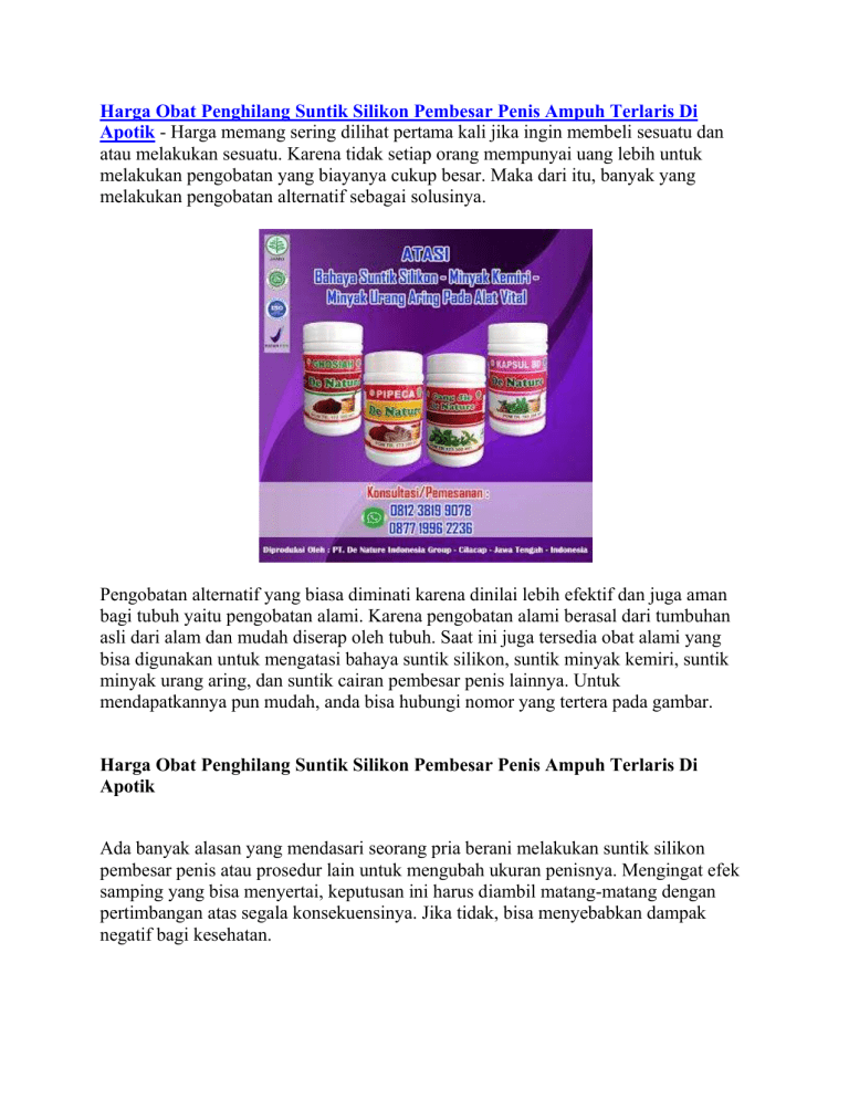 Harga Obat Penghilang Suntik Silikon Pembesar Penis Ampuh Terlaris Di Apotik - Harga memang sering dilihat pertama kali jika ingin membeli sesuatu dan atau melakukan sesuatu. Karena tidak setiap orang mempunyai uang lebih untuk melakukan pengobatan yang biayanya cukup besar. Maka dari itu, banyak yang melakukan pengobatan alternatif sebagai solusinya. Pengobatan alternatif yang biasa diminati karena dinilai lebih efektif dan juga aman bagi tubuh yaitu pengobatan alami. Karena pengobatan alami berasal dari tumbuhan asli dari alam dan mudah diserap oleh tubuh. Saat ini juga tersedia obat alami yang bisa digunakan untuk mengatasi bahaya suntik silikon, suntik minyak kemiri, suntik minyak urang aring, dan suntik cairan pembesar penis lainnya. Untuk mendapatkannya pun mudah, anda bisa hubungi nomor yang tertera pada gambar. Harga Obat Penghilang Suntik Silikon Pembesar Penis Ampuh Terlaris Di Apotik Ada banyak alasan yang mendasari seorang pria berani melakukan suntik silikon pembesar penis atau prosedur lain untuk mengubah ukuran penisnya. Mengingat efek samping yang bisa menyertai, keputusan ini harus diambil matang-matang dengan pertimbangan atas segala konsekuensinya. Jika tidak, bisa menyebabkan dampak negatif bagi kesehatan. Opsi suntik silikon pada penis bisa jadi pilihan karena harganya lebih terjangkau ketimbang filler seperti kolagen atau gel dari hyaluronic acid (restylane). Ketika seseorang melakukan suntik silikon pembesar penis, artinya bentuk penis bisa berubah permanen. Sayangnya, jika ada efek samping pun bisa berlangsung permanen. Harga Obat Penghilang Suntik Silikon Pembesar Penis Ampuh Terlaris Di Apotik Efek samping suntik silikon pada penis Tidak berlebihan jika menyebut silikon sebagai bom waktu karena belum teruji klinis aman digunakan untuk keperluan kosmetik. Tak hanya di payudara, suntik silikon di area lain seperti wajah, penis juga bisa mengakibatkan efek samping. Bahkan, reaksi silikon ini bisa muncul hingga 3 hingga 25 tahun kemudian sejak pertama kali melakukan suntik silikon. Tidak ada yang bisa memprediksi kapan efek samping akan terjadi. Harga Obat Penghilang Suntik Silikon Pembesar Penis Ampuh Terlaris Di Apotik Beberapa efek samping suntik silikon pada penis adalah: 1. Komplikasi Dampak negatif yang paling sering terjadi ketika seseorang melakukan suntik silikon adalah komplikasi. Sensasi yang muncul bisa berbeda mulai dari nyeri hingga perubahan sensasi pada penis. Biasanya, komplikasi ditandai dengan munculnya bengkak dan kemerahan di penis. 2. Perubahan posisi silikon Meski dianggap bisa mengubah bentuk penis secara permanen, ada kemungkinan terjadi perubahan posisi silikon di dalam penis. Mulai dari pengerasan jaringan penis, kebocoran sehingga muncul benjolan, perubahan posisi silikon, dan pergeseran lain yang justru membuat penis tampak tidak normal. 3. Infeksi Infeksi bakteri dan jamur juga bisa terjadi ketika seseorang melakukan suntik silikon pembesar penis. Jika sudah parah, infeksi ini mengharuskan silikon diangkat. Artinya, harus ada prosedur operasi yang kembali dilewati. Harga Obat Penghilang Suntik Silikon Pembesar Penis Ampuh Terlaris Di Apotik 4. Potensi kanker Bukan tidak mungkin efek samping suntik silikon pada penis yaitu bisa menyebabkan kanker payudara dan masalah pada jaringan di seputar penis. Dalam jangka panjang, bisa juga ada dampak pada sistem reproduksi pria. 5. Kerusakan saraf Saraf di sekitar penis juga bisa mengalami kerusakan saraf. Ini membuat sensitivitas terhadap berbagai stimulus terganggu, termasuk mengganggu saat sedang ereksi maupun ejakulasi. Dalam jangka panjang, kerusakan saraf ini bisa meluas ke area lain. 6. Komplikasi saat prosedur dilakukan Selain efek samping setelah melakukan suntik silikon pembesar penis, ada juga risiko komplikasi saat prosedur dilakukan. Contohnya perdarahan berlebih, reaksi alergi terhadap obat bius, atau terjadi penyumbatan di pembuluh darah. Dalam waktu 3 tahun pertama, setidaknya 3 dari 4 pasien yang pernah menjalani suntik silikon bisa merasakan beberapa efek samping di atas. Komplikasi lokal yang paling sering terjadi adalah rasa nyeri, infeksi, pengerasan silikon, atau keinginan untuk melakukan operasi tambahan. Harga Obat Penghilang Suntik Silikon Pembesar Penis Ampuh Terlaris Di Apotik Obat Penghilang Suntik Silikon/Minyak Kemiri/Urang Aring Herbal Alami Produk Herbal Gang Jie, Gho Siah, Pipeca Dan Kapsul BD merupakan produk eksklusif dari De Nature. Gang Jie POM TR. 173 300 491 Gho Siah POM TR. 173 305 881 Pipeca POM TR. 173399911 Kapsul BD POM TR. 163398401 Kegunaan Paket Herbal De Nature Ini : Memperbaiki sistem otot saraf yang rusak pada penis. Mencegah inflamasi atau pembengkakan pada penis. Mengurangi dan menghentikan rasa sakit. Bisa mengencangkan saraf-saraf kendur pada sistem produksi pria. Membuat kulit penis lebih elastis pada penderita suntik silikon atau suntik kemiri. Menghilangkan cairan silikon atau kemiri secara alami di alat vital. Melancarkan peredaran darah pada alat kelamin. Baik untuk menambah kesuburan sperma. Mengatasi katup mani yang bocor. Baik untuk mengatasi ereksi lemah dan menurun. Meningkatkan stamina. Mengatasi berbagai keluhan atau penyakit pada kelamin. Dan baik juga untuk mengatasi masalah penyakit di luar alat kelamin atau vitalitas seperti ginjal, darah tinggi, diabetes dll. Sekedar informasi untuk kenyamanan Konsumen, bahwa Produk dari perusahaan kami ini sudah memiliki: Ijin Resmi Perusahaan dari Kementerian Kesehatan Ijin BPOM, yang artinya sudah lulus uji stabilitas Produk Sertifikat Halal MUI, sehingga kehalalannya bisa dipertanggungjawabkan Apoteker Yang berpengalaman Sudah melewati Proses Sortir Bahan Baku, Guna Menjaga Mutu Produk Proses Produksi Sesuai Alur CPOTB (Cara Pembuatan Obat Tradisional Yang Baik Dan Benar) Sertifikat ISO 9001 : 2015 yang artinya sudah Berstandar Internasional Untuk informasi lebih lanjut mengenai Produk dan Harga, Cara Pemesanan/ Konsultasi atau hal lainnya, anda dapat menghubungi kami melalui Telpon/WhatsAp