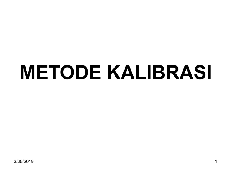 METODE KALIBRASI 3/25/2019 1 METODE KALIBRASI Kurva kalibrasi merupakan pembuatan hubungan fungsional antara sinyal (absorbans) dengan konsentrasi standar (analit) Sinyal respon sistem dan merupakan variabel dependen (x) Konsentrasi analit yang diketahui konsentrasinya dan merupakan variabel independen (y) Kalibrasi yang sederhana: hubungan linier antara sinyal dan konsentrasi persamaan garis lurus (y = a + bx) metode kuadrat terkecil (least square method) (teknik yang paling umum digunakan untuk membuat garis/kurva dengan beberapa titik data) 3/25/2019 teknik ini didasarkan pada minimisasi kuadrat deviasi dari tiap titik data dan garis (lihat DC Harris 2002, Quantitative Chemical Analysis Ed ke-6) 2 METODE KALIBRASI 3/25/2019 3 METODE KALIBRASI Bagaimana anda mengetahui bahwa nantinya kurva kalibrasi yang anda buat memiliki kelinieran yang baik? Koefisien korelasi deviasi dari tiap titik dengan titik pada garis lurus yang diperoleh dilambangkan sebagai r Koefisien determinasi kuadrat dari koefisien korelasi r2 kisaran nilai r2 dari 0 sampai 1, jika nilai r2 dari persamaan garis yang dibuat mendekati 1 maka kurva yang dibuat memiliki kelinieran garis yang baik 3/25/2019 4 METODE KALIBRASI Menurut ACSC on Environmental Improvement: • Proses penentuan hubungan antara sinyal yang terukur dengan jumlah analat • ACSC menetapkan nilai k untuk setiap metode • k harus ditentukan bila sifat-sifat bahan tidak ideal melalui percobaan dengan menggunakan larutan standar yang diketahui jumlah analatnya Contoh penentuan k Diasumsikan Sreag telah dihitung dengan pereaksi yang tepat 3/25/2019 Smeas sebagai sinyal dari spesies yang diukur 5 Kalibrasi Standar Tunggal Kalibrasi Single-Point >< Multiple-Point Standardisasi Single-Point Kalibrasi single-point adalah suatu kalibrasi menggunakan satu standar yang berisi jumlah analat yang diketahui Untuk menentukan nilai k CS Smeas = kCA + Sreag sinyal : Sstand : diukur Nilai k = Sstand/CS Kalibrasi single-point merupakan cara yang kurang memadai untuk menstandarkan metode Dengan satu standar 3/25/2019 Galat percobaan (acak & sistemik) terbawa dalam menentukan k Ketidakpastian k tinggi Ketidakpastian konsentrasi analat tinggi 6 Kalibrasi Standar Tunggal Contoh Soal 3/25/2019 7 Kalibrasi Eksternal Beberapa pendekatan untuk standardisasi • Suatu larutan standar yang berisi jumlah analat yang diketahui, disiapkan secara terpisah dari sampel yang berisi analat • Standar eksternal: single CA = Ssamp/k ; CA = Konsentrasi analat terstandarkan 3/25/2019 8 Kalibrasi Eksternal Contoh Kesalahan pada kalibrasi standar tunggal 3/25/2019 9 Kalibrasi Eksternal Standardisasi Multiple-Point • Standardisasi menggunakan dua atau lebih standar berisi jumlah analat yang diketahui • Plot antara Sstand vs CS akan merupakan kurva kalibrasi (secara statistika menggunakan Curve-Fitting Algorithm) 3/25/2019 10 Kalibrasi Eksternal Standardisasi eksternal: Multiple •Dilakukan dengan membuat kurva kalibrasi seperti pada gambar disamping A & B, sehingga disebut kurva kalibrasi normal A •A: linear, sehingga k = slope dari garis •B: non-linear, sehingga k = fungsi dari analat. Contoh: k lebih besar bila konsentrasi analat kecil dan k menurun dengan meningkatnya analat •k= Slope pada titik yang ada pada 3/25/2019 kurva kalibrasi B 11 Kalibrasi Eksternal 3/25/2019 12 Kalibrasi Eksternal Keterbatasan dari standardisasi eksternal Sstand & CS hubungannya ditentukan bila analat terdapat dalam matriks standar eksternal Asumsinya: perbedaan matriks larutan standar dan matriks sampel adalah tidak berpengaruh terhadap nilai k Akan menyebabkan adanya galat sistematik yang proporsional bila perbedaan matriks tidak dapat diabaikan 3/25/2019 13 Kalibrasi Eksternal Upaya yang dilakukan agar galat dapat diminimumkan adalah dengan matrix matching Matrix Matching: • Menyesuaikan matriks dari standar eksternal sehingga seperti matriks pada sampel yang akan dianalisis • Bila matriks sampel tidak diketahui: • Diabaikan • Mencari metode standardisasi lain sebagai altenatif 3/25/2019 14 ADISI STANDAR Penambahan Standar (Standard Addition) Standardisasi dengan cara menambahkan aliquot larutan standar terhadap sampel Kekompleksan untuk matrix-matching dapat dihindari 3/25/2019 15 ADISI STANDAR Vo = Volume awal dari suatu analat Vf = Volume akhir dari suatu analat dan standar 3/25/2019 16 ADISI STANDAR 3/25/2019 17 ADISI STANDAR Penambahan standar terhadap sampel secara langsung setelah mengukur Ssamp 3/25/2019 18 ADISI STANDAR 3/25/2019 19 ADISI STANDAR 3/25/2019 20 ADISI STANDAR 3/25/2019 21 ADISI STANDAR 3/25/2019 22 STANDAR INTERNAL Standar Internal • Suatu standar yang identitasnya berbeda dari analat ditambahkan terhadap semua sampel dan standar yang berisi analat • Standardisasi ini 3/25/2019 sinyal analat ≈ Sinyal senyawa lain yang ditentukan, ditambahkan pada konsentrasi yang tetap, baik sampel maupun standar 23 STANDAR INTERNAL 3/25/2019 24 STANDAR INTERNAL Standardisasi internal dengan Single-point mempunyai keterbatasan yang sama dengan kalibrasi normal single-point Bila dibuat multiple kurva kalibrasi (SA/SIS)stand vs CA Linear Slope k/CIS 3/25/2019 25 Metode Kalibrasi Bagaimana anda mengetahui bahwa nantinya kurva kalibrasi yang anda buat memiliki kelinieran yang baik? Koefisien korelasi deviasi dari tiap titik dengan titik pada garis lurus yang diperoleh dilambangkan sebagai r Koefisien determinasi kuadrat dari koefisien korelasi r2 kisaran nilai r2 dari 0 sampai 1, jika nilai r2 dari persamaan garis yang dibuat mendekati 1 maka kurva yang dibuat memiliki kelinieran garis yang baik Tipe kalibrasi: Kalibrasi eksternal Sinyal proporsional terhadap konsentrasi analit, dibuat dengan menyiapkan standar secara eksternal Asumsinya bahwa sensitivitas (sinyal/konsentrasi) adalah sama pada standar dan sampel dan sinyal hanya disebabkan oleh analit 3/25/2019 Tidak memperhitungkan matriks sampel dan instrumental drift 26 Metode Kalibrasi Adisi standar sejumlah tertentu larutan sta