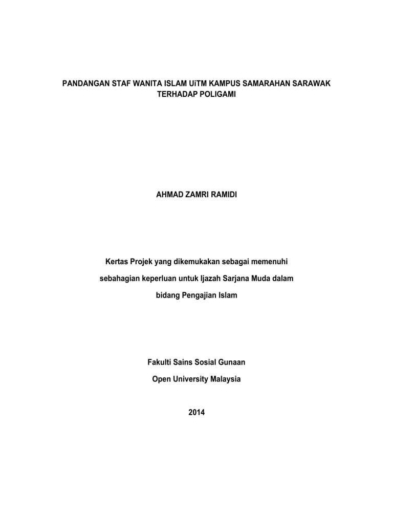 PANDANGAN STAF WANITA ISLAM UiTM KAMPUS SAMARAHAN SARAWAK TERHADAP POLIGAMI AHMAD ZAMRI RAMIDI Kertas Projek yang dikemukakan sebagai memenuhi sebahagian keperluan untuk Ijazah Sarjana Muda dalam bidang Pengajian Islam Fakulti Sains Sosial Gunaan Open University Malaysia 2014 BAB 1 PENGENALAN 1.0 Pendahuluan Agama Islam merupakan agama yang mengharuskan poligami. Namun demikian, dalam kalangan umat Islam itu sendiri tidak mengetahui hukum poligami yang sering disalahertikan oleh masyarakat khususnya dalam kalangan kaum wanita. Malah, keharusan berpoligami yang telah termaktub dalam al-Quran tidak difahami dengan jelas dan tepat oleh segelintir kaum lelaki yang ingin berpoligami. Kurangnya kefahaman tentang hukum serta syarat-syarat poligami telah menjadikan syariat ini dipandang negatif oleh masyarakat. Pihak yang mengamalkan poligami sewajarnya menepati syarat yang telah ditetapkan oleh syarak dan memahami secara tuntas kewajipan yang mereka perlu penuhi agar amalan poligami menepati konsep yang ditetapkan oleh syarak dan syariat ini tidak menjadi ‘trauma’ kepada kaum hawa yang terlibat dengan poligami (Hafiz Firdaus Abdullah, 2012). Poligami merupakan salah satu daripada bentuk perkahwinan yang disyariatkan oleh Islam. Dari sudut bahasa, poligami bermaksud menghimpunkan berbilang isteri dalam satu masa. Menurut Kamus Dewan Edisi Keempat (2007: 1222), poligami merupakan amalan beristeri lebih daripada satu orang pada masa yang sama. Takrifan poligami 1 menurut syariat Islam adalah lebih khusus daripada takrifan tersebut berdasarkan pengertian surah An-Nisa, ayat 3 yang bermaksud; “Dan jika kamu takut tidak berlaku adil terhadap perempuan-perempuan yatim (apabila kamu berkahwin dengan mereka), maka berkahwinlah (dengan) sesiapa yang kamu berkenan dari perempuan-perempuan (lain): dua, tiga, atau empat. Kemudian jika kamu bimbang tidak akan berlaku adil (di antara isteri-isteri kamu) maka (berkahwinlah dengan) seorang sahaja, atau (pakailah) hamba-hamba perempuan yang kamu miliki. Yang demikian itu adalah lebih dekat (untuk mencegah) supaya kamu tidak melakukan kezaliman”. Berpandukan maksud ayat di atas, Islam tidak mewajibkan poligami, tetapi menjadikannya sebagai harus. Namun keharusan ini bukanlah secara mutlak sebaliknya dikenakan syarat-syarat yang tertentu (Zaini Nasohah, 2000: 4). Ayat ini menentukan kadar yang dibolehkan untuk berpoligami, iaitu setakat empat orang isteri sahaja dalam satu-satu masa. Syarat-syarat lain turut termaktub dalam ayat ini, iaitu suami perlu berlaku adil dan berkemampuan. Sekiranya ia merasakan takut atau tidak dapat berlaku adil, maka Islam menggesa supaya seseorang lelaki itu berkahwin dengan seorang perempuan sahaja agar tidak berlaku penganiayaan dan kezaliman. Asmah Haji Omar (1979: 3) mentakrifkan poligami sebagai “kahwin lebih dari satu” dan yang mempunyai hak menjalankan kebiasaan itu ialah orang laki-laki. Poligami bukanlah terdapat hanya dalam agama dan masyarakat Islam, tetapi juga dalam agama dan masyarakat lain, misalnya dalam agama Kristian Morman, dalam kalangan orang-orang Cina, dan sebagainya. Walau bagaimanapun, dalam Islam poligami lebih kemas dan teratur dibandingkan dengan poligami yang ada dalam masyarakat lain. Misalnya, dalam agama 2 Islam poligami ada batas dalam jumlah isteri (yakni 4 orang sahaja) yang boleh dikahwini, ada syarat-syaratnya dan sebagainya. Selepas kedatangan Islam, poligami terus diamalkan oleh masyarakat dunia hinggalah ke hari ini. Walaupun demikian, golongan Barat telah memberikan kritikan yang tajam terhadap poligami yang dibenarkan oleh Islam. Yang menghairankan, mereka tidak mencela dan memandang jijik terhadap perzinaan dan perlakuan sumbang, malahan hubungan jenis luar tabii juga telah mula mereka terima dan hormati tetapi poligami yang halal dan telah diterima oleh agama-agama samawi dan masyarakat umat manusia sejak beribu tahun yang lalu mereka kecam. Mereka mengecam poligami tetapi membenarkan menyimpan perempuan simpanan (Mahmud Saedon Awang Othman, 1998: 64-65). Pada prinsipnya, perkahwinan menurut pandangan Islam adalah seorang isteri sahaja bagi seorang suami, kerana ia adalah bersesuaian dengan tabiat manusia dalam keadaan normal (Amran Kasimin, 1978: 9). Islam tidak menyuruh dan tidak menggalakkan umatnya berpoligami, tetapi ia merupakan suatu penyelesaian untuk mengatasi masalah dari jalan buntu yang akan berlaku setelah tidak ada jalan lain untuk mengatasi situasi tersebut, kecuali dengan poligami. Misalnya, untuk mendapatkan zuriat sekiranya isteri pertama atau kedua tidak berupaya untuk melahirkan zuriat atas sebab-sebab tertentu. Dalam Islam, poligami hanya dibenarkan sehingga empat orang isteri sahaja dalam satu masa. Suami yang mempunyai empat orang isteri tidak boleh berkahwin lagi, melainkan setelah salah seorang daripada isterinya yang sedia ada meninggal dunia atau diceraikan serta tamat eddahnya. Tidak boleh juga berpoligami dengan wanita yang mahram kepada isteri yang sedia ada (Irdhina@Martini binti Hj Wasli, 2013:1) Menurut Dr. Muhammad al-Bahi dalam bukunya yang diterjemahkan ke dalam bahasa Melayu oleh Fathurrahman (1988), poligami bukanlah suatu prinsip yang wajib 3 dilaksanakan dalam syariah Islam sehingga boleh menyebabkan berdosa jika tidak mengamalkannya. Poligami hanya merupakan perkara harus dan satu rukhsah (keringanan) dalam keadaan darurat. Jelasnya di sini walaupun bahasa yang digunakan dalam surah AnNisa (ayat 3) berunsur perintah, ia bukanlah membawa kepada makna wajib dilaksanakan. Bahkan jika diamati ia boleh membawa kepada suatu tegahan dan haram hukumnya jika suami yang berpoligami tidak berupaya berlaku adil dan mengakibatkan penganiayaan terhadap isteri yang dikahwini. 1.1 Latar Belakang Kajian Poligami hanya dikhususkan untuk kaum lelaki sahaja. Wanita tidak dibenarkan sama sekali bersuami lebih daripada seorang dalam satu masa (poliandri). Hal ini bagi mengelakkan daripada berlakunya percampuran nasab keturunan dan bagi melindungi kepentingan ka