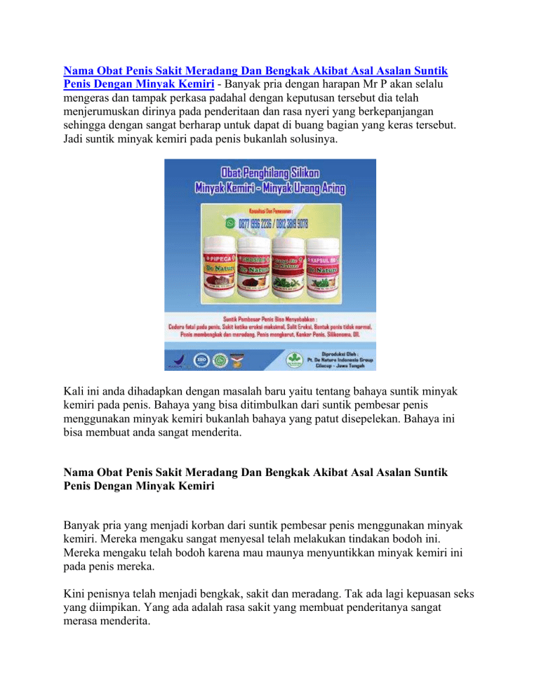 Nama Obat Penis Sakit Meradang Dan Bengkak Akibat Asal Asalan Suntik Penis Dengan Minyak Kemiri - Banyak pria dengan harapan Mr P akan selalu mengeras dan tampak perkasa padahal dengan keputusan tersebut dia telah menjerumuskan dirinya pada penderitaan dan rasa nyeri yang berkepanjangan sehingga dengan sangat berharap untuk dapat di buang bagian yang keras tersebut. Jadi suntik minyak kemiri pada penis bukanlah solusinya. Kali ini anda dihadapkan dengan masalah baru yaitu tentang bahaya suntik minyak kemiri pada penis. Bahaya yang bisa ditimbulkan dari suntik pembesar penis menggunakan minyak kemiri bukanlah bahaya yang patut disepelekan. Bahaya ini bisa membuat anda sangat menderita. Nama Obat Penis Sakit Meradang Dan Bengkak Akibat Asal Asalan Suntik Penis Dengan Minyak Kemiri Banyak pria yang menjadi korban dari suntik pembesar penis menggunakan minyak kemiri. Mereka mengaku sangat menyesal telah melakukan tindakan bodoh ini. Mereka mengaku telah bodoh karena mau maunya menyuntikkan minyak kemiri ini pada penis mereka. Kini penisnya telah menjadi bengkak, sakit dan meradang. Tak ada lagi kepuasan seks yang diimpikan. Yang ada adalah rasa sakit yang membuat penderitanya sangat merasa menderita. Selain itu masih banyak lagi bahaya yang bisa timbul dari suntik pembesar penis. Beberapa diantaranya yaitu seperti berikut ini: Cedera fatal pada penis. Sakit ketika ereksi maksimal. Bentuk penis akan berbeda dari bentuk umumnya. Meskipun terlihat besar, penis sulit untuk ereksi. Penis mengkerut. Bisa menyebabkan kanker. Bisa menyebabkan silikonoma. Penis menjadi kaku dan mengeras. Penis semakin memendek dalam jangka waktu tertentu. Terjadinya infeksi pada penis. Sakit dan tidak nyaman ketika melakukan hubungan intim. Timbul rasa nyeri yang tidak tertahankan pada penis. Penis terasa panas, sakit dan sangat perih jika sentuh. Penis akan mengalami infeksi parah bahkan sampai mengeluarkan nanah. Mengalami pendarahan. Menurunnya gairah seksual, lemah syahwat dan mudah terserang penyakit lainnya. Menyebabkan ketergantungan pada penyuntikan. Struktur saraf pada penis mengalami kerusakan. Dari semua bahaya di atas, tidak serta merta muncul setelah penyuntikkan. Setelah penyuntikkan yang ada adalah hasil yang memuaskan. Namun seiring berjalannya waktu barulah satu persatu bahaya di atas muncul. Jika sudah merasakan gejalanya maka disarankan untuk segera mengambil langkah pengobatan. Mengambil langkah pengobatan sejak dini dengan pengobatan yang tepat bisa membuat anda menjadi lebih cepat sembuh dan cepat terbebas dari penderitaan ini. Obat Penghilang Suntik Silikon/Minyak Kemiri/Urang Aring Herbal Alami Produk Herbal Gang Jie, Gho Siah, Pipeca Dan Kapsul BD merupakan produk eksklusif dari De Nature. Gang Jie POM TR. 173 300 491 Gho Siah POM TR. 173 305 881 Pipeca POM TR. 173399911 Kapsul BD POM TR. 163398401 Kegunaan Paket Herbal De Nature Ini : Memperbaiki sistem otot saraf yang rusak pada penis. Mencegah inflamasi atau pembengkakan pada penis. Mengurangi dan menghentikan rasa sakit. Bisa mengencangkan saraf-saraf kendur pada sistem produksi pria. Membuat kulit penis lebih elastis pada penderita suntik silikon atau suntik kemiri. Menghilangkan cairan silikon atau kemiri secara alami di alat vital. Melancarkan peredaran darah pada alat kelamin. Baik untuk menambah kesuburan sperma. Mengatasi katup mani yang bocor. Baik untuk mengatasi ereksi lemah dan menurun. Meningkatkan stamina. Mengatasi berbagai keluhan atau penyakit pada kelamin. Dan baik juga untuk mengatasi masalah penyakit di luar alat kelamin atau vitalitas seperti ginjal, darah tinggi, diabetes dll. De Nature Indonesia adalah sebuah perusahaan yang bergerak di bidang Obat Tradisional (OT) dari dalam Negeri, yang mencoba mengangkat dan menghidupkan kembali Budaya Nenek Moyang kita Yaitu Jamu Tradisional sebagai salah satu warisan leluhur budaya bangsa yang perlu dilestarikan. Produk De Nature dalam artikel ini khusus untuk mengatasi masalah kelamin / penyakit kelamin. Sekedar informasi untuk kenyamanan Konsumen, bahwa Produk dari perusahaan kami ini sudah memiliki: Ijin Resmi Perusahaan dari Kementerian Kesehatan Ijin BPOM, yang artinya sudah lulus uji stabilitas Produk Sertifikat Halal MUI, sehingga kehalalannya bisa dipertanggungjawabkan Apoteker Yang berpengalaman Sudah melewati Proses Sortir Bahan Baku, Guna Menjaga Mutu Produk Proses Produksi Sesuai Alur CPOTB (Cara Pembuatan Obat Tradisional Yang Baik Dan Benar) Sertifikat ISO 9001 : 2015 yang artinya sudah Berstandar Internasional Alamat PT. De Nature Indonesia di JL. Pahonjean Perum Cendana Asri No 9, Kecamatan Majenang, Kabupaten Cilacap, Jawa Tengah Kode Pos 53257. Pengiriman Herbal De Nature hanya 1 pintu yaitu dari Kantor Pusat De Nature (Majenang Cilacap Jawa Tengah). Kebijakan ini diambil untuk menjaga keaslian produk. Cara Pemesanan Obat De Nature: Pemasaran produk herbal kami secara online. Pelayanan pengiriman dilakukan baik dalam maupun luar negeri. Untuk dalam negeri mencakup seluruh wilayah selama dalam jangkauan jasa Tiki, JNE, J&T atau Pos Indonesia. Dan untuk luar negeri mencakup Singapore, Malaysia, Thailand, Brunai, Australia, Hongkong, Taiwan, Jepang, Korea Selatan, Inggris, Amerika Serikat (Negara yang tidak disebutkan bisa dicek dengan menghubungi kami). Pengiriman luar negeri dilakukan dengan POS EMS, SUHADA EXPRESS, ANTARAN EXPRESS, SKYNET, JPBAI, Dll. Semoga artikel ini bermanfaat untuk semuanya dan khususnya bagi anda yang sedang mencari informasi mengenai obat suntik silikon/minyak kemiri/urang aring. Untuk informasi lebih lanjut mengenai Produk dan Harga, Cara Pemesanan/ Konsultasi atau hal lainnya, anda dapat menghubungi kami melalui Telpon/WhatsApp/SMS (Online 24 jam / Fast Respon) pada nomor yang tertera pada gambar obat di atas. Penelusuran yang terkait dengan Nama Obat Penis Sakit Meradang Dan Bengkak Akibat Asal Asalan Suntik Penis Dengan Minyak Kemiri : operasi suntik minyak kemiri, gamat sebagai obat kelamin akibat suntik minyak kemiri, biaya operasi 