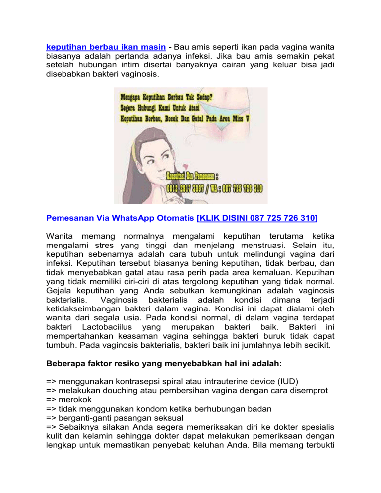 keputihan berbau ikan masin - Bau amis seperti ikan pada vagina wanita biasanya adalah pertanda adanya infeksi. Jika bau amis semakin pekat setelah hubungan intim disertai banyaknya cairan yang keluar bisa jadi disebabkan bakteri vaginosis. Pemesanan Via WhatsApp Otomatis [KLIK DISINI 087 725 726 310] Wanita memang normalnya mengalami keputihan terutama ketika mengalami stres yang tinggi dan menjelang menstruasi. Selain itu, keputihan sebenarnya adalah cara tubuh untuk melindungi vagina dari infeksi. Keputihan tersebut biasanya bening keputihan, tidak berbau, dan tidak menyebabkan gatal atau rasa perih pada area kemaluan. Keputihan yang tidak memiliki ciri-ciri di atas tergolong keputihan yang tidak normal. Gejala keputihan yang Anda sebutkan kemungkinan adalah vaginosis bakterialis. Vaginosis bakterialis adalah kondisi dimana terjadi ketidakseimbangan bakteri dalam vagina. Kondisi ini dapat dialami oleh wanita dari segala usia. Pada kondisi normal, di dalam vagina terdapat bakteri Lactobaciilus yang merupakan bakteri baik. Bakteri ini mempertahankan keasaman vagina sehingga bakteri buruk tidak dapat tumbuh. Pada vaginosis bakterialis, bakteri baik ini jumlahnya lebih sedikit. Beberapa faktor resiko yang menyebabkan hal ini adalah: => menggunakan kontrasepsi spiral atau intrauterine device (IUD) => melakukan douching atau pembersihan vagina dengan cara disemprot => merokok => tidak menggunakan kondom ketika berhubungan badan => berganti-ganti pasangan seksual => Sebaiknya silakan Anda segera memeriksakan diri ke dokter spesialis kulit dan kelamin sehingga dokter dapat melakukan pemeriksaan dengan lengkap untuk memastikan penyebab keluhan Anda. Bila memang terbukti vaginosis bakterialis, Anda akan diobati dengan antibiotik untuk jangka waktu tertentu. Silakan Anda lakukan anjuran berikut: => pakailah celana dalam dengan bahan yang mudah menyerap keringat => apabila celana dalam Anda basah atau jenuh karena keputihan, silakan ganti dengan yang bersih dan kering => hindari memakai celana dalam yang ketat => hindari pemakaian pembersih kewanitaan atau sabun yang beraroma kuat => hindari berganti-ganti pasangan => hindari berhubungan badan sampai Anda diobati dengan tuntas PENYEBAB YANG UMUM UNTUK KEPUTIHAN BAU BUSUK => Infeksi kencing nanah. Misalnya menghasilkan cairan kental bernanah dan berwarna kuning kehijauan. Yang disertai bau busuk dapat disebabkan oleh kanker. => Akibat jamur Candida albicans. Keputihan jenis ini memiliki ciri-ciri warna putih seperti susu cairan kental bau tak sedap dan sangat gatal. Terkadang dapat menimbulkan radang pada vagina sehingga kelihatan kemerahan. => Bakteri Vaginosis atau Gardnerella. Keputihan jenis ini memiliki ciri-ciri warna abu-abu tidak terlalu kental. Cairan berbuih mengeluarkan bau yang amis dan gatal yang mengganggu. => Parasit Trichomonas vaginalis. Keputihan jenis ini memiliki ciri-ciri warna kehijauan atau kuning. Cairan berbuih dan bau amis tidak menimbulkan gatal tetapi saat ditekan vagina akan terasa sakit. Keputihan ini dapat ditularkan melalui hubungan seks yang tidak sehat perlengkapan kamar mandi atau kloset. => Akibat virus. Keputihan jenis ini dapat diakibatkan oleh virus HIV Herpes atau Candyloma. Keputihan yang diakibatkan oleh jenis ini dapat memicu kanker rahim. Pada keputihan biasanya disertai tanda-tanda herpes seperti luka yang melepuh. Sedangkan pada keputihan candyloma disertai tandatanda candyloma berupa kutil-kutil yang tumbuh di vagina atau rahim. Penyakit herpes atau candyloma terkadang tidak terdeteksi secara dini. Karena umumnya tanda-tandanya tidak mudah terlihat karena muncul di dalam vagina. Solusi Mengatasi Keputihan Gatal dan Berbau busuk Dapat segera di tuntaskan Jika penyembuhan tepat dan tidak asal menggunakan obat. Obat herbal adalah cara efektif mengobati infeksi pada saluran kencing sampai tuntas. Hal ini di sampaikan pakar herbalis. Obat Herbal dapat meningkatkan sistem imun dan dapat mengembalikan metabolisme tubuh. Sehingga anda mempunyai dua keuntungan bila menggunakan obat herbal. Pemesanan Via WhatsApp Otomatis [KLIK DISINI 087 725 726 310] Alamat lengkap kami Jln. Raya Pahonjean Perumahan Cendana asri №9 / Kec. Majenang Kab. Cilacap Prov. Jawa Tengah. / Kode Pos: 53257. Produk yang kami tawarkan kali ini adalah. Obat yang berbahan herbal Dapat di konsumsi pada pria dan wanita. Tidak menimbulkan efek samping saat di konsumsi. Kesehatan lah yang paling utama. Segera konsultasi kan penyakit yang sedang bersarang dalam tubuh Anda. Karena hidup sehat tanpa adanya rasa sakit adalah dambaan setiap orang. SEGERA SEMBUHKAN PENYAKIT ANDA SEBELUM PARAH. UANG BISA DICARI DI KEMUDIAN HARI. NAMUN PENYAKIT AKAN SEMAKIN PARAH JIKA MENUNGGU DI KEMUDIAN HARI KARENA KESEHATAN LAH YANG UTAMA.
