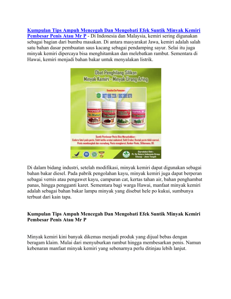 Kumpulan Tips Ampuh Mencegah Dan Mengobati Efek Suntik Minyak Kemiri Pembesar Penis Atau Mr P - Di Indonesia dan Malaysia, kemiri sering digunakan sebagai bagian dari bumbu masakan. Di antara masyarakat Jawa, kemiri adalah salah satu bahan dasar pembuatan saus kacang sebagai pendamping sayur. Selai itu juga minyak kemiri dipercaya bisa menghitamkan dan melebatkan rambut. Sementara di Hawai, kemiri menjadi bahan bakar untuk menyalakan listrik. Di dalam bidang industri, setelah modifikasi, minyak kemiri dapat digunakan sebagai bahan bakar diesel. Pada pabrik pengolahan kayu, minyak kemiri juga dapat berperan sebagai vernis atau pengawet kayu, campuran cat, kertas tahan air, bahan penghambat panas, hingga pengganti karet. Sementara bagi warga Hawai, manfaat minyak kemiri adalah sebagai bahan bakar lampu minyak yang disebut hele po kukui, sumbunya terbuat dari kain tapa. Kumpulan Tips Ampuh Mencegah Dan Mengobati Efek Suntik Minyak Kemiri Pembesar Penis Atau Mr P Minyak kemiri kini banyak dikemas menjadi produk yang dijual bebas dengan beragam klaim. Mulai dari menyuburkan rambut hingga membesarkan penis. Namun kebenaran manfaat minyak kemiri yang sebenarnya perlu ditinjau lebih lanjut. Trend menyuntikan minyak kemiri pada penis sebagai metode pembesar penis memang sedang menghebohkan jagad maya. Pasalnya suntik pembesar penis menggunakan minyak kemiri ini telah memakan banyak korban. Memperbesar penis tanpa pengetahuan medis. Nekat menyuntikkan cairan hanya bermodal cerita orang. Akhirnya mudah ditebak; fatal. Dua ratusan rekonstruksi penis karena kasus yang disebut parafinoma penis ini ditangani dr Boyke Soebhali SpU di Samarinda. Kasus itu dibawanya dalam pertemuan internasional dan menjadi yang terbaik. Minyak kemiri, minyak rambut, sampai minyak kasuari jadi bahan utama yang disuntikkan dalam Mr P. Setelah disuntik, alat kelamin akan mengalami reaksi peradangan. Hal itu yang membuat kulit penis mengeras. Tak selamanya menyenangkan. Boyke mengatakan, efek ini menimbulkan rasa nyeri saat berhubungan intim. “Pada beberapa kasus malah bisa menimbulkan kanker,” sebutnya. Efek samping dan berbagai bahaya menyuntikan sesuatu pada penis atau Mr. P : Cedera fatal pada penis. Sakit ketika ereksi maksimal. Bentuk penis akan berbeda dari bentuk umumnya. Meskipun terlihat besar, penis sulit untuk ereksi. Penis membengkak dan meradang. Penis mengkerut. Bisa menyebabkan kanker. Bisa menyebabkan silikonoma. Penis menjadi kaku dan mengeras. Penis semakin memendek dalam jangka waktu tertentu. Terjadinya infeksi pada penis. Sakit dan tidak nyaman ketika melakukan hubungan intim. Timbul rasa nyeri yang tidak tertahankan pada penis. Penis terasa panas, sakit dan sangat perih jika sentuh. Penis akan mengalami infeksi parah bahkan sampai mengeluarkan nanah. Mengalami pendarahan. Menurunnya gairah seksual, lemah syahwat dan mudah terserang penyakit lainnya. Menyebabkan ketergantungan pada penyuntikan. Struktur saraf pada penis mengalami kerusakan. Boyke mengatakan ada dua tahap operasi untuk menangani parafinoma penis. Pertama, membuang semua bagian yang mengeras. Kemudian penis ditanam ke dalam kantong zakar selama 3-6 bulan. Setelah itu, dilakukan operasi tahap kedua untuk mengembalikan bentuk atau rekonstruksi. Boyke menyebut, ada jeda waktu dari operasi satu ke dua sengaja dilakukan untuk menghilangkan proses peradangan. Obat Penghilang Suntik Silikon/Minyak Kemiri/Urang Aring Herbal Alami Ijinkan kami memberikan informasi mengenai cara menghilangkan silikon/minyak kemiri/urang aring dan berbagai penyakit pada kelamin secara alami dengan Obat Herbal De Nature. Paket Obat Herbal ini terdiri dari Gang Jie, Gho Siah, Pipeca, Kapsul BD. Obat berbahan dasar herbal dan diracik secara modern sesuai aturan BPOM. Atau dengan kata lain Obat alami ini sudah terdaftar resmi di BPOM. Produk Herbal Gang Jie, Gho Siah, Pipeca Dan Kapsul BD merupakan produk eksklusif dari De Nature. Gang Jie POM TR. 173 300 491 Gho Siah POM TR. 173 305 881 Pipeca POM TR. 173399911 Kapsul BD POM TR. 163398401 Kegunaan Paket Herbal De Nature Ini : Memperbaiki sistem otot saraf yang rusak pada penis. Mencegah inflamasi atau pembengkakan pada penis. Mengurangi dan menghentikan rasa sakit. Bisa mengencangkan saraf-saraf kendur pada sistem produksi pria. Membuat kulit penis lebih elastis pada penderita suntik silikon atau suntik kemiri. Menghilangkan cairan silikon atau kemiri secara alami di alat vital. Melancarkan peredaran darah pada alat kelamin. Baik untuk menambah kesuburan sperma. Mengatasi katup mani yang bocor. Baik untuk mengatasi ereksi lemah dan menurun. Meningkatkan stamina. Mengatasi berbagai keluhan atau penyakit pada kelamin. Dan baik juga untuk mengatasi masalah penyakit di luar alat kelamin atau vitalitas seperti ginjal, darah tinggi, diabetes dll. Untuk informasi lebih lanjut mengenai Produk dan Harga, Cara Pemesanan/ Konsultasi atau hal lainnya, anda dapat menghubungi kami melalui Telpon/WhatsApp/SMS (Online 24 jam / Fast Respon) pada nomor yang tertera pada gambar obat di atas. Kumpulan Tips Ampuh Mencegah Dan Mengobati Efek Suntik Minyak Kemiri Pembesar Penis Atau Mr P De Nature Indonesia adalah sebuah perusahaan yang bergerak di bidang Obat Tradisional (OT) dari dalam Negeri, yang mencoba mengangkat dan menghidupkan kembali Budaya Nenek Moyang kita Yaitu Jamu Tradisional sebagai salah satu warisan leluhur budaya bangsa yang perlu dilestarikan. Produk De Nature dalam artikel ini khusus untuk mengatasi masalah kelamin / penyakit kelamin. Sekedar informasi untuk kenyamanan Konsumen, bahwa Produk dari perusahaan kami ini sudah memiliki: Ijin Resmi Perusahaan dari Kementerian Kesehatan Ijin BPOM, yang artinya sudah lulus uji stabilitas Produk Sertifikat Halal MUI, sehingga kehalalannya bisa dipertanggungjawabkan Apoteker Yang berpengalaman Sudah melewati Proses Sortir Bahan Baku, Guna Menjaga Mutu Produk Proses Produksi Sesuai Alur CPOTB (Cara Pembuatan Obat Tradisional Yang Baik Dan Benar) Sertifikat ISO 9001 : 2015 yang 
