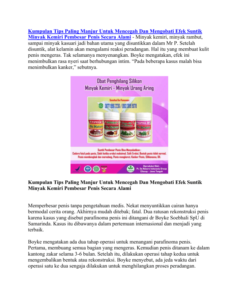 Kumpulan Tips Paling Manjur Untuk Mencegah Dan Mengobati Efek Suntik Minyak Kemiri Pembesar Penis Secara Alami - Minyak kemiri, minyak rambut, sampai minyak kasuari jadi bahan utama yang disuntikkan dalam Mr P. Setelah disuntik, alat kelamin akan mengalami reaksi peradangan. Hal itu yang membuat kulit penis mengeras. Tak selamanya menyenangkan. Boyke mengatakan, efek ini menimbulkan rasa nyeri saat berhubungan intim. “Pada beberapa kasus malah bisa menimbulkan kanker,” sebutnya. Kumpulan Tips Paling Manjur Untuk Mencegah Dan Mengobati Efek Suntik Minyak Kemiri Pembesar Penis Secara Alami Memperbesar penis tanpa pengetahuan medis. Nekat menyuntikkan cairan hanya bermodal cerita orang. Akhirnya mudah ditebak; fatal. Dua ratusan rekonstruksi penis karena kasus yang disebut parafinoma penis ini ditangani dr Boyke Soebhali SpU di Samarinda. Kasus itu dibawanya dalam pertemuan internasional dan menjadi yang terbaik. Boyke mengatakan ada dua tahap operasi untuk menangani parafinoma penis. Pertama, membuang semua bagian yang mengeras. Kemudian penis ditanam ke dalam kantong zakar selama 3-6 bulan. Setelah itu, dilakukan operasi tahap kedua untuk mengembalikan bentuk atau rekonstruksi. Boyke menyebut, ada jeda waktu dari operasi satu ke dua sengaja dilakukan untuk menghilangkan proses peradangan. EFEK SAMPING SUNTIK PEMBESAR PENIS Suntik pembesar penis pada awalnya memang memberikan hasil yang memuaskan. Bagaimana tidak, dengan budget yang murah penis bisa menjadi lebih besar dari semula secara instan. Tetapi, sayangnya hasil yang membahagiakan ini hanya berlaku sementara dan selebihnya adalah resiko permanen jika tidak diobati. Efek samping dan berbagai bahaya menyuntikan sesuatu pada penis atau Mr. P : Cedera fatal pada penis. Sakit ketika ereksi maksimal. Bentuk penis akan berbeda dari bentuk umumnya. Meskipun terlihat besar, penis sulit untuk ereksi. Penis membengkak dan meradang. Penis mengkerut. Bisa menyebabkan kanker. Bisa menyebabkan silikonoma. Penis menjadi kaku dan mengeras. Penis semakin memendek dalam jangka waktu tertentu. Terjadinya infeksi pada penis. Sakit dan tidak nyaman ketika melakukan hubungan intim. Timbul rasa nyeri yang tidak tertahankan pada penis. Penis terasa panas, sakit dan sangat perih jika sentuh. Penis akan mengalami infeksi parah bahkan sampai mengeluarkan nanah. Mengalami pendarahan. Menurunnya gairah seksual, lemah syahwat dan mudah terserang penyakit lainnya. Menyebabkan ketergantungan pada penyuntikan. Struktur saraf pada penis mengalami kerusakan. Selain menempuh jalan operasi sebagai pengobatan keluhan dari suntik pembesar penis, ternyata anda juga bisa menggunakan pengobatan alami sebagai pilihan lainnya. Pilihlah pengobatan yang tepat dan segera lakukan pengobatan itu sekarang juga sebelum semuanya terlambat. Obat Penghilang Suntik Silikon/Minyak Kemiri/Urang Aring Herbal Alami Ijinkan kami memberikan informasi mengenai cara menghilangkan silikon/minyak kemiri/urang aring dan berbagai penyakit pada kelamin secara alami dengan Obat Herbal De Nature. Paket Obat Herbal ini terdiri dari Gang Jie, Gho Siah, Pipeca, Kapsul BD. Obat berbahan dasar herbal dan diracik secara modern sesuai aturan BPOM. Atau dengan kata lain Obat alami ini sudah terdaftar resmi di BPOM. Produk Herbal Gang Jie, Gho Siah, Pipeca Dan Kapsul BD merupakan produk eksklusif dari De Nature. Gang Jie POM TR. 173 300 491 Gho Siah POM TR. 173 305 881 Pipeca POM TR. 173399911 Kapsul BD POM TR. 163398401 Kegunaan Paket Herbal De Nature Ini : Memperbaiki sistem otot saraf yang rusak pada penis. Mencegah inflamasi atau pembengkakan pada penis. Mengurangi dan menghentikan rasa sakit. Bisa mengencangkan saraf-saraf kendur pada sistem produksi pria. Membuat kulit penis lebih elastis pada penderita suntik silikon atau suntik kemiri. Menghilangkan cairan silikon atau kemiri secara alami di alat vital. Melancarkan peredaran darah pada alat kelamin. Baik untuk menambah kesuburan sperma. Mengatasi katup mani yang bocor. Baik untuk mengatasi ereksi lemah dan menurun. Meningkatkan stamina. Mengatasi berbagai keluhan atau penyakit pada kelamin. Dan baik juga untuk mengatasi masalah penyakit di luar alat kelamin atau vitalitas seperti ginjal, darah tinggi, diabetes dll. Untuk informasi lebih lanjut mengenai Produk dan Harga, Cara Pemesanan/ Konsultasi atau hal lainnya, anda dapat menghubungi kami melalui Telpon/WhatsApp/SMS (Online 24 jam / Fast Respon) pada nomor yang tertera pada gambar obat di atas. Kumpulan Tips Paling Manjur Untuk Mencegah Dan Mengobati Efek Suntik Minyak Kemiri Pembesar Penis Secara Alami De Nature Indonesia adalah sebuah perusahaan yang bergerak di bidang Obat Tradisional (OT) dari dalam Negeri, yang mencoba mengangkat dan menghidupkan kembali Budaya Nenek Moyang kita Yaitu Jamu Tradisional sebagai salah satu warisan leluhur budaya bangsa yang perlu dilestarikan. Produk De Nature dalam artikel ini khusus untuk mengatasi masalah kelamin / penyakit kelamin. Sekedar informasi untuk kenyamanan Konsumen, bahwa Produk dari perusahaan kami ini sudah memiliki: Ijin Resmi Perusahaan dari Kementerian Kesehatan Ijin BPOM, yang artinya sudah lulus uji stabilitas Produk Sertifikat Halal MUI, sehingga kehalalannya bisa dipertanggungjawabkan Apoteker Yang berpengalaman Sudah melewati Proses Sortir Bahan Baku, Guna Menjaga Mutu Produk Proses Produksi Sesuai Alur CPOTB (Cara Pembuatan Obat Tradisional Yang Baik Dan Benar) Sertifikat ISO 9001 : 2015 yang artinya sudah Berstandar Internasional Alamat PT. De Nature Indonesia di JL. Pahonjean Perum Cendana Asri No 9, Kecamatan Majenang, Kabupaten Cilacap, Jawa Tengah Kode Pos 53257. Cara Pemesanan Obat De Nature: Pemasaran produk herbal kami secara online. Pelayanan pengiriman dilakukan baik dalam maupun luar negeri. Untuk dalam negeri mencakup seluruh wilayah selama dalam jangkauan jasa Tiki, JNE, J&T atau Pos Indonesia. Dan untuk luar negeri mencakup Singapore, Malaysia, Thailand, Brunai, Australia, Hongkong, Taiwan, Jepang, Korea Selatan, Inggris, 