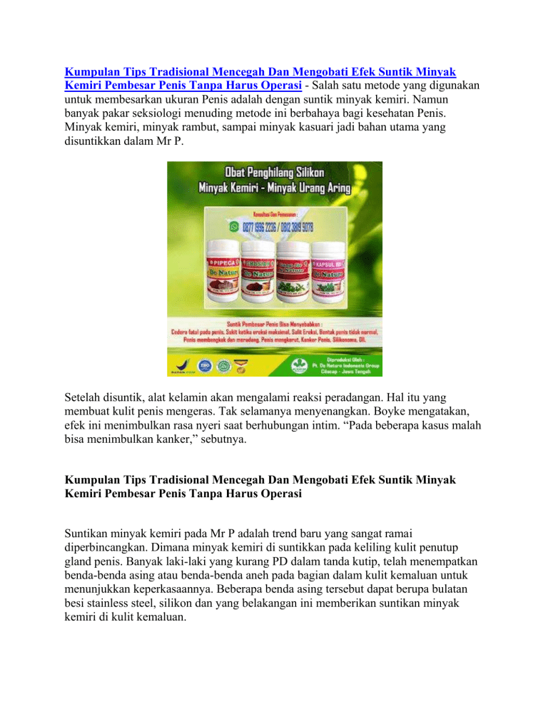 Kumpulan Tips Tradisional Mencegah Dan Mengobati Efek Suntik Minyak Kemiri Pembesar Penis Tanpa Harus Operasi - Salah satu metode yang digunakan untuk membesarkan ukuran Penis adalah dengan suntik minyak kemiri. Namun banyak pakar seksiologi menuding metode ini berbahaya bagi kesehatan Penis. Minyak kemiri, minyak rambut, sampai minyak kasuari jadi bahan utama yang disuntikkan dalam Mr P. Setelah disuntik, alat kelamin akan mengalami reaksi peradangan. Hal itu yang membuat kulit penis mengeras. Tak selamanya menyenangkan. Boyke mengatakan, efek ini menimbulkan rasa nyeri saat berhubungan intim. “Pada beberapa kasus malah bisa menimbulkan kanker,” sebutnya. Kumpulan Tips Tradisional Mencegah Dan Mengobati Efek Suntik Minyak Kemiri Pembesar Penis Tanpa Harus Operasi Suntikan minyak kemiri pada Mr P adalah trend baru yang sangat ramai diperbincangkan. Dimana minyak kemiri di suntikkan pada keliling kulit penutup gland penis. Banyak laki-laki yang kurang PD dalam tanda kutip, telah menempatkan benda-benda asing atau benda-benda aneh pada bagian dalam kulit kemaluan untuk menunjukkan keperkasaannya. Beberapa benda asing tersebut dapat berupa bulatan besi stainless steel, silikon dan yang belakangan ini memberikan suntikan minyak kemiri di kulit kemaluan. Banyak pria yang meminta agar kondisi Mr P kembali ke keadaan normal seperti sebelum di suntik minyak kemiri... Banyak yang meminta bagian yang keras pada kulit ini dibuang biar kondisinya kembali seperti semula, karena kemaluannya menjadi nyeri dan kerap mengalami infeksi dan bernanah. Sehingga malah hubungan suami istri jadi terganggu. Selain itu juga menyuntikkan sesuatu pada penis bisa menyebabkan berbagai gangguan kesehatan seperti berikut ini : Cedera fatal pada penis. Sakit ketika ereksi maksimal. Bentuk penis akan berbeda dari bentuk umumnya. Meskipun terlihat besar, penis sulit untuk ereksi. Penis membengkak dan meradang. Penis mengkerut. Bisa menyebabkan kanker. Bisa menyebabkan silikonoma. Penis menjadi kaku dan mengeras. Penis semakin memendek dalam jangka waktu tertentu. Terjadinya infeksi pada penis. Sakit dan tidak nyaman ketika melakukan hubungan intim. Timbul rasa nyeri yang tidak tertahankan pada penis. Penis terasa panas, sakit dan sangat perih jika sentuh. Penis akan mengalami infeksi parah bahkan sampai mengeluarkan nanah. Mengalami pendarahan. Menurunnya gairah seksual, lemah syahwat dan mudah terserang penyakit lainnya. Menyebabkan ketergantungan pada penyuntikan. Struktur saraf pada penis mengalami kerusakan. Jadi bagi siapa saja yang ingin melakukan suntik pembesar penis apalagi melakukan tidak dalam pengawasan dokter ahli, sebaiknya berpikirlah seribu kali karena selain manfaatnya yang sangat sedikit tetapi dampak yang akan di timbulkan sangatlah besar jika terjadi komplikasi nantinya. Obat Penghilang Suntik Silikon/Minyak Kemiri/Urang Aring Herbal Alami Produk Herbal Gang Jie, Gho Siah, Pipeca Dan Kapsul BD merupakan produk eksklusif dari De Nature. Gang Jie POM TR. 173 300 491 Gho Siah POM TR. 173 305 881 Pipeca POM TR. 173399911 Kapsul BD POM TR. 163398401 Kegunaan Paket Herbal De Nature Ini : Memperbaiki sistem otot saraf yang rusak pada penis. Mencegah inflamasi atau pembengkakan pada penis. Mengurangi dan menghentikan rasa sakit. Bisa mengencangkan saraf-saraf kendur pada sistem produksi pria. Membuat kulit penis lebih elastis pada penderita suntik silikon atau suntik kemiri. Menghilangkan cairan silikon atau kemiri secara alami di alat vital. Melancarkan peredaran darah pada alat kelamin. Baik untuk menambah kesuburan sperma. Mengatasi katup mani yang bocor. Baik untuk mengatasi ereksi lemah dan menurun. Meningkatkan stamina. Mengatasi berbagai keluhan atau penyakit pada kelamin. Dan baik juga untuk mengatasi masalah penyakit di luar alat kelamin atau vitalitas seperti ginjal, darah tinggi, diabetes dll. Untuk informasi lebih lanjut mengenai Produk dan Harga, Cara Pemesanan/ Konsultasi atau hal lainnya, anda dapat menghubungi kami melalui Telpon/WhatsApp/SMS (Online 24 jam / Fast Respon) pada nomor yang tertera pada gambar obat di atas. Sekedar informasi untuk kenyamanan Konsumen, bahwa Produk dari perusahaan kami ini sudah memiliki: Ijin Resmi Perusahaan dari Kementerian Kesehatan Ijin BPOM, yang artinya sudah lulus uji stabilitas Produk Sertifikat Halal MUI, sehingga kehalalannya bisa dipertanggungjawabkan Apoteker Yang berpengalaman Sudah melewati Proses Sortir Bahan Baku, Guna Menjaga Mutu Produk Proses Produksi Sesuai Alur CPOTB (Cara Pembuatan Obat Tradisional Yang Baik Dan Benar) Sertifikat ISO 9001 : 2015 yang artinya sudah Berstandar Internasional Semoga artikel ini bermanfaat untuk semuanya dan khususnya bagi anda yang sedang mencari informasi mengenai obat suntik silikon/minyak kemiri/urang aring. Penelusuran yang terkait dengan Kumpulan Tips Tradisional Mencegah Dan Mengobati Efek Suntik Minyak Kemiri Pembesar Penis Tanpa Harus Operasi : cara alami menghilangkan suntikan minyak kemiri, gamat sebagai obat kelamin akibat suntik minyak kemiri, tips suntik silikon, biaya operasi buang silikon, biaya operasi memperbesar alat vital, Bahaya Suntik Minyak Kemiri Pada Penis, cara mengeluarkan minyak kemiri dari penis