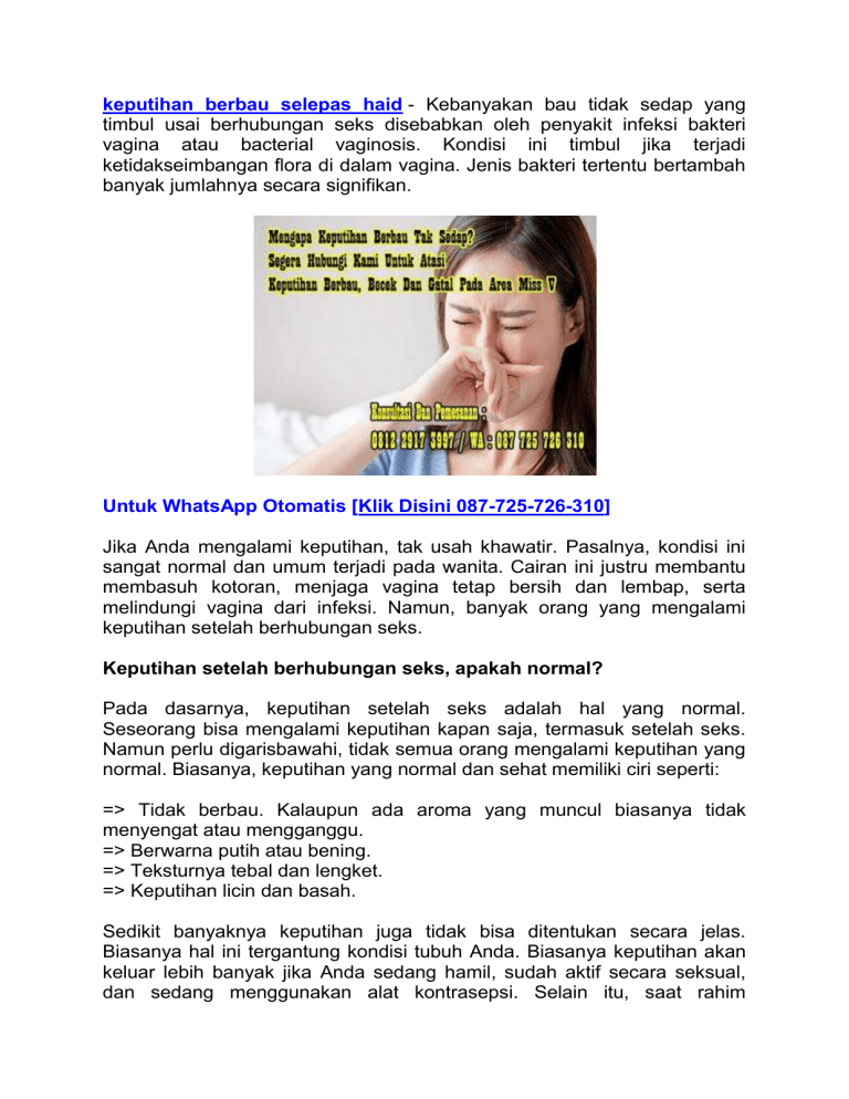 keputihan berbau selepas haid - Kebanyakan bau tidak sedap yang timbul usai berhubungan seks disebabkan oleh penyakit infeksi bakteri vagina atau bacterial vaginosis. Kondisi ini timbul jika terjadi ketidakseimbangan flora di dalam vagina. Jenis bakteri tertentu bertambah banyak jumlahnya secara signifikan. Untuk WhatsApp Otomatis [Klik Disini 087-725-726-310] Jika Anda mengalami keputihan, tak usah khawatir. Pasalnya, kondisi ini sangat normal dan umum terjadi pada wanita. Cairan ini justru membantu membasuh kotoran, menjaga vagina tetap bersih dan lembap, serta melindungi vagina dari infeksi. Namun, banyak orang yang mengalami keputihan setelah berhubungan seks. Keputihan setelah berhubungan seks, apakah normal? Pada dasarnya, keputihan setelah seks adalah hal yang normal. Seseorang bisa mengalami keputihan kapan saja, termasuk setelah seks. Namun perlu digarisbawahi, tidak semua orang mengalami keputihan yang normal. Biasanya, keputihan yang normal dan sehat memiliki ciri seperti: => Tidak berbau. Kalaupun ada aroma yang muncul biasanya tidak menyengat atau mengganggu. => Berwarna putih atau bening. => Teksturnya tebal dan lengket. => Keputihan licin dan basah. Sedikit banyaknya keputihan juga tidak bisa ditentukan secara jelas. Biasanya hal ini tergantung kondisi tubuh Anda. Biasanya keputihan akan keluar lebih banyak jika Anda sedang hamil, sudah aktif secara seksual, dan sedang menggunakan alat kontrasepsi. Selain itu, saat rahim berovulasi, Anda juga biasanya akan sering mengalami keputihan yang basah dan licin selama beberapa hari. Kapan keputihan dikatakan tidak normal? Jika setelah berhubungan Anda sering mengalami keputihan tetapi tak seperti ciri-ciri yang telah disebutkan sebelumnya, Anda perlu berhati-hati. Pasalnya, keputihan juga bisa jadi penanda masalah kesehatan organ reproduksi Anda. Biasanya Anda bisa mengecek normal atau tidaknya keputihan dari warna, tekstur, dan baunya. Keputihan berwarna merah Jika Anda mengalami keputihan setelah berhubungan dan warnanya merah maka waspada. Biasanya, warna merah menandakan adanya perdarahan. Perdarahan bisa jadi kondisi serius tetapi bisa jadi tidak. Terkadang, kondisi ini juga bisa menjadi tanda awal kanker endometrium. Untuk itu, segera konsultasikan ke dokter jika mengalaminya. Keputihan berwarna putih atau kekuningan Jika Anda mengalami keputihan berwarna putih atau kekuningan dengan tekstur pekat, tebal, dan bau yang kuat, bisa jadi ini adalah infeksi. Kondisi ini umumnya menandakan adanya infeksi jamur vagina. Umumnya, kondisi ini bisa menyebabkan gatal atau iritasi. Keputihan berwarna kuning-kehijauan Jika keputihan berwarna kuning kehijauan biasanya kondisi ini menandakan infeksi bakteri atau penyakit kelamin yang menular. Apalagi jika teksturnya tebal, menggumpal, dan berbau busuk. Keputihan berwarna merah muda Keputihan yang berwarna merah muda biasanya mengandung sedikit darah. Kondisi ini bisa menjadi tanda perdarahan di awal kehamilan. Namun, ketika Anda mengalami hal ini setelah berhubungan seks bisa jadi ada robekan kecil di vagina atau leher rahim. Akibatnya, keputihan Anda berwarna merah muda. Abu-abu Keputihan juga bisa berwarna abu-abu. Biasanya, kondisi ini menandai adanya gejala infeksi bakteri vagina yang disebut bacterial vaginosis. Selain keputihan yang berwarna abu, kondisi ini juga menyebabkan berbagai gejala lain seperti: - Gatal - Vagina dan keputihan berbau tak sedap - Kemerahan di sekitar vulva atau bukaan vagina Jika Anda mengalami hal ini, segera konsultasikan ke dokter. Biasanya, dokter akan meresepkan antibiotik jika Anda positif mengalami infeksi bakteri vagina. Pengobatan Alternatif Yang Saat Ini Paling Digandrungi Yaitu Produk Herbal Denature Kami memberikan solusi atasi penyakit yang anda derita menggunakan obat khusus untuk penyakit gonore de nature indonesia. Segera obati penyakit anda sebelum menyerang organ tubuh yang lain dan semakin susah disembuhkan jadi anda juga tak perlu khawatir karena obat herbal de nature yang kami produksi ini berbahan 100% herbal jadi aman dan tanpa efek samping. Pusat obat herbal yang terpercaya dan satunya obat yang paling aman tanpa efek samping, salah satu ke unggulan de nature indonesia adalah, seperti yang kami jelaskan di atas De Nature Indonesia adalah sebuah perusahaan yang bergerak di bidang Obat Tradisional (OT) dari dalam Negeri, yang mencoba mengangkat dan menghidupkan kembali Budaya Nenek Moyang kita Yaitu Jamu Tradisional sebagai salah satu warisan leluhur budaya bangsa yang perlu dilestarikan. Seiring berkembangnya Pt. De Nature Indonesia Group sangat banyak pertanyaan mengenai produk obat De Nature Indonesia, detail produk, hingga harga obat De Nature Indonesia. De Nature Indonesia akan memberikan informasi mengenai list atau daftar obat penyakit kelamin De Nature Indonesia menyediakan obat herbal pilihan berkualitas yang semuanya sudah terdaftar di BPOM, Depkes RI, dan sudah bersertifikat Halal MUI. Untuk WhatsApp Otomatis [Klik Disini 087-725-726-310] Terdiri dari : 1 Botol Kapsul Gang Jie @50 Kapsul 1 Botol Kapsul Gho Siah @50 Kapsul 1 Botol Kapsul Gurah V @50 Kapsul Dosis / Cara Penggunaan : Kapsul Gang Jie 3x Sehari 2 Kapsul Sebelum Makan Kapsul Gho Siah 3x Sehari 2 Kapsul Sebelum Makan Kapsul Gurah V 3x Sehari 2 Kapsul Sebelum Makan Harga Obat : Rp 445.000 Sedangkan untuk khasiat Paket lengkap De Nature sebagai berikut: => Kapsul Gang Jie - Sangat bagus untuk memulihkan stamina, memperbaiki jaringan sel pada bagian uretic dan menjaga kesehatan tubuh. => Kapsul Gho Siah - Sangat bagus untuk anti virus, mengobati infeksi pada saluran kencing dan menjaga kesehatan tubuh. => Kapsul Pipeca - atau disebut juga kapsul sirih merah untuk mengobati radang pada kelamin yang diakibatkan infeksi jamur, virus dan bakteri. Daun sirih merah berfungsi sebagai antioksidan sekaligus antiseptik alami yang dapat mencegah dan melawan virus dan jamur penyebab infeksi kelamin. => Kapsul Bersih Darah - berkhasiat menormalkan tekanan darah, menghancurkan kolester