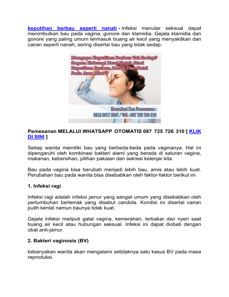 keputihan berbau seperti nanah - Infeksi menular seksual dapat menimbulkan bau pada vagina, gonore dan klamidia. Gejala klamidia dan gonore yang paling umum termasuk buang air kecil yang menyakitkan dan cairan seperti nanah, sering disertai bau yang tidak sedap. Pemesanan MELALUI WHATSAPP OTOMATIS 087 725 726 310 [ KLIK DI SINI ] Setiap wanita memiliki bau yang berbeda-beda pada vaginanya. Hal ini dipengaruhi oleh kombinasi bakteri alami yang berada di saluran vagina, makanan, kebersihan, pilihan pakaian dan sekresi kelenjar kita. Bau pada vagina bisa berubah menjadi lebih bau, amis atau lebih kuat. Perubahan bau pada wanita bisa disebabkan oleh faktor-faktor berikut ini 1. Infeksi ragi Infeksi ragi adalah infeksi jamur yang sangat umum yang disebabkan oleh pertumbuhan berlemak yang disebut candida. Kondisi ini disertai cairan putih kental namun baunya tidak kuat. Gejala infeksi meliputi gatal vagina, kemerahan, terbakar dan nyeri saat buang air kecil atau hubungan seksual. Infeksi ini dapat diobati dengan obat anti-jamur. 2. Bakteri vaginosis (BV) kebanyakan wanita akan mengalami setidaknya satu kasus BV pada masa reproduksi. Penyebabnya tidak diketahui, tapi seks tanpa kondom dan sering douching (mencuci vagina) dapat membuat Anda berisiko tinggi. Gejala lainnya meliputi rasa gatal dan nyeri. Bakteri vaginosis dapat menyebabkan amis dan berbau busuk. Bau ini biasanya paling menonjol setelah melakukan hubungan seksual. Beberapa kasus BV akan hilang sendiri, namun agar semua wanita dengan gejala BV memeriksakan ke dokter guna mencegah komplikasi serius. Pengobatan untuk BV biasanya menggunakan antibiotik. 3. Infeksi menular seksual Infeksi menular seksual dapat menimbulkan bau pada vagina, gonore dan klamidia. Gejala klamidia dan gonore yang paling umum termasuk buang air kecil yang menyakitkan dan cairan seperti nanah, sering disertai bau yang tidak sedap. Wanita yang terinfeksi IMS memiliki cairan kehijauan dengan bau busuk disertai rasa sakit saat buang air kecil. Infeksi ini dapat diobati dengan antibiotik. 4. Penyakit radang panggul Penyakit peradangan pelvis adalah infeksi organ reproduksi wanita yang mungkin timbul sebagai komplikasi penyakit menular seksual seperti klamidia atau gonore. Penyakit radang panggul juga dapat menyebabkan bau feminin. Gejala infeksi ini mungkin termasuk kotoran vagina berbau busuk, nyeri dengan hubungan intim dan nyeri perut dan pelvis. Biasanya penyakit ini diobati dengan antibiotik, meski bisa meninggalkan jaringan bekas luka yang memiliki efek jangka panjang. Efek jangka panjang termasuk rasa sakit kronis, infertilitas atau kehamilan ektopik. PENGOBATAN INFEKSI SALURAN KEMIH/ISK, GONORE/KENCING NANAH, SIPILIS/RAJA SINGA => Wanita berisiko lebih besar terkena komplikasi jangka panjang dari infeksi yang tidak diobati. Infeksi yang tidak diobati dengan gonore pada wanita dapat menaiki saluran reproduksi wanita dan melibatkan rahim, saluran tuba, dan ovarium. Kondisi ini dikenal sebagai penyakit radang panggul (PID) dan dapat menyebabkan sakit parah dan kronis serta merusak organ reproduksi wanita. PID bisa juga disebabkan oleh penyakit menular seksual lainnya. => Wanita juga dapat mengembangkan pemblokiran atau bekas luka tuba falopi, yang dapat mencegah kehamilan di masa depan atau menyebabkan kehamilan ektopik. Kehamilan ektopik terjadi saat sel telur membuahi di luar rahim. Infeksi Gonore bisa terjadi pada bayi yang baru lahir saat melahirkan. => Pria mungkin mengalami jaringan parut pada uretra. Pria juga bisa mengalami abses yang menyakitkan di bagian dalam penis. Infeksi dapat menyebabkan berkurangnya kesuburan atau kemandulan. Ketika infeksi gonore menyebar ke aliran darah, pria dan wanita dapat mengalami artritis, kerusakan katup jantung, atau pembengkakan lapisan otak atau sumsum tulang belakang. Kondisi ini jarang tapi serius. Obat Infeksi Saluran Kemih (ISK), Gonore/Kencing Nanah, Sipilis/Raja Singa, Keputihan Berbau Tak Sedap. Pemesanan MELALUI WHATSAPP OTOMATIS 087 725 726 310 [ KLIK DI SINI ] Obat Gang Jie & Gurah V de Nature dimana khasiat dan keampuhannya pun sama namun produk obat herbal gang jie Gurah V ini khusus untuk pengobatan dari dalam yang berfungsi untuk mengobati gejala gejala awal sipilis, raja singa, dan bisa membantu menyembuhkan sipilis, raja singa, kencing nanah, dan gonore untuk itulah khasiat dan keampuhannya sudah tidak untuk di ragukan lagi. Kapsul Gang Jie & Gurah V yang sudah mendapat izin dari MUI dan sudah bersertefikat halal dan sudah memenuhi setandar pembuatan obat yang baik dan benar serta kandungan terdiri dari bahan herbal yang sblumnya telah teruji dapat membantu untuk penanagan penyakit kelamin, salah satunya daun sambiloto, akar alang-alang, dan ektrak cacing tanah, daun kumis kucing. atupun sudah terdaftar di BPOM (badan pengawasan obat dan makanan). KHASIAT OBAT HERBAL GANG JIE Gurah V DE NATURE : 1. Mengatasi keluar cairan kental dari lupang kelamin 2. Untuk mengatasi kencing terasa sakit 3. kencing keluar lendir seperti nanah 4. kencing keluar nanah dan terasa perih 5. Mengatasi kencing bercampur nanah 6. Mengatasi vagina keluar cairan kekuningan 7. Mengtasi keputihan yang bau 8. Mengatasi luka pada venis dan vagina 9. Mengatasi keluar cairan kehitaman dari vagina KELEBIHAN BELANJA ONLINE PADA KAMI DE NATURE INDONESIA 1. Setiap penyakit berbeda obatnya, jd obat kami khusus untuk penyakit itu sendiri! 2. Tanpa perlu pergi ke dokter (tidak malu saat ke dokter, hemat waktu, dll) 3. Hanya kami yang selalu mengutamakan ke puasan konsumen 4. Barang di kirim lewat Tiki, JNE,pos Kilat dan di bungkus rapih 5. Proses pengiriman cepat dan aman 6. Harga lebih murah dan tidak usah keluar rumah 7. Kualitas terbaik dan hasiat pasti 8. Tidak perlu disuntik Masa penyembuhannya singkat 9. Proses obat hanya 6 jam, 10. Obat di antar ke rumah atau tempat tugas. HARAP BACA SEBELUM PESAN: => Kami memberlakukan sistem transaksi online sebagaimana umumnya yaitu barang dikirim setelah kami menerima pembayaran => Kami akan mem