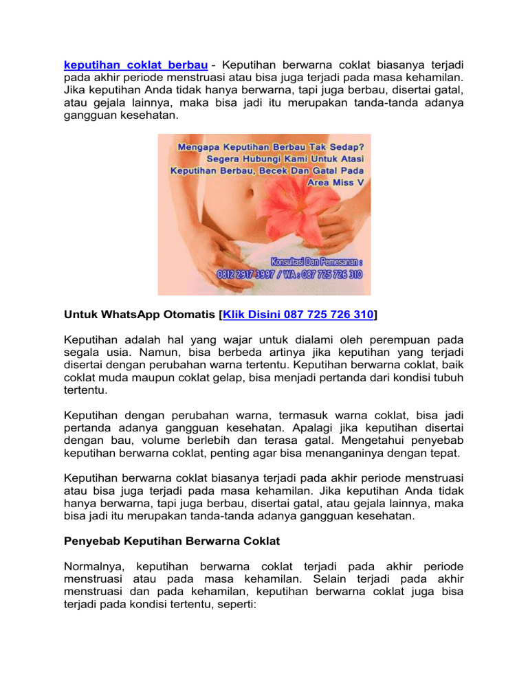 keputihan coklat berbau - Keputihan berwarna coklat biasanya terjadi pada akhir periode menstruasi atau bisa juga terjadi pada masa kehamilan. Jika keputihan Anda tidak hanya berwarna, tapi juga berbau, disertai gatal, atau gejala lainnya, maka bisa jadi itu merupakan tanda-tanda adanya gangguan kesehatan. Untuk WhatsApp Otomatis [Klik Disini 087 725 726 310] Keputihan adalah hal yang wajar untuk dialami oleh perempuan pada segala usia. Namun, bisa berbeda artinya jika keputihan yang terjadi disertai dengan perubahan warna tertentu. Keputihan berwarna coklat, baik coklat muda maupun coklat gelap, bisa menjadi pertanda dari kondisi tubuh tertentu. Keputihan dengan perubahan warna, termasuk warna coklat, bisa jadi pertanda adanya gangguan kesehatan. Apalagi jika keputihan disertai dengan bau, volume berlebih dan terasa gatal. Mengetahui penyebab keputihan berwarna coklat, penting agar bisa menanganinya dengan tepat. Keputihan berwarna coklat biasanya terjadi pada akhir periode menstruasi atau bisa juga terjadi pada masa kehamilan. Jika keputihan Anda tidak hanya berwarna, tapi juga berbau, disertai gatal, atau gejala lainnya, maka bisa jadi itu merupakan tanda-tanda adanya gangguan kesehatan. Penyebab Keputihan Berwarna Coklat Normalnya, keputihan berwarna coklat terjadi pada akhir periode menstruasi atau pada masa kehamilan. Selain terjadi pada akhir menstruasi dan pada kehamilan, keputihan berwarna coklat juga bisa terjadi pada kondisi tertentu, seperti: Pendarahan yang disebabkan implantasi janin Proses pelekatan telur yang telah dibuahi pada dinding rahim dapat menyebabkan keluarnya bercak darah yang dikenal sebagai bercak implantasi. Bercak perdarahan implantasi janin bisa berwarna merah, merah muda, atau coklat muda, dan merupakan tanda-tanda awal kehamilan. Keputihan yang tergolong normal ini bisa terjadi 10-14 hari setelah pembuahan. Atrofi vagina Kondisi yang juga dikenal sebagai vaginitis atrofi ini terjadi karena kekurangan hormon estrogen, dan paling sering terjadi setelah wanita memasuki masa menopause. Pada vaginitis atrofi, vagina mengalami peradangan dan produksi cairan lubrikasi menurun. Keluhan yang mungkin muncul, berupa sakit pada saat melakukan hubungan intim, vagina terasa kering, perih, dan mengeluarkan keputihan berwarna kecoklatan. Polip rahim Polip rahim juga bisa menjadi penyebab kemunculan keputihan berwarna coklat. Tidak hanya keputihan, gejala-gejala lain seperti perdarahan setelah melakukan hubungan intim atau perdarahan menstruasi yang banyak, juga bisa terjadi jika Anda mengalami polip rahim. Servisitis Meski mayoritas penderita servisitis (radang leher rahim) tidak merasakan gejala atau tanda apapun, beberapa penderita servisitis mungkin akan mengalami keputihan berwarna coklat atau keputihan mengandung darah. Gejala lain berupa frekuensi buang air kecil menjadi sering, buang air kecil terasa menyakitkan, hingga perdarahan dan nyeri saat berhubungan intim. Jika penyakit ini menyebar ke rahim atau indung telur, dapat menyebabkan radang panggul (PID). Kanker serviks Keputihan berwarna coklat dapat menjadi tanda adanya kanker serviks. Tanda lain kanker serviks yaitu nyeri di bagian bawah perut atau panggul, nyeri saat berhubungan seksual, perdarahan dari vagina di luar periode menstruasi atau setelah menopause, dan saat berhubungan seksual. Cara Mengobati Keputihan Berwarna Coklat Penanganan keputihan berwarna coklat perlu disesuaikan dengan kondisi atau penyakit yang mendasarinya. Berikut ini adalah beberapa cara untuk mengatasi keputihan berwarna coklat sesuai penyebabnya: Implantasi janin Umumnya keputihan berwarna coklat yang disebabkan karena implantasi janin akan berhenti dengan sendirinya. Namun jika keputihan berwarna coklat terus terjadi atau disertai keluarnya darah dengan volume yang banyak, disarankan untuk berkonsultasi kepada dokter. Atrofi vagina Anda disarankan untuk menggunakan pelembap khusus vagina, menggunakan pelumas saat berhubungan seksual, hingga terapi hormon. Polip rahim Polip rahim terkadang bisa hilang dengan sendirinya tanpa perlu adanya pengobatan. Namun, tindakan operasi pengangkatan polip mungkin akan direkomendasikan oleh dokter, agar polip yang bersarang di rahim dapat diangkat sebelum menimbulkan keluhan. Servisitis Apabila servisitis yang terjadi disebabkan oleh reaksi alergi, maka hindari paparan penyebab alergi. Namun, apabila servisitis disebabkan oleh infeksi menular seksual, maka dokter akan memberikan pengobatan yang sesuai. Kanker serviks Jika keputihan yang dialami disebabkan oleh kanker serviks, maka pilihan pengobatan yang dapat dilakukan adalah radioterapi, kemoterapi, atau operasi. Pengobatan yang dilakukan akan disesuaikan dengan kondisi fisik dan stadium atau tingkatan kanker. Untuk mencegah terjadinya keputihan berwarna coklat yang tidak normal atau keputihan abnormal, penting untuk menjaga kebersihan area organ intim dengan benar. Bersihkan area vagina dengan sabun lembut, tidak beraroma, dan hindari produk pembersih wanita atau douche, kecuali atas anjuran dokter. Selalu bersihkan daerah intim Anda dari depan ke arah belakang, untuk mencegah masuknya bakteri dari sekitar anus ke vagina, yang bisa menyebabkan infeksi. Cara Mengobati Keputihan Untuk pencegahan dan pengobatan keputihan gunakan obat herbal alami dari De Nature yang sudah terbukti berkhasiat mengobati keputihan pada wanita, merapatkan kembali oragan kewanitaan pada daerah kewanitaan anda. Untuk WhatsApp Otomatis [Klik Disini 087 725 726 310] Apa Perlu Beli Obat Ini? Mungkin anda saat baru mengalami gejala penyakit ini atau masih pada tahap awal yang ringan. Tetapi perkembangan penyakit keputihan akan menjadi sangat cepat bahkan tidak anda sadari sudah menjadi sedemikian parahnya bila tidak mendapatkan penanganan dengan obat ampuh ini. Apakah obat keputihan ini mahal? Anda mungkin anda pernah mencoba obat keputihan merk lain. Berapa banyak biaya yang harus dikeluarkan, berapa lama penyembuhannya dan apakah benar-benar sembuh? Apabila sobat semua 