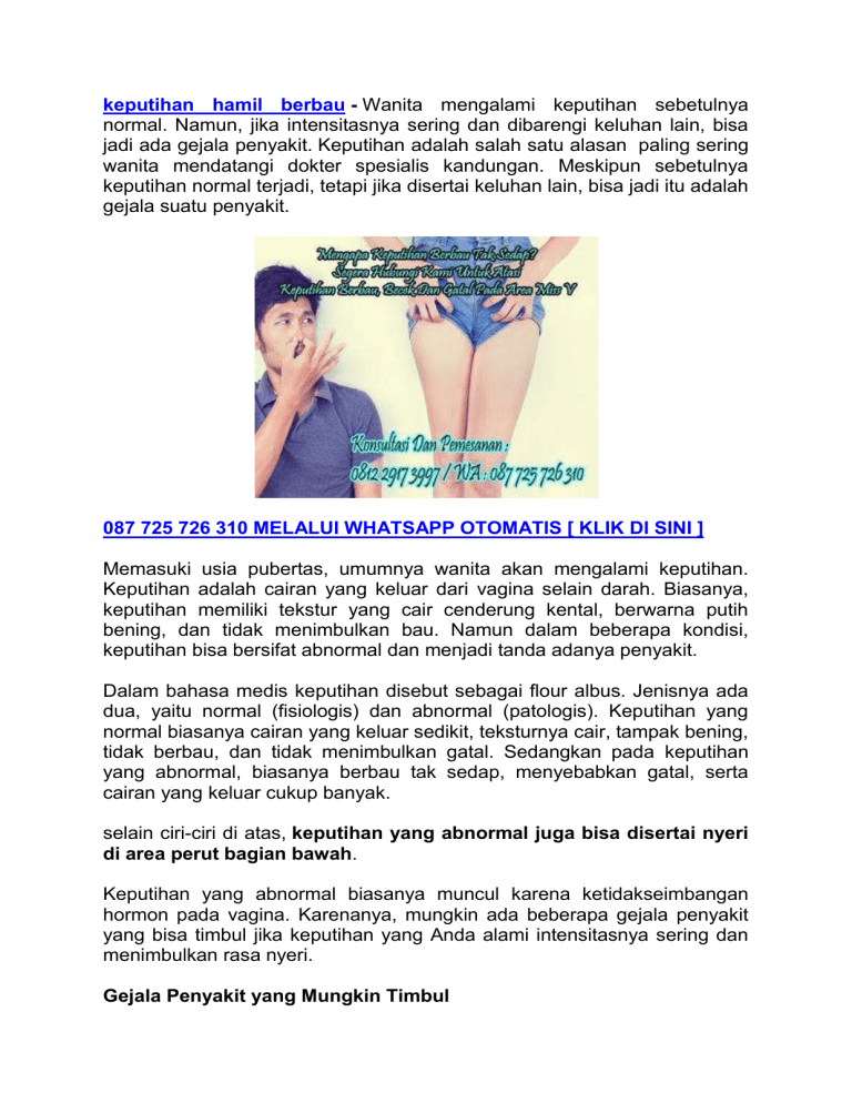 keputihan hamil berbau - Wanita mengalami keputihan sebetulnya normal. Namun, jika intensitasnya sering dan dibarengi keluhan lain, bisa jadi ada gejala penyakit. Keputihan adalah salah satu alasan paling sering wanita mendatangi dokter spesialis kandungan. Meskipun sebetulnya keputihan normal terjadi, tetapi jika disertai keluhan lain, bisa jadi itu adalah gejala suatu penyakit. 087 725 726 310 MELALUI WHATSAPP OTOMATIS [ KLIK DI SINI ] Memasuki usia pubertas, umumnya wanita akan mengalami keputihan. Keputihan adalah cairan yang keluar dari vagina selain darah. Biasanya, keputihan memiliki tekstur yang cair cenderung kental, berwarna putih bening, dan tidak menimbulkan bau. Namun dalam beberapa kondisi, keputihan bisa bersifat abnormal dan menjadi tanda adanya penyakit. Dalam bahasa medis keputihan disebut sebagai flour albus. Jenisnya ada dua, yaitu normal (fisiologis) dan abnormal (patologis). Keputihan yang normal biasanya cairan yang keluar sedikit, teksturnya cair, tampak bening, tidak berbau, dan tidak menimbulkan gatal. Sedangkan pada keputihan yang abnormal, biasanya berbau tak sedap, menyebabkan gatal, serta cairan yang keluar cukup banyak. selain ciri-ciri di atas, keputihan yang abnormal juga bisa disertai nyeri di area perut bagian bawah. Keputihan yang abnormal biasanya muncul karena ketidakseimbangan hormon pada vagina. Karenanya, mungkin ada beberapa gejala penyakit yang bisa timbul jika keputihan yang Anda alami intensitasnya sering dan menimbulkan rasa nyeri. Gejala Penyakit yang Mungkin Timbul Jika yang Anda alami adalah keputihan yang abnormal, beberapa penyakit di bawah ini patut dicurigai. Infeksi Bakteri Infeksi bakteri umumnya terjadi pada wanita hamil atau wanita yang punya lebih dari satu pasangan seksual. Menurut dr. Devia, infeksi ini dinamakan vaginosis bakterialis, disebabkan oleh bakteri Gardnerella vaginalis yang tumbuh secara berlebihan di vagina. Keputihan akibat infeksi ini biasanya berwarna putih keabuan dan berbau amis. Bau amis ini akan makin tercium setelah berhubungan seksual. Radang Panggul Radang panggul, atau disebut sebagai pelvic inflammatory disease, merupakan radang yang diakibatkan karena adanya infeksi. Radang panggul umumnya menyerang organ reproduksi wanita bagian dalam, seperti rahim dan ovarium. Jika tidak diobati dengan benar, selain menyebabkan keputihan yang berlebihan, radang panggul juga bisa mengganggu kesuburan. Infeksi Jamur penyakit kandidiasis juga perlu diwaspadai. Kandidiasis merupakan keputihan yang disebabkan oleh jamur spesies Candida. Keputihan ini biasanya dialami oleh orang yang gemuk, lansia, atau penderita diabetes melitus. Ciri khas dari keputihan kandidiasis adalah keputihan yang menggumpal, berwarna putih seperti susu, dan disertai dengan rasa gatal di daerah vagina. Kanker Serviks beberapa gejala keputihan yang berkaitan dengan kanker serviks di antaranya adalah: => Keputihan disertai bau tak sedap yang cukup menyengat => Keputihan disertai bercak darah => Perdarahan dari vagina di luar siklus haid => Perdarahan setelah berhubungan seks => Perdarahan dari vagina setelah menopause => Nyeri di daerah panggul. Jika terdapat gejala-gejala di atas, Anda perlu mewaspadai kemungkinan kanker serviks. Terlebih jika Anda pernah berhubungan intim dengan lebih dari satu orang, berhubungan seks sejak usia kurang dari 20 tahun, pernah mengalami infeksi menular seksual, atau pernah mengalami infeksi humanpapilloma virus (HPV), kemungkinan kanker serviks lebih tinggi. Gonore Gonore, penyakit yang disebabkan oleh bakteri Neisseria gonorrhoea, adalah infeksi yang ditularkan lewat hubungan seksual. Pada wanita, gonore menyebabkan peradangan pada serviks, disebut dengan servisitis. Gejalanya berupa keputihan yang berwarna kuning dan nyeri saat berhubungan intim. Klamidiasis Klamidiasis merupakan infeksi yang disebabkan oleh kuman Chlamydia trachomatis. Sama halnya dengan gonore, klamidiasis juga ditularkan melalui hubungan seksual. Keputihan karena kuman Chlamydia berwarna jernih dan tak disertai dengan keluhan lainnya. Bahkan, sebagian kasus klamidiasis tak memberikan gejala sama sekali. Perlu diketahui, klamidiasis adalah salah satu penyebab paling sering ketidaksuburan pada wanita. Awalnya kuman hanya menginfeksi mulut rahim, tetapi jika tidak mendapatkan penanganan dengan tepat, kuman akan masuk ke dalam rahim dan menginfeksi rahim dan tuba falopii. Nah, perlekatan pada rahim atau tuba falopii akibat infeksi tersebut bisa berujung pada kemandulan. Infeksi Parasit Jika Anda mendapati keputihan berwarna hijau, berbuih, dan menimbulkan bau tidak sedap, bisa jadi dilatarbelakangi oleh infeksi parasit Trichomonas vaginalis. Penyakitnya disebut sebagai trikomoniasis. Yuk lebih memperhatikan tanda-tanda keputihan. Ingat, keputihan yang normal berwarna putih atau bening, tidak menimbulkan bau, jumlahnya tidak banyak, serta hanya berlangsung selama beberapa hari. Biasanya, keputihan yang normal ini dialami wanita menjelang masa subur dan setelah menstruasi. Namun, jika wanita sering mengalami keputihan atau tak kunjung sembuh, berwarna, berbau tak sedap, bikin gatal, atau ada bercak darah, bisa jadi itu adalah gejala suatu penyakit yang harus segera ditangani. Hindari mengobatinya sendiri, langkah paling tepat adalah dengan memeriksakan diri ke dokter. Obat Herbal Kencing Nanah 1. Dengan menggunakan daun sirih Daun sirih ini merupakan daun yang bisa menyembuhkan berbagai macam penyakit. Salah satunya bisa menyembukan penyakit asam urat. Tetapi ada juga manfaat lain dari daun sirih ini, yaitu sebagai obat kencing nanah alami yang tidak menimbulkan efek samping. Membuat ramuan dari daun sirih untuk mengobati kencing nanah adalah dengan cara direbus sampai matang, yang sebelumnya sudah dibersihkan. Kemudian saring dan minum air ramuannya secara rutin dan teratur, agar penyakit ini dapat segera sembuh dengan cepat. Dan cara ini sangat mudah untuk dipakai oleh siapapun tanpa memikirkan efek samping. Maka dari itu, Anda harus bisa menjaga kon
