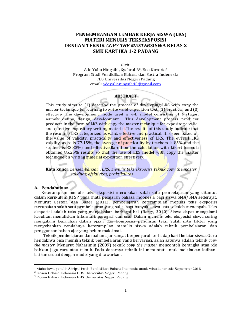 PENGEMBANGAN LEMBAR KERJA SISWA (LKS) MATERI MENULIS TEKSEKSPOSISI DENGAN TEKNIK COPY THE MASTERSISWA KELAS X SMK KARTIKA 1-2 PADANG Oleh: Ade Yulia Syahrul R2, Ena Noveria3 Program Studi Pendidikan Bahasa dan Sastra Indonesia FBS Universitas Negeri Padang email: [email protected] Ningsih1, ABSTRACT This study aims to (1) describe the process of developing LKS with copy the master technique for learning to write valid exposition text, (2) practical and (3) effective. The development mode used is 4-D model consisting of 4 stages, namely define, design, development . This development process produces products in the form of LKS with copy the master technique for expository, valid, and effective expository writing material.The results of this study indicate that the resulting LKS categorized as valid, effective and practical. It is seen based on the value of validity, practicality and effectiveness of LKS. The overall LKS validity score is 77.15%, the average of practicality by teachers is 85% and the student is 83.33%) and effective.Based on the calculation with Likert formula obtained 85.25% results so that the use of LKS model with copy the master technique on writing material exposition effectively. Kata kunci: pengembangan , LKS, menulis teks eksposisi, teknik copy the master, validitas, efektivitas, praktikalitas A. Pendahuluan Keterampilan menulis teks eksposisi merupakan salah satu pembelajaran yang dituntut dalam kurikulum KTSP pada mata pelajaran bahasa Indonesia bagi siswa SMA/SMA sederajat. Menurut Gestein dan Baker (2011), pembelajaran keterampilan menulis teks eksposisi merupakan salah satu pembelajaran yang sulit bagi banyak siswa usia sekolah menengah. Teks eksposisi adalah teks yang menjelaskan berbagai hal (Barry, 2010). Siswa dapat mengalami kesulitan menuliskan informasi, paragraf dan esai. Dalam menulis teks eksposisi siswa sering mengalami kesalahan dalam ejaan dan komposisi penulisan teks. Salah satu faktor yang menyebabkan rendahnya keterampilan menulis siswa adalah teknik pembelajaran dan penggunaan bahan ajar yang belum maksimal. Teknik pembelajaran dan bahan ajar sangat berpengaruh terhadap hasil belajar siswa. Guru hendaknya bisa memilih teknik pembelajaran yang bervariasi, salah satunya adalah teknik copy the master. Menurut Maharimin (2009) teknik copy the master mencontoh kerangka atau ide bahkan juga cara atau teknik. Pada dasarnya teknik ini menuntut untuk melakukan latihanlatihan sesuai dengan model yang ditawarkan. 1 Mahasiswa penulis Skripsi Prodi Pendidikan Bahasa Indonesia untuk wisuda periode September 2018 Dosen Bahasa Indonesia FBS Universitas Negeri Padang 3 Dosen Bahasa Indonesia FBS Universitas Negeri Padang 2 1 Jurnal Pendidikan Bahasa dan Sastra Indonesia, Vol. 7 No. 3 September 2018; Seri A 1-8 Berdasarkan beberapa penelitian penggunaan teknik copy the master dapat meningkatkan hasil belajar siswa. Hal itu dibuktikan dengan penelitian yang dilakukan oleh Harlina(2016), Rohimat (2013), Zurita (2017) serta peneliian Rosyidah, Syahrul dan Ermanto (2013) yang telah menguji teknik copy the master yang berdampak positif kepada siswa. Bahan ajar merupakan salah satu komponen pembelajaran. Bahan ajar dapat dibuat dalam berbagai bentuk sesuai dengan kebutuhan dan karakteristik materi ajar yang akan disajikan. Salah satu cara yang digunakan yaitu mengembangkan bahan ajar. Bahan ajar yang dikembangkan sendiri oleh guru dapat disesuaikan dengan tuntutan kurikulum, tuntutan karakteristik sasaran, dan tuntutan pemecahan masalah. Jadi, dengan tersedianya bahan ajar yang bervariasi, guru akan lebih mudah melaksanakan pembelajaran dan kegiatan pembelajaran akan lebih menarik bagi siswa. Bahan ajar yang dapat dikembangkan guru, di antaranya adalah lembar kerja siswa (LKS).LKS merupakan bahan ajar cetak berupa lembar-lembar kertas yang berisi materi, ringkasan, dan petunjuk-petunjuk pelaksanaan tugas pembelajaran yang mengacu pada kompetensi dasar yang harus dicapai (Prastowo, 2011:204).LKS merupakan stimulus atau bimbingan guru dalam pembelajaran yang akan disajikan secara tertulis sehingga dalam penulisannya perlu memperhatikan kriteria media grafis sebagai media visual untuk menarik perhatian peserta didik. Paling tidak LKS sebagai media kartu. Sedangkan isi pesan LKS harus memperhatikan unsur-unsur penulisan media grafis, hirarki materi dan pemilihan pertanyaanpertanyaan sebagai stimulus yang efisien dan efektiv (Hidayah, 2007:8). Melalui LKS guru menyuruh siswa untuk menjawab soal-soal yang telah tersedia setelah menaikkan materi pokok tertentu baik secara personal maupun kelompok. LKS yang dibutuhkan siswa adalah LKS yang menarik, bagus, dan bermanfaat sehingga dapat menimbulkan minat siswa untuk menggunakan LKS dalam proses pembelajaran, salah satunya dalam penulisan teks eksposisi. Pembelajaran menulis teks eksposisi dalam Kurikulum KTSP kelas X SMK semester satu dengan kopetensi dasar (KD) 4.2 memproduksi teks eksposisi baik lisan maupun tulisan. Berdasarkan hasil wawancara dengan salah seorang guru mata pelajaran bahasa Indonesia kelas X SMK Kartika 1-2 Padang, Ibu Erfina Dewita, S. Pd., pada tanggal 18 Desember 2013 diperoleh informasi bahwa terdapat beberapa faktor yang menjadi masalah pembelajaran menulis teks eksposisi. Pertama, perolehan nilai siswa yang tidak memenuhi Kriteria Ketuntasan Minimal (KKM) yang ditetapkan yaitu 80. Kedua, kurang menariknya media yang digunakan dalam proses pembelajaran menulis teks ekspositoris. Guru masih menggunakan metode belajar tradisional yaitu ceramah yang membuat siswa merasa bosan dalam belajar. Ketiga, dalam proses pembelajaran, siswa tidak menggunakan LKS sebagai bahan ajar alternatif untuk meningkatkan kemampuan menulis siswa. Berdasarkan fenomena tersebut, pengembangan Lembar kerja Siswa (LKS) perlu dilakukan. Peneliti berharap, dengan penggunaan LKS yang dilengkapi dengan teknik pemodelan, siswa akan mahir dan dapat meningkatkan keterampilan menulis teks eksposisi. Berdasarkan uraian tersebut, bahan ajar 