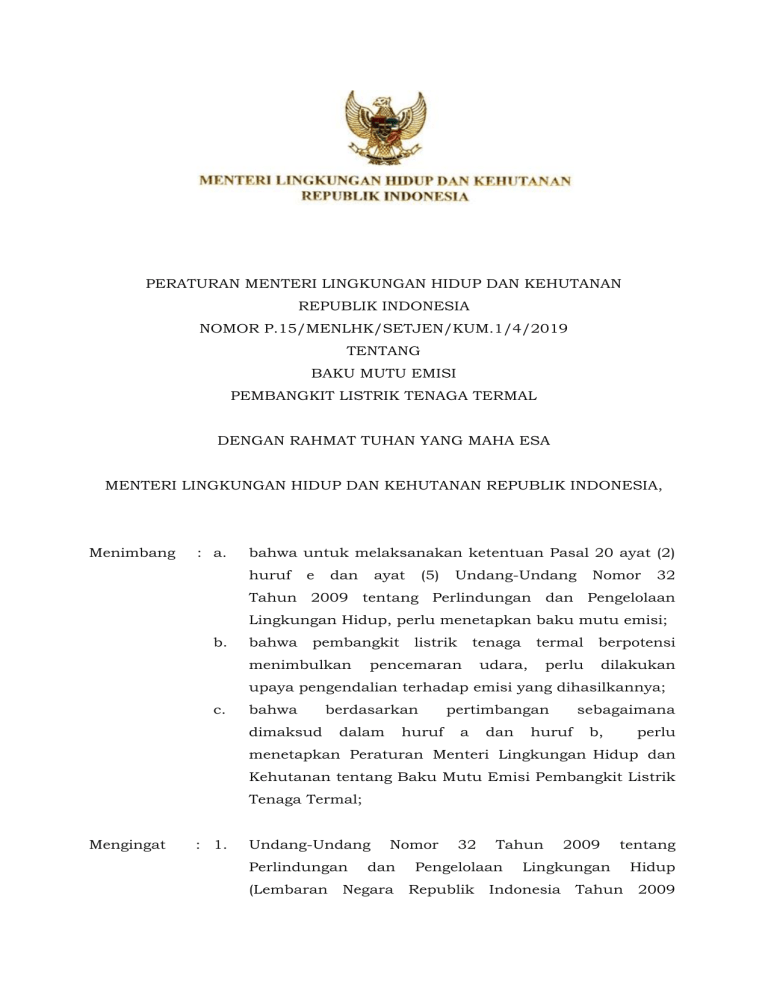 PERATURAN MENTERI LINGKUNGAN HIDUP DAN KEHUTANAN REPUBLIK INDONESIA NOMOR P.15/MENLHK/SETJEN/KUM.1/4/2019 TENTANG BAKU MUTU EMISI PEMBANGKIT LISTRIK TENAGA TERMAL DENGAN RAHMAT TUHAN YANG MAHA ESA MENTERI LINGKUNGAN HIDUP DAN KEHUTANAN REPUBLIK INDONESIA, Menimbang : a. bahwa untuk melaksanakan ketentuan Pasal 20 ayat (2) huruf e dan ayat (5) Undang-Undang Nomor 32 Tahun 2009 tentang Perlindungan dan Pengelolaan Lingkungan Hidup, perlu menetapkan baku mutu emisi; b. bahwa pembangkit listrik tenaga termal berpotensi menimbulkan pencemaran udara, perlu dilakukan upaya pengendalian terhadap emisi yang dihasilkannya; c. bahwa dimaksud berdasarkan dalam huruf pertimbangan a dan sebagaimana huruf b, perlu menetapkan Peraturan Menteri Lingkungan Hidup dan Kehutanan tentang Baku Mutu Emisi Pembangkit Listrik Tenaga Termal; Mengingat : 1. Undang-Undang Perlindungan Nomor dan 32 Tahun Pengelolaan 2009 Lingkungan tentang Hidup (Lembaran Negara Republik Indonesia Tahun 2009 -2- Nomor 140, Tambahan Lembaran Negara Republik Indonesia Nomor 5059); 2. Peraturan Pemerintah Nomor 41 tahun 1999 tentang Pengendalian Pencemaran Udara (Lembaran Negara Republik Indonesia Tahun 1999 Nomor 86, Tambahan Lembaran Negara Republik Indonesia Nomor 3853); 3. Peraturan Menteri Lingkungan Hidup dan Kehutanan Nomor P.18/MENLHK-II/2015 tentang Organisasi dan Tata Kerja Kementerian Kehutanan (Berita Lingkungan Negara Hidup Republik dan Indonesia Tahun 2015 Nomor 713); 4. Peraturan Menteri Lingkungan Hidup dan Kehutanan Nomor P.6/MENLHK/SETJEN/KUM.1/2/2018 tentang Standar dan Sertifikasi Kompetensi Penanggung Jawab Operasional Instalasi Pengendalian Pencemaran Udara dan Penanggung Jawab Pengendalian Pencemaran Udara (Berita Negara Republik Indonesia Tahun 2018 HIDUP DAN Nomor 307); MEMUTUSKAN: Menetapkan : PERATURAN MENTERI LINGKUNGAN KEHUTANAN TENTANG BAKU MUTU EMISI PEMBANGKIT LISTRIK TENAGA TERMAL. Pasal 1 Dalam Peraturan Menteri ini yang dimaksud dengan: 1. Pembangkit Listrik Tenaga Termal adalah suatu kegiatan yang memproduksi tenaga listrik dengan menggunakan bahan bakar padat, cair, gas, campuran antara padat, cair, dan/atau gas, atau uap panas bumi. 2. Pembangkit disingkat Listrik PLTU memproduksi Tenaga adalah tenaga listrik Uap yang suatu dengan selanjutnya kegiatan yang menggunakan bahan bakar padat, cair, atau gas untuk memanaskan air dalam ketel uap yang memproduksi uap untuk menggerakkan turbin yang seporos dengan generator sehingga membangkitkan tenaga listrik. -3- 3. Pembangkit disingkat Listrik PLTG memproduksi Tenaga Gas adalah tenaga yang suatu listrik selanjutnya kegiatan dengan yang menggunakan bahan bakar minyak atau gas yang menghasilkan gas dari hasil pembakaran yang digunakan untuk menggerakkan turbin yang seporos dengan generator sehingga membangkitkan tenaga listrik. 4. Pembangkit Listrik Tenaga Gas dan Uap yang selanjutnya disingkat PLTGU adalah suatu kegiatan yang memproduksi tenaga listrik dengan menggunakan bahan bakar minyak atau gas yang menghasilkan gas hasil pembakaran yang digunakan untuk menggerakkan turbin yang seporos dengan generator sehingga membangkitkan tenaga listrik sedangkan sisa panas yang dihasilkan selanjutnya dimanfaatkan proses pemanasan air di unit Heat Recovery Steam Generator untuk memproduksi uap yang digunakan sebagai media penggerak turbin uap yang seporos dengan generator sehingga membangkitkan tenaga listrik. 5. Pembangkit Listrik Tenaga disingkat adalah PLTD memproduksi tenaga Diesel yang suatu listrik selanjutnya kegiatan dengan yang menggunakan bahan bakar cair yang menghasilkan tenaga berupa gas hasil pembakaran udara terkompresi yang digunakan untuk mengubah energi gerak luncur piston menjadi energi putar digunakan pada poros untuk tersambung dengan engkol yang menggerakkan poros selanjutnya poros generator yang sehingga membangkitkan tenaga listrik. 6. Pembangkit Listrik Tenaga selanjutnya disingkat PLTP adalah kegiatan tenaga listrik dengan memanfaatkan memproduksi Panas Bumi yang yang energi panas bumi. 7. Pembangkit Listrik Tenaga Mesin Gas yang selanjutnya disingkat PLTMG atau Pembangkit Listrik Tenaga Diesel Gas yang selanjutnya disingkat PLTDG adalah suatu kegiatan yang memproduksi tenaga listrik dengan -4- menggunakan bahan bakar gas atau bahan bakar cair baik menggunakan penyalaan pengapian dengan menggunakan busi (spark plug) maupun dengan sistem kompresi udara dan bahan bakar tanpa menggunakan busi (spark plug), yang menghasilkan tenaga berupa gas hasil pembakaran udara terkompresi yang digunakan untuk mengubah energi gerak luncur piston menjadi energi putar pada poros engkol yang selanjutnya digunakan untuk menggerakkan poros yang tersambung dengan poros generator sehingga membangkitkan tenaga listrik. 8. Pembangkit Listrik Tenaga Biomassa yang selanjutnya disingkat PLTBm memproduksi biomassa adalah tenaga berupa suatu listrik kegiatan dengan serabut, yang menggunakan cangkang, ampas, daun tebu kering dan/atau biomassa lainnya. 9. Pembangkit Listrik Tenaga Sampah yang selanjutnya disingkat PLTSa memproduksi adalah tenaga listrik suatu kegiatan dengan yang menggunakan sampah rumah tangga dan/atau sampah sejenis sampah rumah tangga. 10. Pembangkit Listrik Berbahan Bakar Campuran adalah suatu kegiatan yang memproduksi tenaga listrik dengan menggunakan bahan bakar yang merupakan campuran antara bahan bakar padat, cair, dan/atau gas dalam waktu bersamaan untuk memanaskan air dalam ketel uap yang memproduksi uap untuk menggerakkan turbin yang seporos dengan generator sehingga membangkitkan tenaga listrik. 11. Pencemaran Udara adalah masuknya atau dimasukkannya zat, energi, dan/atau komponen lain ke dalam udara ambien oleh kegiatan manusia, sehingga mutu udara ambien turun sampai ke tingkat tertentu yang menyebabkan memenuhi fungsinya. udara ambien tidak dapat -5- 12. Emisi adalah zat, energi dan/atau komponen lain yang dihasilkan dari suatu kegiatan yang masuk dan/atau dimasukkannya ke dalam udara ambien yang mempunyai dan/atau tidak mempunyai potensi seb