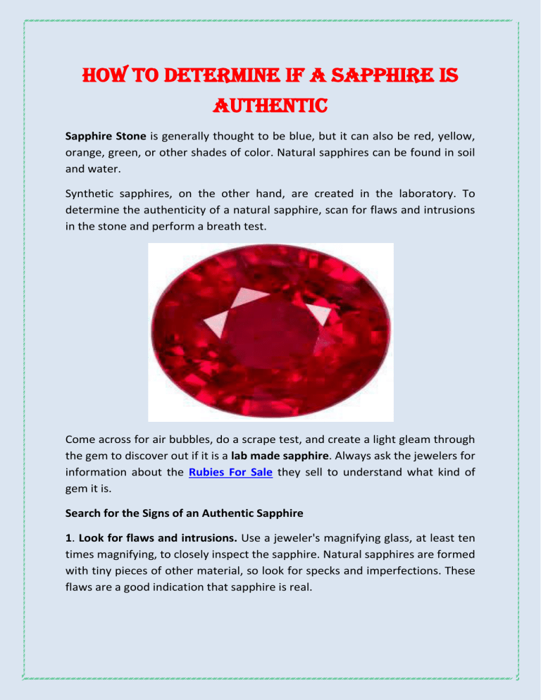 How to determine if a Sapphire is Authentic Sapphire Stone is generally thought to be blue, but it can also be red, yellow, orange, green, or other shades of color. Natural sapphires can be found in soil and water. Synthetic sapphires, on the other hand, are created in the laboratory. To determine the authenticity of a natural sapphire, scan for flaws and intrusions in the stone and perform a breath test. Come across for air bubbles, do a scrape test, and create a light gleam through the gem to discover out if it is a lab made sapphire. Always ask the jewelers for information about the Rubies For Sale they sell to understand what kind of gem it is. Search for the Signs of an Authentic Sapphire 1. Look for flaws and intrusions. Use a jeweler's magnifying glass, at least ten times magnifying, to closely inspect the sapphire. Natural sapphires are formed with tiny pieces of other material, so look for specks and imperfections. These flaws are a good indication that sapphire is real. 2. The synthetic sapphire do not present intrusions of this nature, and some natural sapphires may have no defects, but if you notice imperfections, it is an authentic sapphire. Take the breath test. Take the lab grown sapphire and exhale the air on its surface to mist it. It counts how long the condensation takes before it starts to fade and how long it takes to disappear completely. Natural gemstones should clear in just one or two seconds, while artificial sapphires may take about five. 3. Get certified for your sapphire. Gemologists can examine loose sapphire stones and determine what type of gem it is. They give you their technical report on the sapphire after analyzing it. They can tell you whether it is natural or synthetic, treated or not, as well as many of its other characteristics. Once the gemologists have thoroughly examined synthetic blue sapphire, they will provide you with an official statement. If you have an old family sapphire that you are sure is natural and precious, it is good to have it certified to maximize its value in case you want to sell it. A certified sapphire will be easier to sell at a good price. Find a fake sapphire 1. Check for air bubbles in the gem. The sapphires created in the laboratory are essentially glass, which undergoes a process similar to that which forms Padparadscha Sapphire. Since it is glass, small air bubbles remain inside after their formation. If you see bubbles inside the sapphire, it is a fake stone. Make sure to turn the sapphire and inspect it from every angle. Air bubbles may only be visible from one corner. 2. Run the scratch test. If you have two stones and you identify for sure that one is genuine, use it to rub the second. Gems of equal hardness cannot scratch each other, so if both are real sapphires, then nothing will happen. This test can damage synthetic corundum, so be aware that you can ruin the lower value gem. 3. See how the light reflects off the sapphire. Turn off the lights in a room and aim a flashlight at the sapphire. If the stone is authentic, it will only reflect the light of the same color as the sapphire. If it is false, it means that it is made of glass and will reflect other colors besides that of the gem.