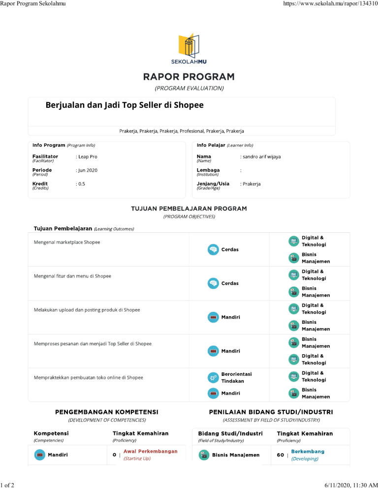 Rapor Program Sekolahmu 1 of 2 https://www.sekolah.mu/rapor/134310 Berjualan dan Jadi Top Seller di Shopee 6/11/2020, 11:30 AM Rapor Program Sekolahmu 2 of 2 https://www.sekolah.mu/rapor/134310 6/11/2020, 11:30 AM
