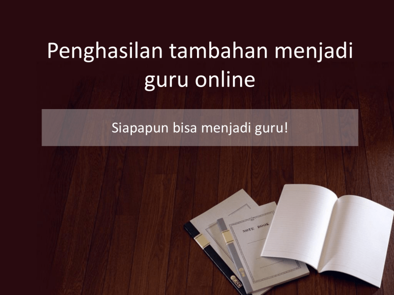 Penghasilan tambahan menjadi guru online Siapapun bisa menjadi guru! Agenda • • • • Guru Murid Materi Media Persyaratan dasar menjadi guru • • • • Keahlian khusus Komunikasi efektif Mampu memotivasi Percaya diri Kelengkapan guru online • • • • Smartphone / Komputer Koneksi Internet Media online Materi online Murid • • • • • • Who : Siapakah murid Anda? Why : Mengapa mereka mengikuti pelatihan Anda? What : Apa tujuan pelatihan yang ingin dicapai? When : Kapan pelatihan dilakukan? Where: Melalui media apa dilakukannya? How : Bagaimana agar pelatihan efektif? Materi • • • • Mudah dipahami Praktis Sistematis Relevan Media • • • • Social Media Email Video Network Online Meeting Platform guru online • • • • • • • • Kelaskita.com Gotraining.co.id Ruangguru.com Gooruku Gomuslim.co.id Gurungaji.com Superprof.co.id Bitdegree.org 1. 2. 3. 4. 5. 6. Training plan Online media Gadget / Computer / Laptop Connection Headset Online platform