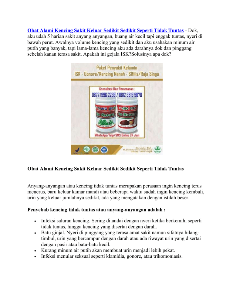 Obat Alami Kencing Sakit Keluar Sedikit Sedikit Seperti Tidak Tuntas - Dok, aku udah 5 harian sakit anyang anyangan, buang air kecil tapi enggak tuntas, nyeri di bawah perut. Awalnya volume kencing yang sedikit dan aku usahakan minum air putih yang banyak, tapi lama-lama kencing aku ada darahnya dok dan pinggang sebelah kanan terasa sakit. Apakah ini gejala ISK?Solusinya apa dok? Obat Alami Kencing Sakit Keluar Sedikit Sedikit Seperti Tidak Tuntas Anyang-anyangan atau kencing tidak tuntas merupakan perasaan ingin kencing terus menerus, baru keluar kamar mandi atau beberapa waktu sudah ingin kencing kembali, urin yang keluar jumlahnya sedikit, ada yang mengatakan dengan istilah beser. Penyebab kencing tidak tuntas atau anyang-anyangan adalah : Infeksi saluran kencing. Sering ditandai dengan nyeri ketika berkemih, seperti tidak tuntas, hingga kencing yang disertai dengan darah. Batu ginjal. Nyeri di pinggang yang terasa amat sakit namun sifatnya hilangtimbul, urin yang bercampur dengan darah atau ada riwayat urin yang disertai dengan pasir atau batu-batu kecil. Kurang minum air putih akan membuat urin menjadi lebih pekat. Infeksi menular seksual seperti klamidia, gonore, atau trikomoniasis. Hal yang sementara dapat Anda lakukan untuk mengatasi anyang-anyangan adalah : Perbanyak konsumsi air putih, minimal 2 liter setiap harinya. Basuh area kelamin dengan arah yang benar, dari depan ke belakang dan jangan lupa untuk mengeringkannya. Hindari pemakaian sabun pembersih kelamin, cukup bilas dengan air. Gunakan kondom bila berhubungan seksual, dan jangan berganti-ganti pasangan seksual. Perihal keluhan yang Anda rasakan berupa anyang-anyangan hingga berdarah, nyeri pinggang kanan dan nyeri perut bawah maka sebaiknya Anda segera lakukan pengobatan sebelum kondisi semakin parah dan menelan biaya yang lebih besar. Obat Alami Kencing Sakit Keluar Sedikit Sedikit Seperti Tidak Tuntas Ijinkan kami memberikan informasi mengenai cara mengobati batuk infeksi saluran kemih (isk), kencing nanah/gonore, sipilis/raja singa, anyang anyangan dan berbagai jenis penyakit kelamin lainnya lainnya secara alami dengan Obat Herbal De Nature. Paket Obat Herbal ini terdiri dari Gang Jie Dan Gho Siah. Obat berbahan dasar herbal dan diracik secara modern sesuai aturan BPOM. Atau dengan kata lain Obat alami ini sudah terdaftar resmi di BPOM. Produk Herbal Gang Jie dan Gho Siah merupakan produk eksklusif dari De Nature. Gang Jie POM.TR 173 300 491 Gho Siah POM.TR 173 305 881 KOMPOSISI: Gang Jie : Orthosiphon stamineus folium 1250mg Imperatae cylindrica rhozoma 625mg Andrographis paniculata folium 625mg Gho Siah : Lumbricus rubellus ekstrak 500mg Obat Infeksi Saluran Kemih (ISK) - Kencing Nanah/Gonore - Sipilis/Raja Singa - Klamidia - Penyakit Kelamin Herbal Alami BERKHASIAT UNTUK : Mengobati Sipilis/Rajasinga/Gonore/Kencing Nanah/Infeksi Saluran Kemih Sebagai Antivirus Memperbaiki jaringan sel pada bagian uretric Memulihkan stamina Menjaga kesehatan Mengobati Saluran Kencing Membantu meningkatkan sistem imunitas (kekebalan tubuh), serta membantu mempercepat proses pemulihan kondisi badan. De Nature Indonesia adalah sebuah perusahaan yang bergerak di bidang Obat Tradisional (OT) dari dalam Negeri, yang mencoba mengangkat dan menghidupkan kembali Budaya Nenek Moyang kita Yaitu Jamu Tradisional sebagai salah satu warisan leluhur budaya bangsa yang perlu dilestarikan. Produk De Nature dalam artikel ini khusus untuk mengatasi masalah kelamin / penyakit kelamin. Sekedar informasi untuk kenyamanan Konsumen, bahwa Produk dari perusahaan kami ini sudah memiliki: Ijin Resmi Perusahaan dari Kementerian Kesehatan Ijin BPOM, yang artinya sudah lulus uji stabilitas Produk Sertifikat Halal MUI, sehingga kehalalannya bisa dipertanggungjawabkan Apoteker Yang berpengalaman Sudah melewati Proses Sortir Bahan Baku, Guna Menjaga Mutu Produk Proses Produksi Sesuai Alur CPOTB (Cara Pembuatan Obat Tradisional Yang Baik Dan Benar) Sertifikat ISO 9001 : 2015 yang artinya sudah Berstandar Internasional Untuk informasi lebih lanjut mengenai Produk dan Harga, Cara Pemesanan/ Konsultasi atau hal lainnya, anda dapat menghubungi kami melalui Telpon/WhatsApp/SMS (Online 24 jam / Fast Respon) pada nomor yang tertera pada gambar obat di atas. Pengiriman Herbal De Nature hanya 1 pintu yaitu dari Kantor Pusat De Nature (Majenang Cilacap Jawa Tengah). Kebijakan ini diambil untuk menjaga keaslian produk. Penelusuran yang terkait dengan Obat Alami Kencing Sakit Keluar Sedikit Sedikit Seperti Tidak Tuntas : tanaman obat kencing tidak tuntas, obat herbal air kencing keluar sendiri, buang air kecil tidak lancar dan terasa sakit, cara mengatasi kencing tidak lancar, obat kencing tidak lancar, jus buah untuk melancarkan kencing, cara menghilangkan pipis dikit dikit, obat beser tradisional kumpulan tips