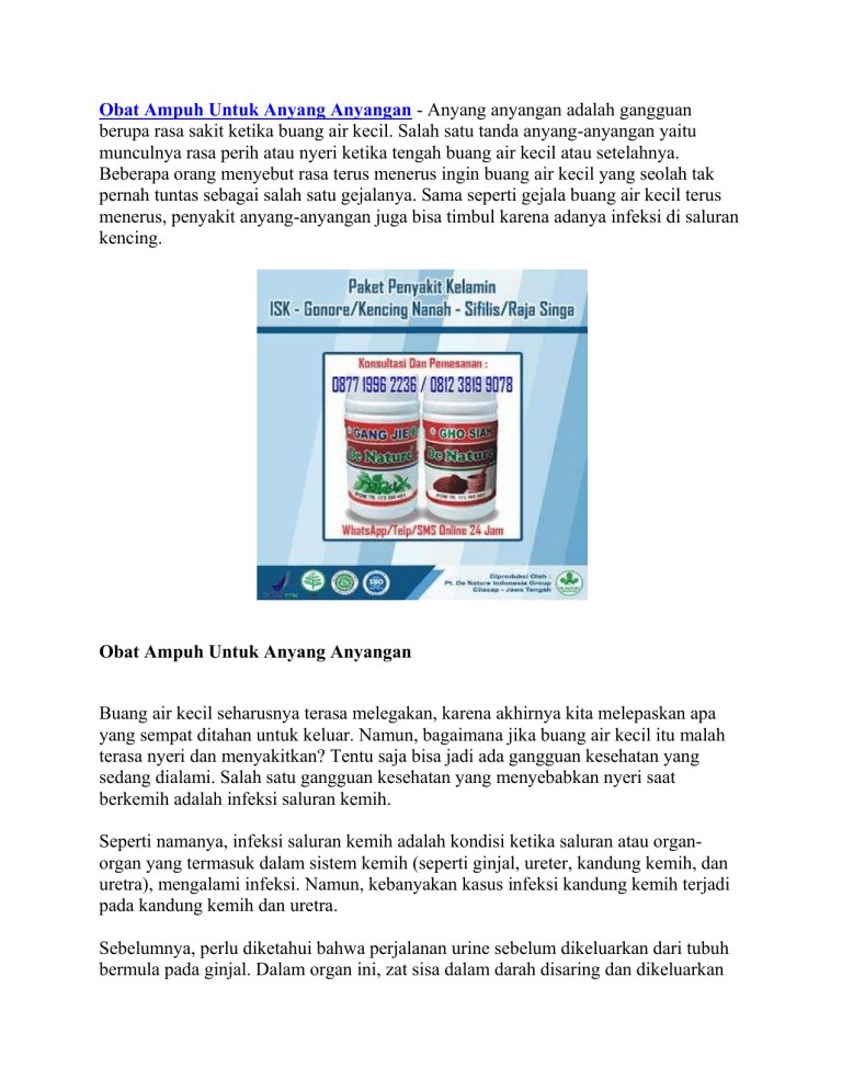 Obat Ampuh Untuk Anyang Anyangan - Anyang anyangan adalah gangguan berupa rasa sakit ketika buang air kecil. Salah satu tanda anyang-anyangan yaitu munculnya rasa perih atau nyeri ketika tengah buang air kecil atau setelahnya. Beberapa orang menyebut rasa terus menerus ingin buang air kecil yang seolah tak pernah tuntas sebagai salah satu gejalanya. Sama seperti gejala buang air kecil terus menerus, penyakit anyang-anyangan juga bisa timbul karena adanya infeksi di saluran kencing. Obat Ampuh Untuk Anyang Anyangan Buang air kecil seharusnya terasa melegakan, karena akhirnya kita melepaskan apa yang sempat ditahan untuk keluar. Namun, bagaimana jika buang air kecil itu malah terasa nyeri dan menyakitkan? Tentu saja bisa jadi ada gangguan kesehatan yang sedang dialami. Salah satu gangguan kesehatan yang menyebabkan nyeri saat berkemih adalah infeksi saluran kemih. Seperti namanya, infeksi saluran kemih adalah kondisi ketika saluran atau organorgan yang termasuk dalam sistem kemih (seperti ginjal, ureter, kandung kemih, dan uretra), mengalami infeksi. Namun, kebanyakan kasus infeksi kandung kemih terjadi pada kandung kemih dan uretra. Sebelumnya, perlu diketahui bahwa perjalanan urine sebelum dikeluarkan dari tubuh bermula pada ginjal. Dalam organ ini, zat sisa dalam darah disaring dan dikeluarkan dalam bentuk urine. Kemudian, urine dialirkan dari ginjal melalui ureter menuju kandung kemih. Setelah ditampung dalam kandung kemih, urine kemudian dikeluarkan dari tubuh melalui saluran yang bernama uretra, hingga bermuara ke lubang kencing. Obat Ampuh Untuk Anyang Anyangan - Berdasarkan lokasi atau bagian yang mengalami infeksi, ada 2 jenis infeksi saluran kemih, yaitu infeksi saluran kemih atas dan infeksi saluran kemih bawah. Infeksi saluran kemih atas adalah infeksi yang terjadi pada bagian atas kandung kemih, yaitu ginjal dan ureter. Sementara infeksi saluran kemih bawah adalah infeksi yang terjadi pada bagian bawah, yaitu kandung kemih dan uretra. Jika ditanya tingkatan bahayanya, infeksi saluran kemih atas lebih berbahaya dan dapat memicu urosepsis, yaitu kondisi ketika bakteri di ginjal yang terinfeksi menyebar ke darah. Kondisi ini bisa mengakibatkan tekanan darah turun hingga syok, bahkan kematian. ISK bagian bawah, yaitu infeksi yang terjadi pada uretra dan kandung kemih (sistitis). Pada infeksi ini, gejala yang ditimbulkan berupa “anyang-anyangan” yang ditandai dengan: Sering merasa ingin buang air kecil (kencing). Jika sudah kencing, air seni yang dikeluarkan tidak akan keluar banyak dan disertai rasa nyeri. Air seni berbau tidak sedap dan berwarna keruh (terkadang bercampur darah). Badan terasa tidak enak, lelah, dan nyeri. Perut bawah di sekitar kemaluan akan terasa kram dan tidak nyaman. Munculnya perasaan bahwa urine tidak sepenuhnya keluar setelah selesai kencing. ISK bagian atas, yaitu infeksi yang terjadi pada ureter dan ginjal. Pada infeksi ini, gejala yang ditimbulkan berupa: Terjadi diare mendadak tanpa ada sebab yang jelas. Munculnya perasaan mual dan muntah. Tubuh terasa dingin dan kadang mengigil. Sakit dan nyeri pada bagian tulang selangkangan, punggung, dan juga pinggang. Disebabkan oleh Bakteri Umumnya, infeksi saluran kemih disebabkan oleh bakteri jenis Escherichia coli (E. coli), yang ditemukan pada usus. Ketika bakteri E. coli terdapat pada kulit atau dekat anus, bakteri ini dapat masuk ke saluran kencing dan menginfeksi. Risiko infeksi saluran kemih lebih tinggi pada wanita, karena saluran kencing dan anusnya terletak berdekatan. Cara bakteri menginfeksi juga bisa karena cara lain. Seperti melalui kateter yang digunakan pada terapi medis, bakteri bisa saja masuk ke saluran kencing. Selain itu, hubungan intim yang kurang sehat, dan infeksi dari area lain ke ginjal juga bisa menyebabkan kondisi ini. Bahaya Infeksi Saluran Kemih Jika ISK dibiarkan berlarut-larut tanpa diobati, maka bisa menimbulkan komplikasi seperti: Gangguan pada ginjal. Saat seseorang terkena ISK, bakteri bisa naik dan masuk ke ginjal. Alhasil, kondisi ini membuat seseorang rentan terkena infeksi ginjal (pyelonephritis) yang ditandai dengan nyeri punggung, mual, demam, hingga menggigil. Jika tidak juga ditangani, infeksi ginjal bisa menyebabkan kerusakan permanen pada ginjal. Sepsis. Komplikasi ini terjadi ketika infeksi bakteri penyebab ISK menyebar ke dalam aliran darah. Penyempitan uretra (pada pria). Melahirkan prematur dan berat bayi lahir rendah (BBLR). Obat Infeksi Saluran Kemih (ISK) - Kencing Nanah/Gonore - Sipilis/Raja Singa - Klamidia - Penyakit Kelamin Herbal Alami KOMPOSISI: Gang Jie : Orthosiphon stamineus folium 1250mg Imperatae cylindrica rhozoma 625mg Andrographis paniculata folium 625mg Gho Siah : Lumbricus rubellus ekstrak 500mg BERKHASIAT UNTUK : Mengobati Sipilis/Rajasinga/Gonore/Kencing Nanah/Infeksi Saluran Kemih Sebagai Antivirus Memperbaiki jaringan sel pada bagian uretric Memulihkan stamina Menjaga kesehatan Mengobati Saluran Kencing Membantu meningkatkan sistem imunitas (kekebalan tubuh), serta membantu mempercepat proses pemulihan kondisi badan. ATURAN MINUM : /Botol isi 50 kapsul Gang Jie : 2 kapsul sekali minum (3x sehari) Gho Siah : 2 kapsul sekali minum (3x sehari) *Diminum 1 jam sebelum makan (Lengkap ada di kemasan/label obat) Sekedar informasi untuk kenyamanan Konsumen, bahwa Produk dari perusahaan kami ini sudah memiliki: Ijin Resmi Perusahaan dari Kementerian Kesehatan Ijin BPOM, yang artinya sudah lulus uji stabilitas Produk Sertifikat Halal MUI, sehingga kehalalannya bisa dipertanggungjawabkan Apoteker Yang berpengalaman Sudah melewati Proses Sortir Bahan Baku, Guna Menjaga Mutu Produk Proses Produksi Sesuai Alur CPOTB (Cara Pembuatan Obat Tradisional Yang Baik Dan Benar) Sertifikat ISO 9001 : 2015 yang artinya sudah Berstandar Internasional Untuk informasi lebih lanjut mengenai Produk dan Harga, Cara Pemesanan/ Konsultasi atau hal lainnya, anda dapat menghubungi kami melalui Telpon/WhatsApp/SMS (Online 24 jam / Fast Respon) pada nomor yang tertera pada 