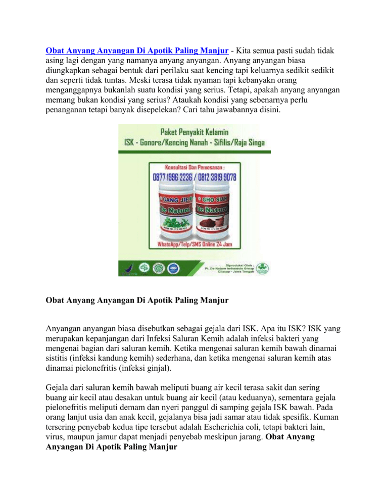 Obat Anyang Anyangan Di Apotik Paling Manjur - Kita semua pasti sudah tidak asing lagi dengan yang namanya anyang anyangan. Anyang anyangan biasa diungkapkan sebagai bentuk dari perilaku saat kencing tapi keluarnya sedikit sedikit dan seperti tidak tuntas. Meski terasa tidak nyaman tapi kebanyakn orang menganggapnya bukanlah suatu kondisi yang serius. Tetapi, apakah anyang anyangan memang bukan kondisi yang serius? Ataukah kondisi yang sebenarnya perlu penanganan tetapi banyak disepelekan? Cari tahu jawabannya disini. Obat Anyang Anyangan Di Apotik Paling Manjur Anyangan anyangan biasa disebutkan sebagai gejala dari ISK. Apa itu ISK? ISK yang merupakan kepanjangan dari Infeksi Saluran Kemih adalah infeksi bakteri yang mengenai bagian dari saluran kemih. Ketika mengenai saluran kemih bawah dinamai sistitis (infeksi kandung kemih) sederhana, dan ketika mengenai saluran kemih atas dinamai pielonefritis (infeksi ginjal). Gejala dari saluran kemih bawah meliputi buang air kecil terasa sakit dan sering buang air kecil atau desakan untuk buang air kecil (atau keduanya), sementara gejala pielonefritis meliputi demam dan nyeri panggul di samping gejala ISK bawah. Pada orang lanjut usia dan anak kecil, gejalanya bisa jadi samar atau tidak spesifik. Kuman tersering penyebab kedua tipe tersebut adalah Escherichia coli, tetapi bakteri lain, virus, maupun jamur dapat menjadi penyebab meskipun jarang. Obat Anyang Anyangan Di Apotik Paling Manjur Infeksi saluran kemih lebih sering terjadi pada perempuan dibandingkan laki-laki, dengan separuh perempuan mengalami setidaknya satu kali infeksi selama hidupnya. Kekambuhan juga sering terjadi. Faktor risikonya antara anatomi perempuan, hubungan seksual, dan riwayat keluarga. Pielonefritis, bila terjadi, biasanya ditemukan setelah infeksi kandung kemih namun juga dapat diakibatkan oleh infeksi yang ditularkan melalui darah. Diagnosis pada perempuan muda yang sehat dapat didasarkan pada gejalanya saja. Pada orang dengan gejala yang samar, diagnosis mungkin sulit karena bakteri mungkin ditemukan tanpa menyebabkan infeksi. Pada kasus yang kompleks atau apabila pengobatan gagal, kultur urin mungkin dapat bermanfaat. Pada orang yang sering mengalami infeksi, antibiotik dosis rendah dapat dikonsumsi sebagai langkah pencegahan. Gejala dan komplikasi akibat ISK Gejala ISK juga beragam pada tiap penderitanya, tergantung pada usia, jenis kelamin, dan bagian saluran kemih yang terinfeksi. Namun ISK umumnya ditandai oleh urin berwarna keruh atau berdarah, bau urine yang menyengat, sering ingin buang air kecil (BAK), muncul sensasi terbakar atau perih saat BAK, sakit perut disertai nyeri otot, serta mual dan muntah. Bila tidak segera ditangani, ISK yang berkepanjangan bisa memengaruhi kesehatan dan fungsi ginjal. Oleh sebab itu, pengobatan sebaiknya dilakukan dengan tepat dan secara saksama. Pengobatan Infeksi Saluran Kemih Menghilangkan bakteri di area berkemih merupakan langkah penanganan yang paling penting terhadap penyakit ini. Karena jika tidak dilakukan secara tuntas, bakteri akan rentan menginfeksi lagi dan menguatkan serangan bakteri, sehingga terjadilah suatu resistensi antibiotik. Biasakan juga untuk mendapatkan antibiotik sesuai dengan resep dokter. Ada cara lain yang bisa anda gunakan sebagai obat infeksi saluran kemih selain menggunakan antibiotik. Salah satu caranya yaitu menggunakan cara alami. Cara alami diyakini bisa digunakan sebagai langkah pengobatan yang tepat dan juga aman. Cara alami bisa dilakukan dengan membuat ramuan sendiri maupun dengan obat alami atau obat herbal. Jika ingin memilih menggunakan obat herbal maka pastikan jika obat tersebut memang sudah teruji klinis dan mempunyai izin edar dan resmi BPOM. Selain itu pastikan juga kehalalan produk tersebut dengan memiliki label HALAL MUI. Alangkah lebih baiknya juga jika produk sudah memiliki sertifikat ISO (9001:2015). Obat Infeksi Saluran Kemih (ISK) - Kencing Nanah/Gonore - Sipilis/Raja Singa - Klamidia - Penyakit Kelamin Herbal Alami Produk Herbal Gang Jie dan Gho Siah merupakan produk eksklusif dari De Nature. Gang Jie POM.TR 173 300 491 Gho Siah POM.TR 173 305 881 KOMPOSISI: Gang Jie : Orthosiphon stamineus folium 1250mg Imperatae cylindrica rhozoma 625mg Andrographis paniculata folium 625mg Gho Siah : Lumbricus rubellus ekstrak 500mg BERKHASIAT UNTUK : Mengobati Sipilis/Rajasinga/Gonore/Kencing Nanah/Infeksi Saluran Kemih Sebagai Antivirus Memperbaiki jaringan sel pada bagian uretric Memulihkan stamina Menjaga kesehatan Mengobati Saluran Kencing Membantu meningkatkan sistem imunitas (kekebalan tubuh), serta membantu mempercepat proses pemulihan kondisi badan. Sekedar informasi untuk kenyamanan Konsumen, bahwa Produk dari perusahaan kami ini sudah memiliki: Ijin Resmi Perusahaan dari Kementerian Kesehatan Ijin BPOM, yang artinya sudah lulus uji stabilitas Produk Sertifikat Halal MUI, sehingga kehalalannya bisa dipertanggungjawabkan Apoteker Yang berpengalaman Sudah melewati Proses Sortir Bahan Baku, Guna Menjaga Mutu Produk Proses Produksi Sesuai Alur CPOTB (Cara Pembuatan Obat Tradisional Yang Baik Dan Benar) Sertifikat ISO 9001 : 2015 yang artinya sudah Berstandar Internasional Untuk informasi lebih lanjut mengenai Produk dan Harga, Cara Pemesanan/ Konsultasi atau hal lainnya, anda dapat menghubungi kami melalui Telpon/WhatsApp/SMS (Online 24 jam / Fast Respon) pada nomor yang tertera pada gambar obat di atas. Pengiriman Herbal De Nature hanya 1 pintu yaitu dari Kantor Pusat De Nature (Majenang Cilacap Jawa Tengah). Kebijakan ini diambil untuk menjaga keaslian produk. Penelusuran yang terkait dengan Obat Anyang Anyangan Di Apotik Paling Manjur : harga obat anyang anyangan di apotik, obat anyang anyangan di apotik kimia farma, cara mengobati anyang -anyangan secara alami dan cepat, obat anyang anyangan di apotik ampuh, cara mengatasi -anyang -anyangan di malam hari, obat anyang -anyangan tradisional, berapa lama -anyang -anyangan, anyang -anyangan tanda hamil