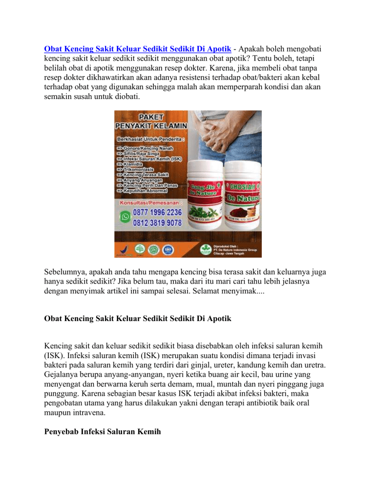 Obat Kencing Sakit Keluar Sedikit Sedikit Di Apotik - Apakah boleh mengobati kencing sakit keluar sedikit sedikit menggunakan obat apotik? Tentu boleh, tetapi belilah obat di apotik menggunakan resep dokter. Karena, jika membeli obat tanpa resep dokter dikhawatirkan akan adanya resistensi terhadap obat/bakteri akan kebal terhadap obat yang digunakan sehingga malah akan memperparah kondisi dan akan semakin susah untuk diobati. Sebelumnya, apakah anda tahu mengapa kencing bisa terasa sakit dan keluarnya juga hanya sedikit sedikit? Jika belum tau, maka dari itu mari cari tahu lebih jelasnya dengan menyimak artikel ini sampai selesai. Selamat menyimak.... Obat Kencing Sakit Keluar Sedikit Sedikit Di Apotik Kencing sakit dan keluar sedikit sedikit biasa disebabkan oleh infeksi saluran kemih (ISK). Infeksi saluran kemih (ISK) merupakan suatu kondisi dimana terjadi invasi bakteri pada saluran kemih yang terdiri dari ginjal, ureter, kandung kemih dan uretra. Gejalanya berupa anyang-anyangan, nyeri ketika buang air kecil, bau urine yang menyengat dan berwarna keruh serta demam, mual, muntah dan nyeri pinggang juga punggung. Karena sebagian besar kasus ISK terjadi akibat infeksi bakteri, maka pengobatan utama yang harus dilakukan yakni dengan terapi antibiotik baik oral maupun intravena. Penyebab Infeksi Saluran Kemih Apabila wanita tidak menyeka area kemaluan setelah buang air kecil dari arah depan ke belakang, maka ia beresiko untuk terserang penyakit ini. Sebab area uretra, yaitu organ yang berbentuk selang yang mengangkut urine dari kandung kemih ke luar tubuh, terletak dekat dengan anus. Jika wanita tidak membersihkan area tersebut dengan benar maka bakteri dari usus besar, seperti E coli bisa berpindah dari anus menuju uretra. Bakteri tersebut akan melakukan perjalanan sampai ke kandung kemih. Jika tidak diberikan penanganan dan pengobatan, hal yang lebih parah seperti infeksi ginjal akan terjadi. Berhubungan intim juga bisa menyebabkan bakteri masuk ke saluran kemih, selain dari kebiasaan jorok setelah buang air kecil. Berdasarkan hal tersebut, membersihkan area kemaluan setelah melakukan hubungan intim merupakan hal yang sangat penting. Bahaya Infeksi Saluran Kemih Jika Tidak Diobati Bila dibiarkan dan tak diobati tuntas, infeksi saluran kemih bisa menyebar dan mengganggu kesehata organ lain. Berikut beberapa komplikasi dan bahaya dari infeksi saluran kemih. 1. Kerusakan ginjal Ginjal merupakan organ yang membantu tubuh menyaring sisa metabolisme tubuh dan membuangnya melalui urine. ISK yang tak diobati bisa memengaruhi fungsi ginjal. ISK terbagi menjadi dua, yakni infeksi saluran atas dan bawah. Infeksi saluran bawah memengaruhi kandung kemih dan saluran uretra, yakni saluran yang membawa urine ke luar tubuh. Jika dibiarkan, bahaya infeksi saluran kemih bagian bawah ini dapat berlanjut dan memicu penjalaran bakteri E. coli, penyebab ISK, dari saluran kemih naik ke ginjal. Dampak fatal ini berlanjut pada infeksi hingga kerusakan pada ginjal. Infeksi ginjal yang tak diobati bisa berlanjut menjadi gagal ginjal, penyakit ginjal kronis, peningkatan tekanan darah, serta infeksi seluruh tubuh (sepsis). 2. Sepsis Tubuh akan melakukan perlawanan untuk melindungi organ lainnya saat infeksi terjadi. Dalam beberapa kasus, salah satu bahaya yang muncul akibat infeksi saluran kemih adalah memicu terjadinya sepsis. Hal ini terjadi ketika tubuh bereaksi berlebihan untuk melawan infeksi. Sepsis dapat memicu peradangan yang meluas dan berpengaruh pada organ lainnya. Hal ini membuat antibodi diproduksi terlalu banyak dan akhirnya masuk ke dalam darah. Akibatnya, darah pun keracunan. Saat itu terjadi, tubuh jadi kekurangan oksigen dan nutrisi, sehingga organ tidak dapat bekerja optimal. Dampak dari sepsis yang bisa terjadi di antaranya demam, peningkatan denyut jantung, sesak napas, dan peningkatan sel darah putih. 3. Masalah kehamilan Infeksi saluran kemih biasanya juga dialami oleh ibu hamil. Jika infeksi saluran kemih tak diobati, ada bahaya yang mengintai kesehatan ibu dan bayi dalam kandungan. Pasalnya, bakteri E. coli dari anus dapat mudah menyebar ke uretra hingga kandung kemih. ISK lebih sering dialami ibu hamil, karena bayi dalam perut memberikan tekanan pada kandung kemih dan saluran kencing. Oleh karenanya, ibu hamil kerap mengalami “kebocoran urine” karena otot panggul yang melemah. Kondisi ini juga memudahkan bakteri menetap pada kandung kemih. Perempuan juga mengalami perubahan fisik saat hamil, seperti saluran kemih yang menjadi lebih lebar. Kondisi tersebut menyebabkan urine terjebak lebih lama di dalam uretra dan memungkinkan bakteri untuk tumbuh. Selain dapat berakibat pada infeksi ginjal, ISK dapat memicu kelahiran prematur. Bakteri E. coli dalam ISK juga meningkatkan risiko kematian pada bayi prematur dan kematian bayi baru lahir. Pengobatan dan Pencegahan Infeksi Saluran Kemih Setelah mengetahui bahaya infeksi saluran kemih, tentu akan lebih baik Anda mencegahnya ketimbang harus mengobatinya. Berikut ini cara mencegah infeksi saluran kemih, meliputi: Tidak menahan kencing; Selalu membersihkan area kemaluan dari depan ke belakang setelah berkemih; Minum banyak air; Semprotan kebersihan area wanita, pewangi area kewanitaan, dan produkproduk lain untuk area kewanitaan harus dihindari karena hanya akan mengiritasi mukosa; Bersihkan area genital sebelum melakukan hubungan intim; Setelah berhubungan intim, buang air kecil. Hal ini bertujuan untuk menyingkirkan bakteri yang mungkin telah masuk ke uretra; Jangan menggunakan celana dalam selama berhari-hari; dan Jangan menggunakan pakaian bawahan yang ketat karena akan meningkatkan kelembapan. Obat Kencing Sakit Keluar Sedikit Sedikit Di Apotik - Namun saat ini anda sudah terlanjur mengalami infeksi saluran kemih. Maka dari itu segeralah lakukan pengobatan. Jika infeksi ini tidak segera diatasi, kondisi ini akan memicu urosepsis, yaitu kondisi ketika bakteri di ginjal yang terinfeksi menyebar ke darah. Hal tersebut berbahaya jika urosepsis te