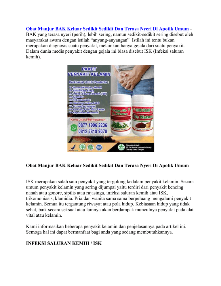 Obat Manjur BAK Keluar Sedikit Sedikit Dan Terasa Nyeri Di Apotik Umum BAK yang terasa nyeri (perih), lebih sering, namun sedikit-sedikit sering disebut oleh masyarakat awam dengan istilah “anyang-anyangan”. Istilah ini tentu bukan merupakan diagnosis suatu penyakit, melainkan hanya gejala dari suatu penyakit. Dalam dunia medis penyakit dengan gejala ini biasa disebut ISK (Infeksi saluran kemih). Obat Manjur BAK Keluar Sedikit Sedikit Dan Terasa Nyeri Di Apotik Umum ISK merupakan salah satu penyakit yang tergolong kedalam penyakit kelamin. Secara umum penyakit kelamin yang sering dijumpai yaitu terdiri dari penyakit kencing nanah atau gonore, sipilis atau rajasinga, infeksi saluran kemih atau ISK, trikomoniasis, klamidia. Pria dan wanita sama sama berpeluang mengalami penyakit kelamin. Semua itu tergantung riwayat atau pola hidup. Kebiasaan hidup yang tidak sehat, baik secara seksual atau lainnya akan berdampak munculnya penyakit pada alat vital atau kelamin. Kami informasikan beberapa penyakit kelamin dan penjelasannya pada artikel ini. Semoga hal ini dapat bermanfaat bagi anda yang sedang membutuhkannya. INFEKSI SALURAN KEMIH / ISK Infeksi saluran kemih / kencing (ISK) adalah infeksi bakteri yang mengenai bagian dari saluran kemih. Ketika mengenai saluran kemih bawah dinamai sistitis (infeksi kandung kemih) sederhana, dan ketika mengenai saluran kemih atas dinamai pielonefritis (infeksi ginjal). Gejala dari saluran kemih bawah meliputi buang air kecil terasa sakit dan sering buang air kecil atau desakan untuk buang air kecil (atau keduanya), sementara gejala pielonefritis meliputi demam dan nyeri panggul di samping gejala ISK bawah. Pada orang lanjut usia dan anak kecil, gejalanya bisa jadi samar atau tidak spesifik. Kuman tersering penyebab kedua tipe tersebut adalah Escherichia coli, tetapi bakteri lain, virus, maupun jamur dapat menjadi penyebab meskipun jarang. Obat Manjur BAK Keluar Sedikit Sedikit Dan Terasa Nyeri Di Apotik Umum Sebagian besar kasus ISK disebabkan oleh bakteri Escherichia coli atau E. coli yang umumnya hidup di dalam saluran cerna. Bakteri ini masuk ke dalam saluran uretra seseorang ketika kurang baik dalam melakukan pembersihan setelah buang air besar maupun kecil. Misalnya pada saat kertas toilet yang dia gunakan untuk membersihkan anus turut menyentuh organ kelaminnya. Maka bakteri dapat masuk ke saluran kemih. Dalam kasus seperti ini wanita lebih rentan terkena ISK. Karena jarak uretra dengan anus pada tubuh mereka lebih dekat dan pintu uretra yang dekat dengan kandung kemih. Gejala Infeksi Saluran Kemih Bagian atas: Demam dengan suhu tinggi lebih dari 38º C. Menggigil tak terkendali. Rasa mual ingin muntah. Bahkan sampai muntah. Buang air besar encer (diare). Nyeri pada perut bagian bawah. Gejala Infeksi Saluran Kemih Bagian Bawah Sindrom uretra: Sering buang air kecil atau dorongan ingin selalu buang air kecil. Rasa nyeri tumpul yang konstan pada daerah kemaluan. Nyeri saat buang air kecil (disuria). Air seni berawan atau bahkan ada darah dalam urin (hematuria). Air seni berbau tak sedap. Sakit punggung. Secara umum merasa tidak sehat. GONORE / KENCING NANAH Penyakit ini disebabkan oleh Bakteri Neisseria Gonorhoeae (gonococcus), yang merupakan diplococcus gram negatif. Bakteri ini terutama menginfeksi pada selaput lendir manusia, yaitu alat kelamin, liang dubur, selaput lendir mata, dan tenggorokan. Gonore dapat menular kalau seseorang melakukan hubungan seks vaginal. Dubur atau mulut dengan seseorang yang sudah mengalami infeksi tersebut tanpa memakai kondom. Kencing nanah atau Gonore juga dapat tertular tidak saja dari kontak seksual. Bisa juga tertular dari fasilitas umum seperti kolam renang, wc umum, dan pakaian. Kami sarankan untuk secepatnya di obati karena jika tidak di tangani secara serius. Dapat memicu penaykit kelamin lainya seperti kanker prostat, atau kutil kelamin. Gejala Kencing Nanah atau Gonore Pada Pria: Gejala awal biasanya timbul dalam waktu 2-7 hari setelah terinfeksi, Nyeri dan perasaan tidak nyaman pada saluran kencing, Kemaluan keluar cairan nanah atau terkadang putih dan sebagian juga keluar darah, Jika keluar nanah nya banyak maka akan bisa keluar secara langsung. Tetapi ada juga yang keluar bersamaan dengan masturbasi. Atau bahkan hanya berupa bercak bercak putih/kuning di celana dalam biasanya terlihat saat bangun tidur dipagi hari, Sering buang air Kencing dan terasa terbakar atau sakit dan perih, walau sebagian orang tidak merasakan tanda-tanda ini, Ada juga yang merasakan anusnya gatal, pedih dan juga berdarah, Cairan putih bercampur nanah keluar dari penis, Terdapat bengkak dan merah pada penis, Penis Sakit Panas Nyeri Dan Keluar Cairan Putih, Bisa juga sakit di tenggorokan dan mata merah atau sakit mata. Gejala Kencing Nanah atau Gonore Pada Wanita: Kemungkinan besar yang terjadi pada wanita apabila terserang penyakit kencing nanah adalah. Tidak terlihat adanya tanda-tanda yang jelas atau spesifik. Akan tetapi biasanya ditemukan adanya Keputihan Abnormal yang berbeda dengan keputihan normal . Pada wanita, gejala awal bisa timbul dalam waktu 7-21 hari setelah terinfeksi, 80 % tidak menimbulkan gejala, Keluar cairan putih keruh kekuningan (Vaginal discharge), Nyeri abdomen Kronis, Nyeri saat kencing (disuria), Sakit tenggorokan jika terjadi infeksi pada tenggorokan disebabkan karena oral seks, Gatal gatal pada anus disertai keluar nanah jika terjadi infeksi pada daerah anus karena hubungan seks melalui anus, Pelvic Inflammatory Diseases (PID) = penyakit radang panggul. PENGOBATAN ISK DAN KENCING NANAH Infeksi Saluran Kemih (ISK) atau Gonore/Kencing Nanah sama sama memerlukan penanganan sesegera mungkin. Keduanya membutuhkan pengobatan yang tepat dan juga harus diobati secara tuntas agar penyakit tidak kambuh lagi nantinya. Karena keduanya disebabkan oleh bakteri, maka umumnya dokter akan memberikan resep antibiotik. Dalam menggunakan antibiotik sebagai obat infeksi saluran kemih (isk), kencing nanah/gonore, sipilis/raja 