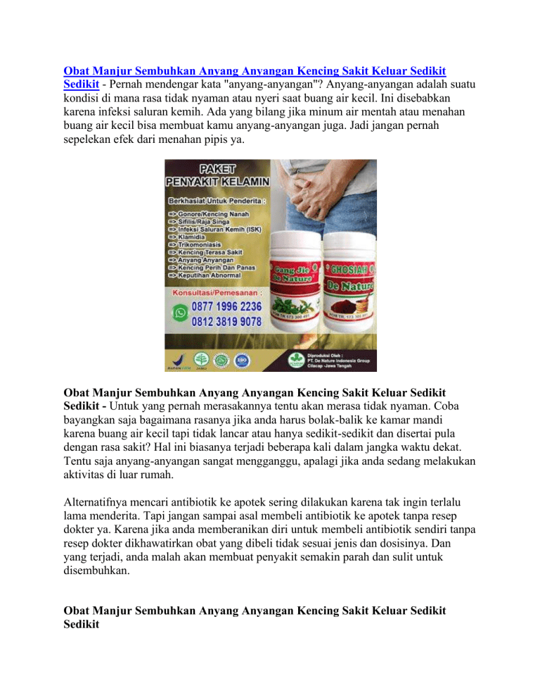Obat Manjur Sembuhkan Anyang Anyangan Kencing Sakit Keluar Sedikit Sedikit - Pernah mendengar kata "anyang-anyangan"? Anyang-anyangan adalah suatu kondisi di mana rasa tidak nyaman atau nyeri saat buang air kecil. Ini disebabkan karena infeksi saluran kemih. Ada yang bilang jika minum air mentah atau menahan buang air kecil bisa membuat kamu anyang-anyangan juga. Jadi jangan pernah sepelekan efek dari menahan pipis ya. Obat Manjur Sembuhkan Anyang Anyangan Kencing Sakit Keluar Sedikit Sedikit - Untuk yang pernah merasakannya tentu akan merasa tidak nyaman. Coba bayangkan saja bagaimana rasanya jika anda harus bolak-balik ke kamar mandi karena buang air kecil tapi tidak lancar atau hanya sedikit-sedikit dan disertai pula dengan rasa sakit? Hal ini biasanya terjadi beberapa kali dalam jangka waktu dekat. Tentu saja anyang-anyangan sangat mengganggu, apalagi jika anda sedang melakukan aktivitas di luar rumah. Alternatifnya mencari antibiotik ke apotek sering dilakukan karena tak ingin terlalu lama menderita. Tapi jangan sampai asal membeli antibiotik ke apotek tanpa resep dokter ya. Karena jika anda memberanikan diri untuk membeli antibiotik sendiri tanpa resep dokter dikhawatirkan obat yang dibeli tidak sesuai jenis dan dosisinya. Dan yang terjadi, anda malah akan membuat penyakit semakin parah dan sulit untuk disembuhkan. Obat Manjur Sembuhkan Anyang Anyangan Kencing Sakit Keluar Sedikit Sedikit Kencing yang terasa nyeri (perih), lebih sering, namun sedikit-sedikit sering disebut oleh masyarakat awam dengan istilah “anyang-anyangan”. Istilah ini tentu bukan merupakan diagnosis suatu penyakit, melainkan hanya gejala. Dalam dunia medis penyakit ini biasa disebut ISK (Infeksi saluran kemih). ISK merupakan salah satu penyakit yang tergolong kedalam penyakit kelamin. Secara umum penyakit kelamin yang sering dijumpai yaitu terdiri dari penyakit kencing nanah atau gonore, sipilis atau rajasinga, infeksi saluran kemih atau ISK, trikomoniasis, klamidia. Pria dan wanita sama sama berpeluang mengalami penyakit kelamin. Semua itu tergantung riwayat atau pola hidup. Kebiasaan hidup yang tidak sehat, baik secara seksual atau lainnya akan berdampak munculnya penyakit pada alat vital atau kelamin. INFEKSI SALURAN KEMIH / ISK Infeksi saluran kemih / kencing (ISK) adalah infeksi bakteri yang mengenai bagian dari saluran kemih. Ketika mengenai saluran kemih bawah dinamai sistitis (infeksi kandung kemih) sederhana, dan ketika mengenai saluran kemih atas dinamai pielonefritis (infeksi ginjal). Gejala dari saluran kemih bawah meliputi buang air kecil terasa sakit dan sering buang air kecil atau desakan untuk buang air kecil (atau keduanya), sementara gejala pielonefritis meliputi demam dan nyeri panggul di samping gejala ISK bawah. Pada orang lanjut usia dan anak kecil, gejalanya bisa jadi samar atau tidak spesifik. Kuman tersering penyebab kedua tipe tersebut adalah Escherichia coli, tetapi bakteri lain, virus, maupun jamur dapat menjadi penyebab meskipun jarang. Obat Manjur Sembuhkan Anyang Anyangan Kencing Sakit Keluar Sedikit Sedikit - Sebagian besar kasus ISK disebabkan oleh bakteri Escherichia coli atau E. coli yang umumnya hidup di dalam saluran cerna. Bakteri ini masuk ke dalam saluran uretra seseorang ketika kurang baik dalam melakukan pembersihan setelah buang air besar maupun kecil. Misalnya pada saat kertas toilet yang dia gunakan untuk membersihkan anus turut menyentuh organ kelaminnya. Maka bakteri dapat masuk ke saluran kemih. Dalam kasus seperti ini wanita lebih rentan terkena ISK. Karena jarak uretra dengan anus pada tubuh mereka lebih dekat dan pintu uretra yang dekat dengan kandung kemih. Gejala Infeksi Saluran Kemih Bagian atas: Demam dengan suhu tinggi lebih dari 38º C. Menggigil tak terkendali. Rasa mual ingin muntah. Bahkan sampai muntah. Buang air besar encer (diare). Nyeri pada perut bagian bawah. Gejala Infeksi Saluran Kemih Bagian Bawah Sindrom uretra: Sering buang air kecil atau dorongan ingin selalu buang air kecil. Rasa nyeri tumpul yang konstan pada daerah kemaluan. Nyeri saat buang air kecil (disuria). Air seni berawan atau bahkan ada darah dalam urin (hematuria). Air seni berbau tak sedap. Sakit punggung. Secara umum merasa tidak sehat. Obat Infeksi Saluran Kemih (ISK) - Anyang Anyangan - Kencing Nanah/Gonore - Sipilis/Raja Singa - Klamidia - Penyakit Kelamin Herbal Alami Obat Manjur Sembuhkan Anyang Anyangan Kencing Sakit Keluar Sedikit Sedikit - Ijinkan kami memberikan informasi mengenai cara mengobati infeksi saluran kemih (isk), anyang anyangan, kencing nanah/gonore, sipilis/raja singa, anyang anyangan dan berbagai jenis penyakit kelamin lainnya lainnya secara alami dengan Obat Herbal De Nature. Paket Obat Herbal ini terdiri dari Gang Jie Dan Gho Siah. Obat berbahan dasar herbal dan diracik secara modern sesuai aturan BPOM. Atau dengan kata lain Obat alami ini sudah terdaftar resmi di BPOM. Produk Herbal Gang Jie dan Gho Siah merupakan produk eksklusif dari De Nature. Gang Jie POM.TR 173 300 491 Gho Siah POM.TR 173 305 881 KOMPOSISI: Gang Jie : Orthosiphon stamineus folium 1250mg Imperatae cylindrica rhozoma 625mg Andrographis paniculata folium 625mg Gho Siah : Lumbricus rubellus ekstrak 500mg BERKHASIAT UNTUK : Mengobati Sipilis/Rajasinga/Gonore/Kencing Nanah/Infeksi Saluran Kemih/Anyang Anyangan Sebagai Antivirus Memperbaiki jaringan sel pada bagian uretric Memulihkan stamina Menjaga kesehatan Mengobati Saluran Kencing Membantu meningkatkan sistem imunitas (kekebalan tubuh), serta membantu mempercepat proses pemulihan kondisi badan. ATURAN MINUM : /Botol isi 50 kapsul Gang Jie : 2 kapsul sekali minum (3x sehari) Gho Siah : 2 kapsul sekali minum (3x sehari) *Diminum 1 jam sebelum makan (Lengkap ada di kemasan/label obat) Sekedar informasi untuk kenyamanan Konsumen, bahwa Produk dari perusahaan kami ini sudah memiliki: Ijin Resmi Perusahaan dari Kementerian Kesehatan Ijin BPOM, yang artinya sudah lulus uji stabilitas Produk Sertifikat Halal MUI, sehingga kehalalannya b