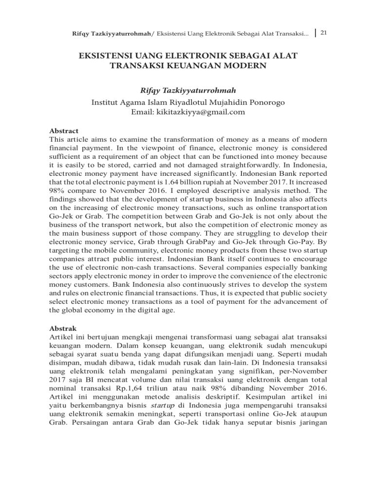 Rifqy Tazkiyyaturrohmah/ Eksistensi Uang Elektronik Sebagai Alat Transaksi... 21 EKSISTENSI UANG ELEKTRONIK SEBAGAI ALAT TRANSAKSI KEUANGAN MODERN Rifqy Tazkiyyaturrohmah Institut Agama Islam Riyadlotul Mujahidin Ponorogo Email: [email protected] Abstract This article aims to examine the transformation of money as a means of modern financial payment. In the viewpoint of finance, electronic money is considered sufficient as a requirement of an object that can be functioned into money because it is easily to be stored, carried and not damaged straightforwardly. In Indonesia, electronic money payment have increased significantly. Indonesian Bank reported that the total electronic payment is 1.64 billion rupiah at November 2017. It increased 98% compare to November 2016. I employed descriptive analysis method. The findings showed that the development of startup business in Indonesia also affects on the increasing of electronic money transactions, such as online transportation Go-Jek or Grab. The competition between Grab and Go-Jek is not only about the business of the transport network, but also the competition of electronic money as the main business support of those company. They are struggling to develop their electronic money service, Grab through GrabPay and Go-Jek through Go-Pay. By targeting the mobile community, electronic money products from these two startup companies attract public interest. Indonesian Bank itself continues to encourage the use of electronic non-cash transactions. Several companies especially banking sectors apply electronic money in order to improve the convenience of the electronic money customers. Bank Indonesia also continuously strives to develop the system and rules on electronic financial transactions. Thus, it is expected that public society select electronic money transactions as a tool of payment for the advancement of the global economy in the digital age. Abstrak Artikel ini bertujuan mengkaji mengenai transformasi uang sebagai alat transaksi keuangan modern. Dalam konsep keuangan, uang elektronik sudah mencukupi sebagai syarat suatu benda yang dapat difungsikan menjadi uang. Seperti mudah disimpan, mudah dibawa, tidak mudah rusak dan lain-lain. Di Indonesia transaksi uang elektronik telah mengalami peningkatan yang signifikan, per-November 2017 saja BI mencatat volume dan nilai transaksi uang elektronik dengan total nominal transaksi Rp.1,64 triliun atau naik 98% dibanding November 2016. Artikel ini menggunakan metode analisis deskriptif. Kesimpulan artikel ini yaitu berkembangnya bisnis startup di Indonesia juga mempengaruhi transaksi uang elektronik semakin meningkat, seperti transportasi online Go-Jek ataupun Grab. Persaingan antara Grab dan Go-Jek tidak hanya seputar bisnis jaringan 22 Muslim Heritage, Vol. 3, No.1, Mei 2018 tranportasi saja, namun juga persaingan uang elektronik sebagai pendukung bisnis utama perusahaan. Grab melalui GrabPay dan Go-Jek melalui Go-Pay berjuang mengembangkan layanan uang elektronik mereka. Dengan menyasar masyarakat mobile, produk uang elektronik dari dua perusahaan startup ini cukup diminati masyarakat. Bank Indonesia sendiri terus mendorong penggunaan dan penerapan transaksi non tunai dengan uang elektronik. Sudah banyak perusahaan perbankan maupun perusahaan lainnya seperti jasa menggunakan uang elektronik, dan untuk meningkatkan kenyamanan para pengguna uang elektronik. Bank Indonesia juga terus berupaya melakukan pengembangan dan perbaikan terkait sistem maupun aturan tentang transaksi keuangan elektronik. Dengan demikian diharapkan transaksi uang elektronik terus menjadi pilihan masyarakat sebagai instrumen transaksi pembayaran demi kemajuan perekonomian global di era digital. Keywords: technology, electronic money, modern financial, financial transaction A. Pendahuluan Era digital saat ini, mengharuskan masyarakat untuk cerdas dapat memanfaatkan kemudahan dan keefektifan dalam berinteraksi antara satu sama lain. Berbagai inovasi digital pada berbagai bidang membuktikan bahwa masyarakat juga turut andil dalam perkembangan zaman yang semakin modern. Berkembangnya bisnis financial technology (fintech) juga ikut mempengaruhi munculnya perusahaan startup yang bergerak di sektor keuangan digital. Salah satu produk finansial digital tersebut adalah uang elektronik (e-money). Dengan munculnya uang elektronik akan memungkinkan masyarakat untuk melakukan transaksi finansial tanpa menggunakan uang tunai. Menjamurnya bisnis startup membuat para pelaku usaha ini berlomba-lomba melakukan inovasi-inovasi dalam produk finansial digitalnya, sebut saja Go-Pay dari Go-Jek. Menurut hasil survei JakPat dalam Startup Report 2017 DailySocial. Id, Go-Pay merupakan uang elektronik yang terpopuler serta paling banyak diminati publik. Sebanyak 50% responden yang di survei memiliki uang elektronik yang dikeluarkan oleh perusahaan penyedia jasa transportasi online Go-Jek. Sementara e-money dari Bank Mandiri dan TCASH milik Telkomsel berada di urutan kedua dan ketiga.1 Keterlibatan Indonesia dalam forum-forum ekonomi dunia juga telah sedikit mempengaruhi kebijakan ekonomi di Indonesia, salah satunya adalah kebijakan mengenai sistem pembayaran. Di Indonesia sistem pembayaran secara umum masih menggunakan uang tunai sebagai alat pembayaran, 1 Databoks Katadata Indonedia, “GoPay Uang Elektronik Terpopuler di Indonesia,” dikutip dari https:// databoks.katadata.co.id/datapublish/2018/02/13/go-pay-uang-elektronik-terpopuler-di-indonesia diakses pada 3 Maret 2018 Rifqy Tazkiyyaturrohmah/ Eksistensi Uang Elektronik Sebagai Alat Transaksi... 23 padahal dengan banyaknya uang yang beredar di masyarakat dapat memicu meningkatnya inflasi. Inilah yang membuat beberapa negara lain seperti Jepang, Singapura, Inggris dan Amerika Serikat sudah terlebih dahulu menerapkan sistem pembayaran menggunakan uang elektronik.2 Perkembangan uang elektronik bukan disebabkan oleh Bank Indonesia, namun disebabkan oleh perkembangan teknologi informasi dan komunikasi