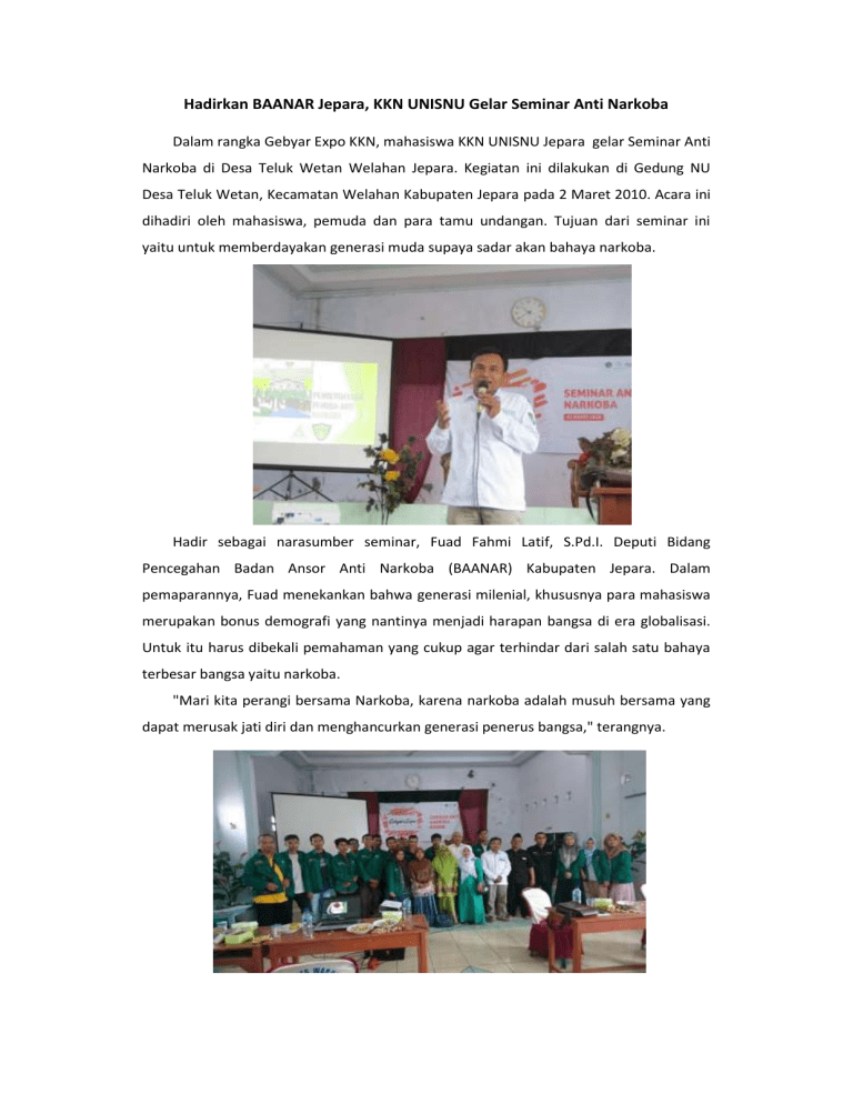 Hadirkan BAANAR Jepara, KKN UNISNU Gelar Seminar Anti Narkoba Dalam rangka Gebyar Expo KKN, mahasiswa KKN UNISNU Jepara gelar Seminar Anti Narkoba di Desa Teluk Wetan Welahan Jepara. Kegiatan ini dilakukan di Gedung NU Desa Teluk Wetan, Kecamatan Welahan Kabupaten Jepara pada 2 Maret 2010. Acara ini dihadiri oleh mahasiswa, pemuda dan para tamu undangan. Tujuan dari seminar ini yaitu untuk memberdayakan generasi muda supaya sadar akan bahaya narkoba. Hadir sebagai narasumber seminar, Fuad Fahmi Latif, S.Pd.I. Deputi Bidang Pencegahan Badan Ansor Anti Narkoba (BAANAR) Kabupaten Jepara. Dalam pemaparannya, Fuad menekankan bahwa generasi milenial, khususnya para mahasiswa merupakan bonus demografi yang nantinya menjadi harapan bangsa di era globalisasi. Untuk itu harus dibekali pemahaman yang cukup agar terhindar dari salah satu bahaya terbesar bangsa yaitu narkoba. "Mari kita perangi bersama Narkoba, karena narkoba adalah musuh bersama yang dapat merusak jati diri dan menghancurkan generasi penerus bangsa," terangnya.