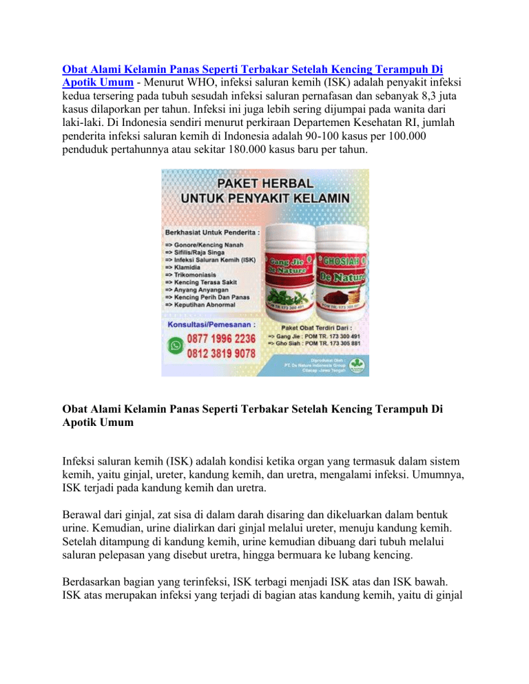 Obat Alami Kelamin Panas Seperti Terbakar Setelah Kencing Terampuh Di Apotik Umum - Menurut WHO, infeksi saluran kemih (ISK) adalah penyakit infeksi kedua tersering pada tubuh sesudah infeksi saluran pernafasan dan sebanyak 8,3 juta kasus dilaporkan per tahun. Infeksi ini juga lebih sering dijumpai pada wanita dari laki-laki. Di Indonesia sendiri menurut perkiraan Departemen Kesehatan RI, jumlah penderita infeksi saluran kemih di Indonesia adalah 90-100 kasus per 100.000 penduduk pertahunnya atau sekitar 180.000 kasus baru per tahun. Obat Alami Kelamin Panas Seperti Terbakar Setelah Kencing Terampuh Di Apotik Umum Infeksi saluran kemih (ISK) adalah kondisi ketika organ yang termasuk dalam sistem kemih, yaitu ginjal, ureter, kandung kemih, dan uretra, mengalami infeksi. Umumnya, ISK terjadi pada kandung kemih dan uretra. Berawal dari ginjal, zat sisa di dalam darah disaring dan dikeluarkan dalam bentuk urine. Kemudian, urine dialirkan dari ginjal melalui ureter, menuju kandung kemih. Setelah ditampung di kandung kemih, urine kemudian dibuang dari tubuh melalui saluran pelepasan yang disebut uretra, hingga bermuara ke lubang kencing. Berdasarkan bagian yang terinfeksi, ISK terbagi menjadi ISK atas dan ISK bawah. ISK atas merupakan infeksi yang terjadi di bagian atas kandung kemih, yaitu di ginjal dan ureter. Sedangkan ISK bawah adalah infeksi pada kandung kemih bagian bawah, yaitu kandung kemih dan uretra. ISK atas lebih berbahaya dan dapat memicu urosepsis, yaitu kondisi ketika bakteri di ginjal yang terinfeksi menyebar ke darah. Urosepsis bisa mengakibatkan tekanan darah turun hingga syok, bahkan kematian. Gejala dan Penyebab Infeksi Saluran Kemih Gejala infeksi saluran kemih sangat beragam, di antaranya: Demam Sakit di perut dan panggul Panas atau pedih saat buang air kecil Nyeri saat buang air kecil Kencing terasa tidak tuntas Muncul darah dalam urine Adapun penyebab infeksi saluran kemih adalah masuknya bakteri ke saluran kemih melalui lubang kencing. Meski bisa terjadi pada siapa saja, tetapi penyakit ini lebih sering dialami wanita, termasuk ibu hamil. Cara mengatasi sensasi 'terbakar' saat berkemih Minum banyak air. Dehidrasi adalah salah satu penyebab umum dari sensasi 'terbakar' saat buang air kecil. Warna urin akan menjadi gelap dan muncul rasa 'terbakar' saat berkemih. Minum 2-3 gelas air pada interval yang dekat. Jika saluran kemih masih terasa 'terbakar' setelah beberapa jam, itu adalah gejala ISK. Minum jus cranberry atau yang mengandung citrun. Anda juga dapat menggantinya dengan jus jeruk atau lemon. Asam yang berasal dari buah dapat membunuh bakteri yang menyebabkan ISK. Air kelapa merupakan obat alami untuk menyembuhkan sensasi 'terbakar' saat berkemih. Minum 2-3 gelas air kelapa untuk menghilangkan nyeri sewaktu buang air kecil. Kekeringan pada vagina juga dapat menyebabkan sensasi 'terbakar'. Jangan gunakan pelumas atau yang semacamnya. Bahan kimia dapat menyebabkan infeksi saluran kemih dan vagina. Menjaga kebersihan organ genital. Bersihkan daerah kelamin dua atau tiga kali dalam sehari, jika Anda rentan terhadap infeksi saluran kemih. Jika rasa nyeri tak kunjung hilang, berkonsultasilah dengan dokter. Perbanyak minum air dan jagalah kebersihan organ genital. Obat Infeksi Saluran Kemih (ISK) - Anyang Anyangan - Kencing Nanah/Gonore - Sipilis/Raja Singa - Klamidia - Penyakit Kelamin Herbal Alami Produk Herbal Gang Jie dan Gho Siah merupakan produk eksklusif dari De Nature. Gang Jie POM.TR 173 300 491 Gho Siah POM.TR 173 305 881 KOMPOSISI: Gang Jie : Orthosiphon stamineus folium 1250mg Imperatae cylindrica rhozoma 625mg Andrographis paniculata folium 625mg Gho Siah : Lumbricus rubellus ekstrak 500mg BERKHASIAT UNTUK : Mengobati Sipilis/Rajasinga/Gonore/Kencing Nanah/Infeksi Saluran Kemih/Anyang Anyangan Sebagai Antivirus Memperbaiki jaringan sel pada bagian uretric Memulihkan stamina Menjaga kesehatan Mengobati Saluran Kencing Membantu meningkatkan sistem imunitas (kekebalan tubuh), serta membantu mempercepat proses pemulihan kondisi badan. ATURAN MINUM : /Botol isi 50 kapsul Gang Jie : 2 kapsul sekali minum (3x sehari) Gho Siah : 2 kapsul sekali minum (3x sehari) *Diminum 1 jam sebelum makan (Lengkap ada di kemasan/label obat) Sekedar informasi untuk kenyamanan Konsumen, bahwa Produk dari perusahaan kami ini sudah memiliki: Ijin Resmi Perusahaan dari Kementerian Kesehatan Ijin BPOM, yang artinya sudah lulus uji stabilitas Produk Sertifikat Halal MUI, sehingga kehalalannya bisa dipertanggungjawabkan Apoteker Yang berpengalaman Sudah melewati Proses Sortir Bahan Baku, Guna Menjaga Mutu Produk Proses Produksi Sesuai Alur CPOTB (Cara Pembuatan Obat Tradisional Yang Baik Dan Benar) Sertifikat ISO 9001 : 2015 yang artinya sudah Berstandar Internasional Untuk informasi lebih lanjut mengenai Produk dan Harga, Cara Pemesanan/ Konsultasi atau hal lainnya, anda dapat menghubungi kami melalui Telpon/WhatsApp/SMS (Online 24 jam / Fast Respon) pada nomor yang tertera pada gambar obat di atas. Penelusuran yang terkait dengan Obat Alami Kelamin Panas Seperti Terbakar Setelah Kencing Terampuh Di Apotik Umum : obat tradisional nyeri pada kemaluan pria di apotik, buang air kecil terasa panas dan cara mengatasinya, obat kencing sakit di apotik, obat nyeri saat kencing terakhir, obat nyeri saat kencing terakhir di apotik, obat kencing darah di apotik umum, obat tradisional kencing tidak tuntas, obat herbal kucing susah kencing