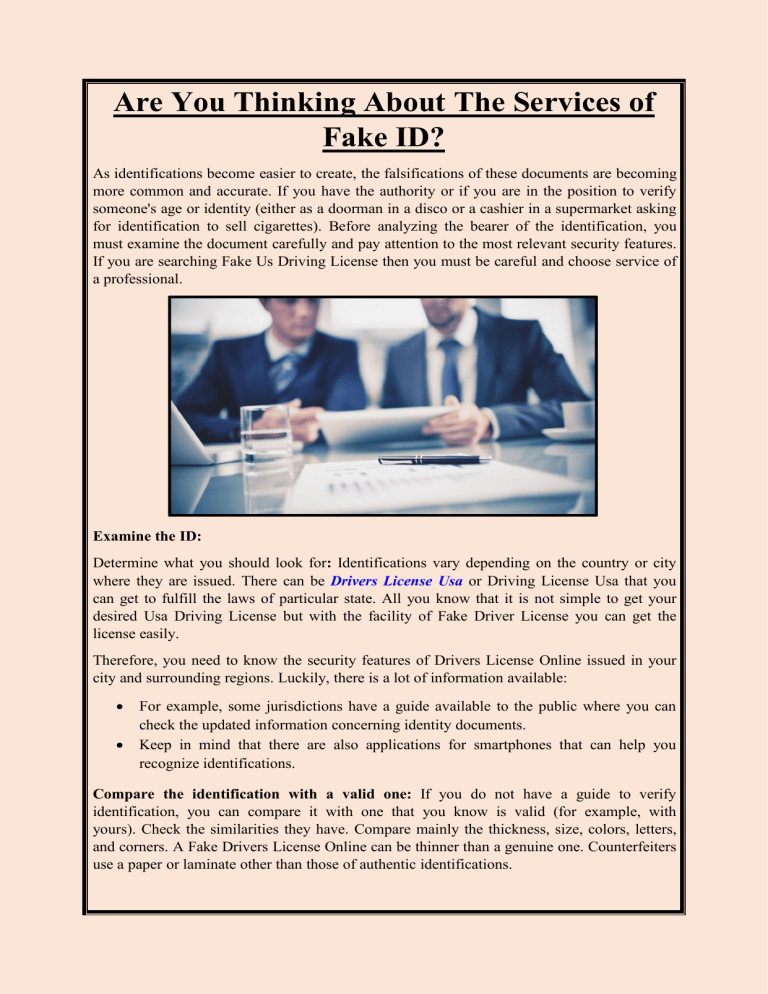 Are You Thinking About The Services of Fake ID? As identifications become easier to create, the falsifications of these documents are becoming more common and accurate. If you have the authority or if you are in the position to verify someone's age or identity (either as a doorman in a disco or a cashier in a supermarket asking for identification to sell cigarettes). Before analyzing the bearer of the identification, you must examine the document carefully and pay attention to the most relevant security features. If you are searching Fake Us Driving License then you must be careful and choose service of a professional. Examine the ID: Determine what you should look for: Identifications vary depending on the country or city where they are issued. There can be Drivers License Usa or Driving License Usa that you can get to fulfill the laws of particular state. All you know that it is not simple to get your desired Usa Driving License but with the facility of Fake Driver License you can get the license easily. Therefore, you need to know the security features of Drivers License Online issued in your city and surrounding regions. Luckily, there is a lot of information available: For example, some jurisdictions have a guide available to the public where you can check the updated information concerning identity documents. Keep in mind that there are also applications for smartphones that can help you recognize identifications. Compare the identification with a valid one: If you do not have a guide to verify identification, you can compare it with one that you know is valid (for example, with yours). Check the similarities they have. Compare mainly the thickness, size, colors, letters, and corners. A Fake Drivers License Online can be thinner than a genuine one. Counterfeiters use a paper or laminate other than those of authentic identifications. Use a magnifying glass to examine the microprint: Almost all jurisdictions use microprinting as a security record. This resembles a straight line, but when enlarged 10 times, you can see the words. Use a 10x magnifying glass to see if the identification carries a micro print. This microprinting is located in different places depending on the jurisdiction where it is issued. Hold the identification against ultraviolet light: Depending on the jurisdiction where they are issued, you will see some security features if you place them against ultraviolet light. For example, some identifications have a second dimmer image of the headline that can only be seen through ultraviolet light. Scan the barcode: The barcode in Fake Drivers License contains information that must match the one found on the front of the document. Most counterfeiters encode the information because it is very expensive. Therefore, it scans the barcode and determines if the information has been encoded and if it matches the one indicated on the front. Look for spelling mistakes in the identification: If an identification includes a misspelling (an incorrect abbreviation of the city), you can detect the fake id. Remember that identification with misspellings is not authentic.