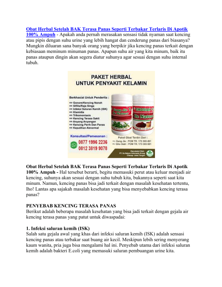 Obat Herbal Setelah BAK Terasa Panas Seperti Terbakar Terlaris Di Apotik 100% Ampuh - Apakah anda pernah merasakan sensasi tidak nyaman saat kencing atau pipis dengan suhu urine yang lebih hangat dan cenderung panas dari biasanya? Mungkin diluaran sana banyak orang yang berpikir jika kencing panas terkait dengan kebiasaan meminum minuman panas. Apapun suhu air yang kita minum, baik itu panas ataupun dingin akan segera diatur suhunya agar sesuai dengan suhu internal tubuh. Obat Herbal Setelah BAK Terasa Panas Seperti Terbakar Terlaris Di Apotik 100% Ampuh - Hal tersebut berarti, begitu memasuki perut atau keluar menjadi air kencing, suhunya akan sesuai dengan suhu tubuh kita, bukannya seperti saat kita minum. Namun, kencing panas bisa jadi terkait dengan masalah kesehatan tertentu, lho! Lantas apa sajakah masalah kesehatan yang bisa menyebabkan kencing terasa panas? PENYEBAB KENCING TERASA PANAS Berikut adalah beberapa masalah kesehatan yang bisa jadi terkait dengan gejala air kencing terasa panas yang patut untuk diwaspadai: 1. Infeksi saluran kemih (ISK) Salah satu gejala awal yang khas dari infeksi saluran kemih (ISK) adalah sensasi kencing panas atau terbakar saat buang air kecil. Meskipun lebih sering menyerang kaum wanita, pria juga bisa mengalami hal ini. Penyebab utama dari infeksi saluran kemih adalah bakteri E.coli yang memasuki saluran pembuangan urine kita. Selain kencing terasa panas, mungkin juga mengalami gejala lain seperti kencing yang tidak tuntas (menyebabkan sering ke toilet), urine yang berbau menyengat, hingga kencing anyang anyangan disertai darah. Jika infeksi saluran kemih tak kunjung diobati, bisa jadi infeksi ini bisa menyebar ke ginjal dan menyebabkan dampak kesehatan yang jauh lebih berat. 2. Infeksi menular seksual (IMS) Beberapa jenis penyakit kelamin seperti klamidia ternyata juga bisa menyebabkan munculnya gejala kencing panas dan nyeri saat buang air kecil. Klamidia juga dapat menyebabkan keluarnya cairan dari vagina atau penis, dan pada pria dapat menyebabkan testis bengkak atau sakit. Mereka yang melakukan kehidupan seks tidak aman atau sering berganti pasangan cenderung rentan mengalami infeksi menular seksual. Siapa pun yang pernah melakukan hubungan seksual dapat terkena IMS, walaupun sebelumnya dinyatakan negatif. Beberapa penderita IMS bebas dari gejala untuk waktu yang lama, jadi periode yang lama tanpa gejala tidak berarti tidak mengalami IMS. 3. Infeksi kelamin Gejala paling sering dari infeksi kelamin adalah kencing terasa panas. Pada kaum hawa, infeksi ini bisa disebabkan oleh jamur atau bakteri yang menyebabkan peradangan vagina atau vaginitis dan vulvodynia. Sementara itu, infeksi kelamin pada kaum pria bisa disebabkan oleh peradangan epididimis atau epididimitis dan peradangan pada prostat. Epididimis adalah tabung yang berisi sperma di atas testis. Infeksi atau inflamasi pada tabung ini dapat menyebabkan rasa sakit saat buang air kecil. Pria yang menderita epididimitis juga mungkin mengalami pembengkakan di sekitar testis, rasa sakit pada penis atau testis, dan demam. Kondisi menyakitkan ini biasanya disebabkan oleh infeksi bakteri atau pembedahan dan dapat diatasi dengan antibiotik dan istirahat. 4. Infeksi lainnya Salah satu cara tubuh melawan infeksi adalah dengan memanaskan. Inilah sebabnya mengapa orang sering mengalami demam ketika sakit. Ketika suhu urine lebih tinggi dari biasanya, ini berarti seseorang mengalami demam. Demam bisa disebabkan oleh infeksi di bagian tubuh mana pun, jadi penting untuk mengetahui gejala dan memeriksakan diri ke dokter jika tidak membaik. Ketika air kencing panas dan terasa terbakar, ini mungkin berarti seseorang menderita ISK atau infeksi pada ginjal. 5. Munculnya luka di bagian uretra Urine yang kita keluarkan saat buang air kecil bersifat asam. Jika di bagian uretra atau lubang tempat mengeluarkan air seni mengalami luka, maka sifat asam ini menjadi penyebab setelah kencing terasa panas dan menyebabkan sensasi perih. Ada banyak sekali penyebab munculnya luka ini, yakni karena kebiasaan mencukur bulu kemaluan, lecet saat berhubungan intim, munculnya jerawat, dan hal-hal lainnya. Meski terlihat sepele, jika kondisi ini tidak ditangani dengan baik bisa saja menyebabkan infeksi yang memicu dampak yang jauh lebih parah. 6. Interstitial cystitis Masalah kesehatan ini terjadi akibat peradangan yang menyerang kandung kemih. Gejalanya tak hanya membuat air kencing panas, namun juga rasa nyeri pada panggul dan adanya tekanan pada kandung kemih. Interstitial cystitis lebih sering menyerang kaum wanita daripada kaum pria. 7. Pasca-melahirkan Mengingat proses persalinan berlangsung cukup berat dan bisa menyebabkan robekan pada perineum, maka saat buang air kecil robekan ini terkena dengan urine yang bersifat asam sehingga menyebabkan sensasi kencing panas dan terbakar selama beberapa saat. 8. Menopause Fase menopause membuat wanita mengalami penurunan produksi hormon estrogen. Hal ini ternyata berpengaruh besar pada kondisi organ vitalnya yang menjadi lebih kering. Kondisi ini juga menjadi penyebab setelah kencing terasa panas. 9. Prostatitis Prostatitis adalah pembengkakan, nyeri, dan peradangan pada prostat, biasanya karena infeksi bakteri. Pria yang menderita prostatitis dapat mengalami rasa sakit atau sensasi pipis panas, serta perubahan dalam aliran buang air kecil. Kondisi tersebut mungkin juga menyebabkan mual dan muntah, atau sakit selama ejakulasi. Penting untuk mendiagnosis penyebab prostatitis, sehingga pria yang menduga mengalami masalah prostat harus memeriksakan diri ke dokter. 10. Batu Kandung kemih Batu kandung kemih adalah batu mineral keras dalam kandung kemih. Batu kandung kemih terbentuk ketika mineral dalam urine pekat mengkristal. Kondisi ini sering terjadi ketika Anda tidak dapat sepenuhnya mengosongkan kandung kemih. Tanda dan gejala batu kandung kemih bervariasi, dari sakit perut yang parah hingga kencing berdarah. Terkadang, batu kandung kemih tidak menimbulkan gejala. Batu kandung kemih