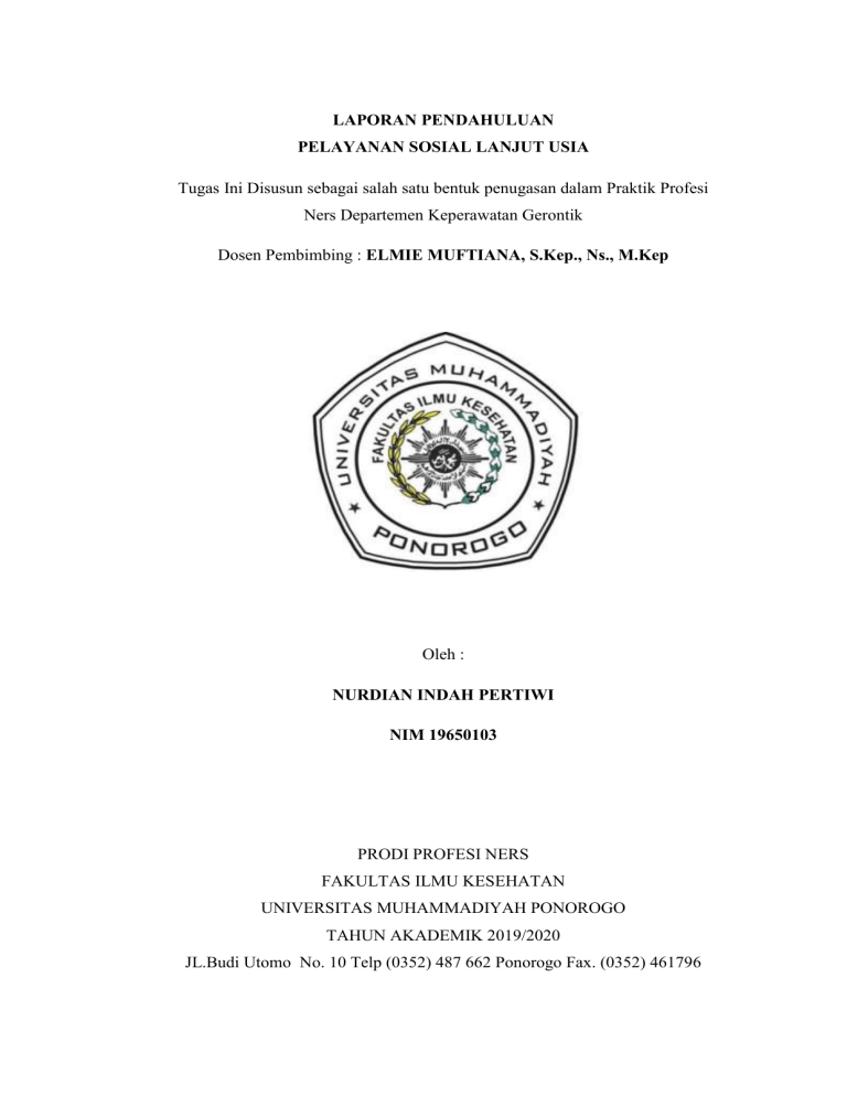 LAPORAN PENDAHULUAN PELAYANAN SOSIAL LANJUT USIA Tugas Ini Disusun sebagai salah satu bentuk penugasan dalam Praktik Profesi Ners Departemen Keperawatan Gerontik Dosen Pembimbing : ELMIE MUFTIANA, S.Kep., Ns., M.Kep Oleh : NURDIAN INDAH PERTIWI NIM 19650103 PRODI PROFESI NERS FAKULTAS ILMU KESEHATAN UNIVERSITAS MUHAMMADIYAH PONOROGO TAHUN AKADEMIK 2019/2020 JL.Budi Utomo No. 10 Telp (0352) 487 662 Ponorogo Fax. (0352) 461796 TINJAUAN PUSTAKA PELAYANAN SOSIAL LANJUT USIA A. Latar Belakang Lansia atau lanjut usia merupakan seseorang yang seharusnya mendapatkan perhatian khusus dari segi perawatan. Lansia sering kali dianggap identik dengan pikun, jompo, sakit-sakitan, dan menghabiskan uang untuk berobat. Upaya perlindungan dan pemenuhan hak kaum lansia harus berkesinambungan dan mendapatkan perhatian seluruh lapisan masyarakat. Sangat ironis bila gerakan menyejahterakan para lansia hanya bersifat temporer dan seremonial. Merawat orang di panti (residental care) dan menjamin terpenuhinya kebutuhan mereka adalah hal yang diharapkan namun sulit dilakukan (Crawford, Karin. 2015). Secara yuridis formal, ketentuan untuk memenuhi hak lansia diatur dalam pasal 42 UU No 39 Tahun 1999 tentang Hak Asasi Manusia yang menyatakan bahwa setiap warga negara yang berusia lanjut, cacat fisik, dan atau cacat mental berhak memperoleh perawatan, pendidikan, pelatihan, dan bantuan khusus atas biaya negara untuk menjamin kehidupan yang layak sesuai dengan martabat kemanusiaannya, meningkatkan rasa percaya diri, dan kemampuan berpartisipasi dalam kehidupan bermasyarakat (BKKBN,2015). Pada tahun 2000 penduduk usia lanjut di seluruh dunia diperkirakan sebanyak 426 juta atau sekitar 6,8%. Jumlah ini akan meningkat hampir dua kali lipat pada tahun 2025, yaitu menjadi sekitar 828 juta jiwa atau sekitar 9,7% dari total penduduk dunia (Notoadmojo, Soekidjo, 2016). Badan Pusat Statistik (BPS, 2010) menyimpulkan bahwa abad 21 bagi Indonesia merupakan abad lansia(era of population ageing), karena pertumbuhan penduduk lansia di Indonesia diperkirakan lebih cepat dibandingkan dengan negara-negara lain. Berdasarkan data Riskesdas 2018, Umur HarapanHidup (UHH) di Indonesia meningkat dari 68,6 tahun pada tahun2008 menjadi 70,6 tahun pada tahun 2012. Pada tahun 2016 meningkat menjadi 72 tahun. Kondisi tersebut mengakibatkanterjadinya peningkatkan jumlah penduduk Lanjut Usia. Menuruthasil Sensus penduduk tahun 2010 jumlah penduduk lanjut usiaIndonesia adalah 18,04 juta jiwa atau 7,6% dari total jumlahpenduduk. Pada tahun 2025 diperkirakan jumlah penduduk LanjutUsia akan meningkat menjadi 36 juta jiwa.Meningkatnya jumlah penduduk lanjut usia juga akanmempengaruhi angka beban ketergantungan. Perubahan komposisi penduduk lanjut usia menimbulkan berbagai kebutuhan baru yang harus dipenuhi, sehingga dapat pula menjadi permasalahan yang komplek bagilanjut usia, baik sebagai individu, keluarga maupun masyarakat.Sebagai lanjut usia tentu mereka memiliki kebutuhan yang berbeda dengan kelompok usia lainnya. Namun karena kondisi fisik dan keuangan mereka yang tidak memungkinkan sering kebutuhan mereka tidak terpenuhi. Pemerintah bertanggung jawab mewujudkan amanah perundangan untuk menyejahterakan lansia dengan menciptakan strategi dan program pemberdayaan Sumber Daya Manusia lanjut usia, menciptakan fasilitas dan kegiatan-kegiatan untuk mengisi hari-hari tuanya, serta meningkatkan upayaupaya terpadu pemberdayaan SDM lansia. Yang dibutuhkan adalah aksi nyata, bukan sekadar aturan semacam kertas yang terlihat indah. Usaha mengatasi permasalahan dan beberapa harapan kepada pihak-pihak yang peduli terhadap lansia harus terpadu. Pasal 138 Undang-Undang Nomor 36 Tahun 2009 tentangKesehatan menetapkan bahwa upaya pemeliharaan kesehatanbagi lanjut usia ditujukan untuk menjaga agar para lanjut usia tetapsehat dan produktif secara sosial dan ekonomis. Untuk itupemerintah wajib menjamin ketersediaan fasilitas pelayanankesehatan dan memfasilitasi kelompok lanjut usia untuk tetapdapat hidup mandiri dan produktif secara sosial dan ekonomis.Disamping hak atas kesehatan Lanjut Usia juga mempunyaihak yang sama dalam kehidupan bermasyarakat, berbangsa danbernegara. Upaya peningkatan kesejahteraan Lanjut Usiadiarahkan agar Lanjut Usia tetap diberdayakan sehingga dapatberperan dalam kegiatan pembangunan dengan memperhatikanfungsi, keterampilan, usia dan kondisi fisik dari Lanjut Usiatersebut. Pelayanan sosial merupakan suatu bentuk aktivitas yang bertujuan untuk membantu individu, kelompok, ataupun kesatuan masyarakat agar mereka mampu memenuhi kebutuhan-kebutuhannya, yang pada akhirnya mereka diharapkan dapat memecahkan permasalahan yang ada melalui tindakantindakan kerjasama ataupun melalui pemanfaatan sumber-sumber yang ada di masyarakat untuk memperbaiki kondisi kehidupannya. Hal ini didukung oleh Peraturan Pemerintah Republik Indonesia No.43 Tahun 2004 tentang Pelaksanaan Upaya Peningkatan Kesejahteraan Sosial Lanjut Usia. Adapun indikator yang dapat mendukung pelaksanaan program pelayanan sosial lanjut usia, dapat dilihat melalui : 1. Pelayanan sosial dasar (makanan, kesehatan, tempat tinggal) 2. Pelayanan teknis 3. Penyaluran bantuan B. Posyandu Lansia Posyandu lansia adalah pos pelayanan terpadu untuk masyarakat usia lanjut disuatu wilayah tertentu yang sudah disepakati, yang digerakkan oleh masyarakat dimana mereka bisa mendapatkan pelayanan kesehatan. Posyandu lansia merupakan pengembangan dari kebijakan pemerintah melalui pelayanan kesehatan bagi lansia yang penyelenggaraannya melalui program Puskesmas dengan melibatkan peran serta para lansia, keluarga, tokoh masyarakat dan organisasi sosial dalam penyelenggaraannya (Erfandi dalam Ritonga, 2013). Posyandu adalah suatu kegiatan masyarakat dalam upaya pelayanan kesehatan. Posyandu lansia merupakan pusat kegiatan masyarakat dalam upaya pelayanan kesehatan pada lanjut usia. Posyandu sebagai suatu wadah kegiatan yang bernuansa pemberdayaan masyarakat akan berjalan baik dan optimal apabila proses kepemi