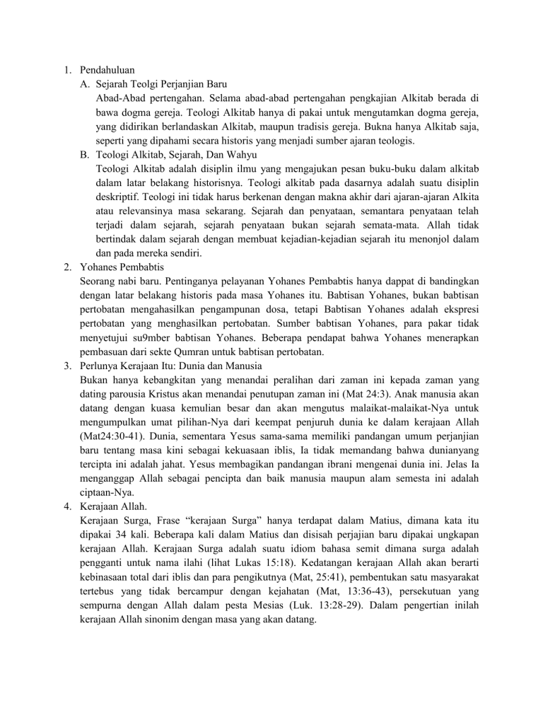 1. Pendahuluan A. Sejarah Teolgi Perjanjian Baru Abad-Abad pertengahan. Selama abad-abad pertengahan pengkajian Alkitab berada di bawa dogma gereja. Teologi Alkitab hanya di pakai untuk mengutamkan dogma gereja, yang didirikan berlandaskan Alkitab, maupun tradisis gereja. Bukna hanya Alkitab saja, seperti yang dipahami secara historis yang menjadi sumber ajaran teologis. B. Teologi Alkitab, Sejarah, Dan Wahyu Teologi Alkitab adalah disiplin ilmu yang mengajukan pesan buku-buku dalam alkitab dalam latar belakang historisnya. Teologi alkitab pada dasarnya adalah suatu disiplin deskriptif. Teologi ini tidak harus berkenan dengan makna akhir dari ajaran-ajaran Alkita atau relevansinya masa sekarang. Sejarah dan penyataan, semantara penyataan telah terjadi dalam sejarah, sejarah penyataan bukan sejarah semata-mata. Allah tidak bertindak dalam sejarah dengan membuat kejadian-kejadian sejarah itu menonjol dalam dan pada mereka sendiri. 2. Yohanes Pembabtis Seorang nabi baru. Pentinganya pelayanan Yohanes Pembabtis hanya dappat di bandingkan dengan latar belakang historis pada masa Yohanes itu. Babtisan Yohanes, bukan babtisan pertobatan mengahasilkan pengampunan dosa, tetapi Babtisan Yohanes adalah ekspresi pertobatan yang menghasilkan pertobatan. Sumber babtisan Yohanes, para pakar tidak menyetujui su9mber babtisan Yohanes. Beberapa pendapat bahwa Yohanes menerapkan pembasuan dari sekte Qumran untuk babtisan pertobatan. 3. Perlunya Kerajaan Itu: Dunia dan Manusia Bukan hanya kebangkitan yang menandai peralihan dari zaman ini kepada zaman yang dating parousia Kristus akan menandai penutupan zaman ini (Mat 24:3). Anak manusia akan datang dengan kuasa kemulian besar dan akan mengutus malaikat-malaikat-Nya untuk mengumpulkan umat pilihan-Nya dari keempat penjuruh dunia ke dalam kerajaan Allah (Mat24:30-41). Dunia, sementara Yesus sama-sama memiliki pandangan umum perjanjian baru tentang masa kini sebagai kekuasaan iblis, Ia tidak memandang bahwa dunianyang tercipta ini adalah jahat. Yesus membagikan pandangan ibrani mengenai dunia ini. Jelas Ia menganggap Allah sebagai pencipta dan baik manusia maupun alam semesta ini adalah ciptaan-Nya. 4. Kerajaan Allah. Kerajaan Surga, Frase “kerajaan Surga” hanya terdapat dalam Matius, dimana kata itu dipakai 34 kali. Beberapa kali dalam Matius dan disisah perjajian baru dipakai ungkapan kerajaan Allah. Kerajaan Surga adalah suatu idiom bahasa semit dimana surga adalah pengganti untuk nama ilahi (lihat Lukas 15:18). Kedatangan kerajaan Allah akan berarti kebinasaan total dari iblis dan para pengikutnya (Mat, 25:41), pembentukan satu masyarakat tertebus yang tidak bercampur dengan kejahatan (Mat, 13:36-43), persekutuan yang sempurna dengan Allah dalam pesta Mesias (Luk. 13:28-29). Dalam pengertian inilah kerajaan Allah sinonim dengan masa yang akan datang. 5. Masa Baru Keselamatan Anugerah Keselamatan, kerejaan sebagai pemberian Allah dapat dijelaskan lebih lanjut dengan studi tentang kata “keselamatan” Dalam Injil, kata-kata menyelamatkan dan keselamatan merujuk kepada suatuberkat eskatologi maupun berkat masa kini. Keselamatan eskatologis tidak hanya berarti penebusan tubuh saja, tetapi juga pemulihan persekutuan anatara Allah dengan manusia yang telah terputus oleh dosa. Dimensi Agama dari keselamatan eskatologi digamabarkan dalam suatu perbedaan yang tajam terhadapa apa yang di maksudkan dengan terhilang. 6. Allah Kerajaan Itu. Kerajaan itu adalah Kerajaan Allah, bukan milik manusia, yaitu baseleia tou theoou. Allha yang mencari. Tesis ini didukung oleh studi tentang konsep tertentu mengenai Allah yang temukan dalam ajaran-ajaran Yesus. Dalam Yesus Allah telah mengambil inisiatif untuk mencari orang berdosa, membawa kembali orang-orang yang terhilang kedalam berkat pemerintah-Nya. Singkatannya Ia adalah Allah yang mencari. Inti kabar baik tentang kerajaan Allah ialah bahwa Allah telah mengambil inisiatif untuk mencari dan menyelamatkan yang terhilang. Allah yang mengundang, Allah yang mencari adalah juga Allah yang mengundang. Yohanes memanggil manusia untuk meninggalkan dosa mereka bersarkan pandangan hari penghakimanyang akan datang, sedangkan Yesus memanggil manusia untuk menerima satu undangan. 7. Misteri kerajaan itu. Aturan penafisran penyelidikan kritik modern telah menempatkan dua aturan yang perlu untuk penafsiran perumpamaan-perumpamaan demi memperoleh pengertian historis yang benar. Perumpamaan adalah suatu cerita yang di angkat dari kehidupan sehari-hari untuk menyampaikan suatu moral atau kebenaran agama. Miateri itu adalah suatu penyingkapan baru atas maksud Allah untuk pengembangan kerajaan-Nya. Kebenaran yang baru itu, sekarang diberitakan kepada manusia melalu penyataan dalam pribadi dan Misi Yesus, yaitu bahwa kerajaan yang akhirnya akan datang dalam kuasa apokaliptis sebagaimana di ramalkan dalam Daniel, sesungguhnya sudah masuk dalam dunia lebih dahulu, dalam suatu bentuk yang tersebunyi yang bekerja secara rahasia di dalam dan diantara manusia. Perumpamaan Lalang lebih jauh menerangkan misteri Kerajaan itu, yaitu tersembunyi, dan tidak diduga kehadirannya di dunia. Yesus menegaskan bahwa di tengah-tengah zaman ini, sementara masyarkat berlansung terus dengan percampuran antara yang baik dan jahat sebelum kedatangan Anak Manusia dan manefestasi yang mulia dari kerajaan Allah, kuasa dari masa yang akan datang itu tekah masuk kedalam dunia untuk menciptakan anak-anak kerajaan, yaitu orang-orang yyang menikmati kuasa dan berkat-berkatnya. Kerajaan itu telah datang, tetapi masyarakat belum dijungkirbalikan. Inilah kerajaan itu. Perumpamaan biji sesawi menjelaskan kebenaran kerajaan itu, yang pada suatu ketika kelak akan menjadi pohon besar yang kini, telah di dalam dunia dalam bentuk butir kecil yang kini telah ada dalam dunia dalam bentuk butiran kecil yang tidak menonjol. Perumpamaan biji sesawi mengajarkan bahwa manefestasi lerajaan itu, yang kelak akan menjadi sebatang pohon yang besar kini seperti satu benih yang sangat kecil. R