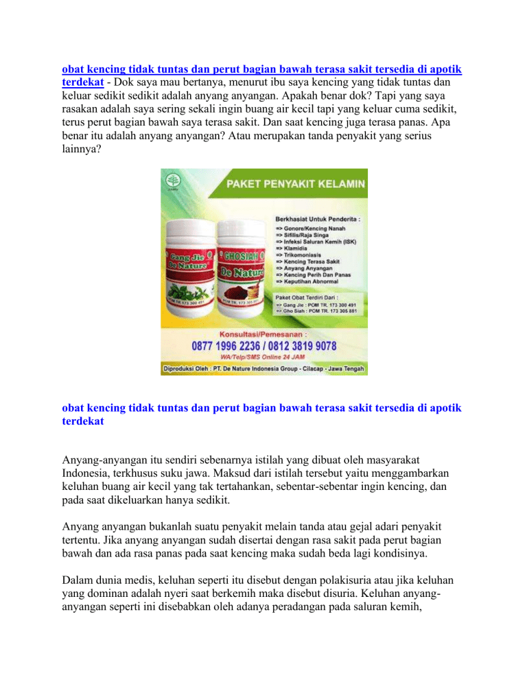 obat kencing tidak tuntas dan perut bagian bawah terasa sakit tersedia di apotik terdekat - Dok saya mau bertanya, menurut ibu saya kencing yang tidak tuntas dan keluar sedikit sedikit adalah anyang anyangan. Apakah benar dok? Tapi yang saya rasakan adalah saya sering sekali ingin buang air kecil tapi yang keluar cuma sedikit, terus perut bagian bawah saya terasa sakit. Dan saat kencing juga terasa panas. Apa benar itu adalah anyang anyangan? Atau merupakan tanda penyakit yang serius lainnya? obat kencing tidak tuntas dan perut bagian bawah terasa sakit tersedia di apotik terdekat Anyang-anyangan itu sendiri sebenarnya istilah yang dibuat oleh masyarakat Indonesia, terkhusus suku jawa. Maksud dari istilah tersebut yaitu menggambarkan keluhan buang air kecil yang tak tertahankan, sebentar-sebentar ingin kencing, dan pada saat dikeluarkan hanya sedikit. Anyang anyangan bukanlah suatu penyakit melain tanda atau gejal adari penyakit tertentu. Jika anyang anyangan sudah disertai dengan rasa sakit pada perut bagian bawah dan ada rasa panas pada saat kencing maka sudah beda lagi kondisinya. Dalam dunia medis, keluhan seperti itu disebut dengan polakisuria atau jika keluhan yang dominan adalah nyeri saat berkemih maka disebut disuria. Keluhan anyanganyangan seperti ini disebabkan oleh adanya peradangan pada saluran kemih, terutama pada kandung kemih. Hal utama yang menyebabkannya adalah Infeksi saluran kemih (ISK) akibat bakteri. obat kencing tidak tuntas dan perut bagian bawah terasa sakit tersedia di apotik terdekat Bakteri penyebab anyang-anyangan umumnya berasal dari luar tubuh kita, jenis tersering adalah E. Coli. Bakteri ini banyak terdapat dalam feses kita. Jadi bisa terbayang ya, tempat keluarnya feses dan urin itu kan berdekatan sehingga kebersihan setelah buang air memiliki peran penting. Tak heran, perempuan lebih beresiko terkena ISK karena secara logika uretra (saluran akhir pembuangan urin) lebih pendek dan kotoran mudah masuk. Terlebih lagi bagi mereka yang memiliki kebiasaan cebok yang salah, mengusap dari belakang ke depan. Padahal yang benar adalah dari depan ke belakang. Selain itu, pengantin baru juga beresiko akibat aktivitas seksual yang meningkat sehingga resiko masuknya bakteri ke saluran kemih lebih besar, disebut dengan "honeymoon cystitis". Untungnya hal ini bisa dicegah dengan beberapa tips dalam artikel ini. obat kencing tidak tuntas dan perut bagian bawah terasa sakit tersedia di apotik terdekat Infeksi saluran kemih (ISK) adalah kondisi ketika organ yang termasuk dalam sistem kemih, yaitu ginjal, ureter, kandung kemih, dan uretra, mengalami infeksi. Umumnya, ISK terjadi pada kandung kemih dan uretra. Berawal dari ginjal, zat sisa di dalam darah disaring dan dikeluarkan dalam bentuk urine. Kemudian, urine dialirkan dari ginjal melalui ureter, menuju kandung kemih. Setelah ditampung di kandung kemih, urine kemudian dibuang dari tubuh melalui saluran pelepasan yang disebut uretra, hingga bermuara ke lubang kencing. obat kencing tidak tuntas dan perut bagian bawah terasa sakit tersedia di apotik terdekat Berdasarkan bagian yang terinfeksi, ISK terbagi menjadi ISK atas dan ISK bawah. ISK atas merupakan infeksi yang terjadi di bagian atas kandung kemih, yaitu di ginjal dan ureter. Sedangkan ISK bawah adalah infeksi pada kandung kemih bagian bawah, yaitu kandung kemih dan uretra. ISK atas lebih berbahaya dan dapat memicu urosepsis, yaitu kondisi ketika bakteri di ginjal yang terinfeksi menyebar ke darah. Urosepsis bisa mengakibatkan tekanan darah turun hingga syok, bahkan kematian. GEJALA INFEKSI SALURAN KEMIH (ISK) Gejala infeksi saluran kemih tergantung kepada jenis infeksi yang dialami. Pada ISK atas, gejala utama adalah nyeri di pinggang, punggung bawah, atau selangkangan. Nyeri bisa bertambah buruk saat berkemih. Selain itu, gejala dapat berupa: Demam. Tubuh terasa dingin dan menggigil. Mual dan muntah. Diare. Sedangkan pada ISK bawah, gejala yang timbul meliputi: Nyeri saat buang air kecil. Ada rasa panas seperti terbakar pada saat buang air kecil. Frekuensi buang air kecil meningkat, namun jumlah urine sedikit. Tidak bisa menahan rasa ingin buang air kecil. Kandung kemih terasa masih penuh, meski sudah buang air kecil. Nyeri di perut bagian bawah. Nyeri pada panggul (pada wanita) atau di bagian rektum (pada pria). Bau urine sangat menyengat. Warna urine keruh. Terdapat darah dalam urine (hematuria). Lemas. PENGOBATAN INFEKSI SALURAN KEMIH (ISK) Penyakit ISK bagian atas membutuhkan pemberian obat antibiotik selama jangka waktu yang lebih lama. Namun dalam penggunaan antibiotik juga perlu menggunakan resep dokter agar bakteri tidak kebal terhadap antibiotik dan membuat penyakit semakin parah dan sulit untuk disembuhkan. Obat Infeksi Saluran Kemih (ISK) - Anyang Anyangan - Kencing Nanah/Gonore - Sipilis/Raja Singa - Klamidia - Penyakit Kelamin Herbal Alami De Nature Indonesia adalah sebuah perusahaan yang bergerak di bidang Obat Tradisional (OT) dari dalam Negeri, yang mencoba mengangkat dan menghidupkan kembali Budaya Nenek Moyang kita Yaitu Jamu Tradisional sebagai salah satu warisan leluhur budaya bangsa yang perlu dilestarikan. Produk De Nature dalam artikel ini khusus untuk mengatasi masalah kelamin / penyakit kelamin. Sekedar informasi untuk kenyamanan Konsumen, bahwa Produk dari perusahaan kami ini sudah memiliki: Ijin Resmi Perusahaan dari Kementerian Kesehatan Ijin BPOM, yang artinya sudah lulus uji stabilitas Produk Sertifikat Halal MUI, sehingga kehalalannya bisa dipertanggungjawabkan Apoteker Yang berpengalaman Sudah melewati Proses Sortir Bahan Baku, Guna Menjaga Mutu Produk Proses Produksi Sesuai Alur CPOTB (Cara Pembuatan Obat Tradisional Yang Baik Dan Benar) Sertifikat ISO 9001 : 2015 yang artinya sudah Berstandar Internasional Cara Pemesanan Obat De Nature: Pemasaran produk herbal kami secara online. Pelayanan pengiriman dilakukan baik dalam maupun luar negeri. Untuk dalam negeri mencakup seluruh wilayah selama dalam jangkauan jasa Tiki, JNE, J&T atau
