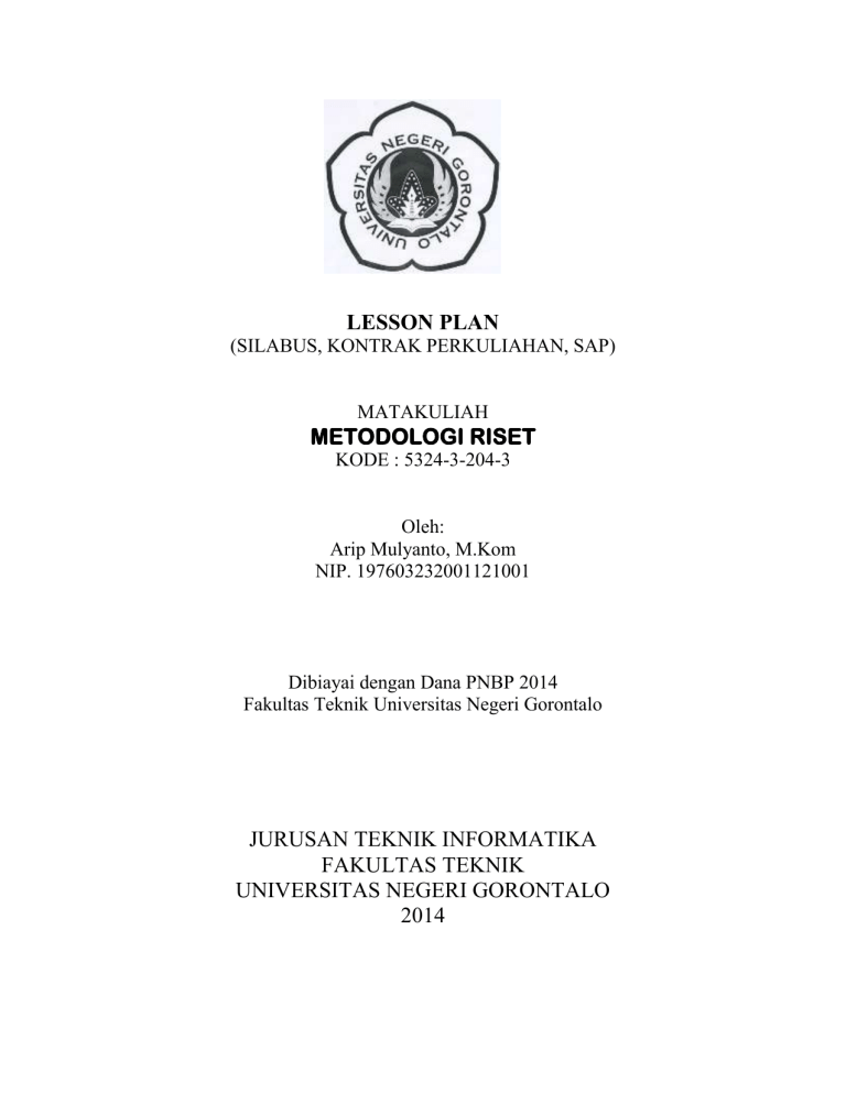 LESSON PLAN (SILABUS, KONTRAK PERKULIAHAN, SAP) MATAKULIAH METODOLOGI RISET KODE : 5324-3-204-3 Oleh: Arip Mulyanto, M.Kom NIP. 197603232001121001 Dibiayai dengan Dana PNBP 2014 Fakultas Teknik Universitas Negeri Gorontalo JURUSAN TEKNIK INFORMATIKA FAKULTAS TEKNIK UNIVERSITAS NEGERI GORONTALO 2014 LEMBAR PENGESAHAN 1. Judul 2. Identitas Mata Kuliah a. Mata Kuliah b. Kode Mata Kuliah c. Semester d. Tahun Akademik e. Jurusan f. Program Studi : : : : : : Metodologi Riset 5324-3-204-3 V (Lima) 2013/2014 Teknik Informatika S1 Pendidikan Teknologi Informasi Penyusun a. Nama b. NIP c. Pangkat/Golongan d. Jabatan e. Bidang Keahlian : : : : : Arip Mulyanto, M.Kom 197603232001121001 Pembina / IVa Lektor Kepala Ilmu Komputer 3. 4. Sumber Dana : Lesson Plan (Silabus, Kontrak Perkuliahan, Satuan Acara Perkuliahan) : PNBP 2014 Fakultas Teknik Universitas Negeri Gorontalo Gorontalo, 1 Desember 2014 Mengetahui, Ketua Jurusan Teknik Informatika, Penyusun, Tajuddin Abdillah, S.Kom., M.Cs. Arip Mulyanto, M.Kom. NIP. 19781208 200312 1 001 NIP. 197603232001121001 Menyetujui, Dekan Fakultas Teknik, Moh. Hidayat Koniyo, S.T., M.Kom NIP. 19730416 2001121 001 DAFTAR ISI Halaman sampul i Lembar Pengesahan ii Peta Kompetensi 1 Kontrak Perkuliahan 2 Silabus dan Sistem Penilaian 6 Satuan Acara Perkuliahan 14 PETA KOMPETENSI MATA KULIAH METODOLOGI RISET Mahasiswa mampu memahami prosedur penelitian dan menyusun proposal penelitian (8) Populasi dan Teknik Sampling (7) Pengumpulan Data (6) Skala Pengukuran Penelitian (5) Variabel Penelitian (4) Literature Review (3) Masalah Penelitian (2) Penelitian Bidang TI/SI (1) Konsep Dasar Penelitian 1 KONTRAK PERKULIAHAN Nama Matakuliah : Metodologi Riset Bobot SKS : 3 (tiga) Semester : Ganjil (V) Program Studi : S1 Pendidikan Teknologi Informasi Dosen Pengajar : Arip Mulyanto., M.Kom 1. Tujuan dan Manfaat Mata Kuliah a. Tujuan Mata Kuliah Setelah mengikuti mata kuliah ini mahasiswa mampu memahami prosedur penelitian dan menyusun proposal penelitian. b. Manfaat Mata Kuliah Dengan mengikuti mata kuliah ini mahasiswa memiliki pengalaman dalam menyusun proposal penelitian 2. Deskripsi Perkuliahan Mata kuliah ini membahas tentang konsep dasar penelitian, prosedur dalam penelitian serta teknk-teknik pengambilan sampel dalam penelitian. Materi mata kuliah ini terbagi menjadi 8 bagian. Bagian pertama, Konsep Dasar Penelitian, bertujuan memberikan ilustrasi definisi, langkah-langkah penelitian dan jenis penelitian serta pentingnya penelitian. Bagian kedua, Penelitian di Bidang TI/SI, menguraikan tema-tema penelitian di bidang Teknologi Informasi dan Sistem Informasi. Bagian ketiga, Masalah Penelitian menguraikan tentang cara memilih topik, cara menyusun rencana penelitian, dan bagian-bagian pada Pendahuluan penelitian. Bagian keempat, Literature Review, menjelaskan tentang definisi, sumber-sumber dan cara menyusun literature review. Bagian kelima, Variabel Penelitian menjelaskan definisi dan jenis variabel dalam penelitian. Bagian Keenam, Skala Pengukuran Penelitian menjelaskan definisi dan jenis skala pengukuran dalam penelitian. Bagian ketujuh Pengumpulan Data, menjelaskan teknik-teknik dalam pengumpulan data. Bagian Kedelapan Populasi dan Teknik Sampling, menjelaskan teknik-teknik pengambilan sampel. 3. Standar Kompetensi Setelah menyelesaikan mata kuliah ini, Mahasiswa mampu memahami prosedur penelitian dan menyusun proposal penelitian 4. Kompetensi Dasar 1. Mahasiswa mampu menjelaskan konsep dasar penelitian 2. Mahasiswa mampu menjelaskan konteks penelitian dalam bidang TI/SI 3. Mahasiswa mampu menjelaskan konteks masalah penelitian 4. Mahasiswa mampu menyusun literature review 5. Mahasiswa mampu menjelaskan konteks variabel penelitian 2 5. 6. Mahasiswa mampu menerapkan cara menghitung skala pengukuran penelitian 7. Mahasiswa mampu menjelaskan teknik pengumpulan data penelitian 8. Mahasiswa mampu menjelaskan cara pengambilan sampel penelitian Indikator Kompetensi 1.1. Mampu menjelaskan pengertian metode penelitian 1.2. Mampu menjelaskan langkah-langkah dalam penelitian 1.3. Mampu menjelaskan jenis-jenis penelitian 2.1. Mampu menjelaskan lingkup kajian sistem informasi 2.2. Mampu menjelaskan jenis-jenis penelitian teknologi informasi 2.3. Mampu menjelaskan tema-tema penelitian sistem informasi 3.1. Mampu menjelaskan cara memilih topik penelitian 3.2. Mampu menjelaskan cara menyusun latar belakang 3.3. Mampu merumuskan masalah penelitian 3.4. Mampu membatasi masalah penelitian 3.5. Mampu merumuskan tujuan penelitian 3.6. Mampu merumuskan manfaat penelitian 4.1. Mampu menjelaskan pengertian literature review 4.2. Mampu menjelaskan tujuan menyusun literature review 4.3. Mampu menjelaskan struktur literature review 4.4. Mampu menjelaskan langkah-langkah menyusun literature review 4.5. Mampu menjelaskan sumber-sumber literature review 5.1. Mampu menjelaskan pengertian variabel penelitian 5.2. Mampu menjelaskan jenis-jenis variabel penelitian 5.3. Mampu menjelaskan cara menetapkan variabel penelitian 6.1. Mampu menjelaskan definisi skala pengukuran penelitian 6.2. Mampu menjelaskan jenis-jenis skala pengukuran 6.3. Mampu menjelaskan tipe-tipe skala pengukuran 6.4. Mampu menghitung skala pengukuran penelitian 7.1. Mampu menjelaskan cara pengumpulan data dengan metode kuisioner 7.2. Mampu menjelaskan cara pengumpulan data dengan metode wawancara 7.3. Mampu menjelaskan cara pengumpulan data dengan metode pengamatan 7.4. Mampu menjelaskan cara pengumpulan data dengan metode tes 7.5. Mampu menjelaskan cara pengumpulan data dengan metode dokumentasi 8.1. Mampu menjelaskan pengertian populasi 8.2. Mampu menjelaskan pengertian sampel 8.3. Mampu menjelaskan pentingnya sampel dalam penelitian 8.4. Mampu menjelaskan teknik-teknik penarikan sampel 8.5. Mampu menentukan ukuran sampel 3 6. Strategi Perkuliahan Metode yang digunakan dalam perkuliahan Metodologi Riset ini bervariasi sesuai dengan kompetensi dasar yang diharapkan. Metode yang digunakan antara lain ceramah, tanya jawab, presentasi, dan pen