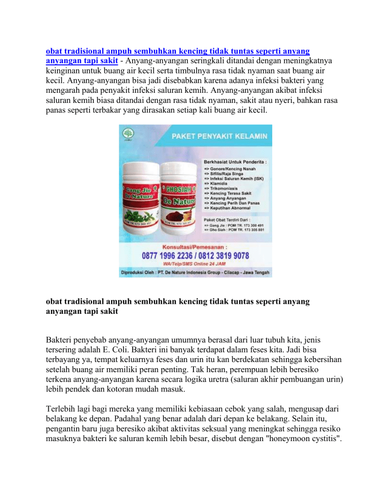 obat tradisional ampuh sembuhkan kencing tidak tuntas seperti anyang anyangan tapi sakit - Anyang-anyangan seringkali ditandai dengan meningkatnya keinginan untuk buang air kecil serta timbulnya rasa tidak nyaman saat buang air kecil. Anyang-anyangan bisa jadi disebabkan karena adanya infeksi bakteri yang mengarah pada penyakit infeksi saluran kemih. Anyang-anyangan akibat infeksi saluran kemih biasa ditandai dengan rasa tidak nyaman, sakit atau nyeri, bahkan rasa panas seperti terbakar yang dirasakan setiap kali buang air kecil. obat tradisional ampuh sembuhkan kencing tidak tuntas seperti anyang anyangan tapi sakit Bakteri penyebab anyang-anyangan umumnya berasal dari luar tubuh kita, jenis tersering adalah E. Coli. Bakteri ini banyak terdapat dalam feses kita. Jadi bisa terbayang ya, tempat keluarnya feses dan urin itu kan berdekatan sehingga kebersihan setelah buang air memiliki peran penting. Tak heran, perempuan lebih beresiko terkena anyang-anyangan karena secara logika uretra (saluran akhir pembuangan urin) lebih pendek dan kotoran mudah masuk. Terlebih lagi bagi mereka yang memiliki kebiasaan cebok yang salah, mengusap dari belakang ke depan. Padahal yang benar adalah dari depan ke belakang. Selain itu, pengantin baru juga beresiko akibat aktivitas seksual yang meningkat sehingga resiko masuknya bakteri ke saluran kemih lebih besar, disebut dengan "honeymoon cystitis". obat tradisional ampuh sembuhkan kencing tidak tuntas seperti anyang anyangan tapi sakit Mungkin bagi sebagian orang memiliki persepsi bahwa mengobati anyang anyangan tidak terlalu penting. Padahal selain menimbulkan ketidaknyamanan, anyang anyangan berpotensi menyebabkan penyakit yang lebih serius jika tidak segera diobati. Infeksi bisa menyebar ke saluran kemih yang lebih atas, bahkan bisa sampai ke ginjal (Infeksi Ginjal). Solusinya, dokter biasanya memberikan pipemidic acid. Indikasi diberikannya pipemedic acid ini antara lain: 1. ISK yang nyeri. 2. Tambahan terapi pada adenoma prostat. 3. Inkontinensia urine. 4. Pemakaian kateter permanen. Namun sebaiknya meminta resep dokter, sebab obat ini memiliki beberapa efek samping, antara lain berupa: 1. reaksi susunan saraf pusat, 2. reaksi saluran pencernaan, 3. reaksi kulit, 4. lemah otot, 5. mialgia (nyeri otot), 6. hipertensi intrakranial. Untuk pemberian antibiotik, disesuaikan dengan hasil kultur/ biakan bakteri. Bila ingin tanpa obat kimia yang banyak efek sampingnya, maka anda bisa gunakan obat alami atau obat herbal. Cara alami bisa dilakukan dengan membuat ramuan sendiri maupun dengan obat alami atau obat herbal. Jika ingin memilih menggunakan obat herbal maka pastikan jika obat tersebut memang sudah teruji klinis dan mempunyai izin edar dan resmi BPOM. Selain itu pastikan juga kehalalan produk tersebut dengan memiliki label HALAL MUI. Alangkah lebih baiknya juga jika produk sudah memiliki sertifikat ISO (9001:2015). Obat Infeksi Saluran Kemih (ISK) - Anyang Anyangan - Kencing Nanah/Gonore - Sipilis/Raja Singa - Klamidia - Penyakit Kelamin Herbal Alami De Nature Indonesia adalah sebuah perusahaan yang bergerak di bidang Obat Tradisional (OT) dari dalam Negeri, yang mencoba mengangkat dan menghidupkan kembali Budaya Nenek Moyang kita Yaitu Jamu Tradisional sebagai salah satu warisan leluhur budaya bangsa yang perlu dilestarikan. Produk De Nature dalam artikel ini khusus untuk mengatasi masalah kelamin / penyakit kelamin. Sekedar informasi untuk kenyamanan Konsumen, bahwa Produk dari perusahaan kami ini sudah memiliki: Ijin Resmi Perusahaan dari Kementerian Kesehatan Ijin BPOM, yang artinya sudah lulus uji stabilitas Produk Sertifikat Halal MUI, sehingga kehalalannya bisa dipertanggungjawabkan Apoteker Yang berpengalaman Sudah melewati Proses Sortir Bahan Baku, Guna Menjaga Mutu Produk Proses Produksi Sesuai Alur CPOTB (Cara Pembuatan Obat Tradisional Yang Baik Dan Benar) Sertifikat ISO 9001 : 2015 yang artinya sudah Berstandar Internasional BERKHASIAT UNTUK : Mengobati Sipilis/Rajasinga/Gonore/Kencing Nanah/Infeksi Saluran Kemih/Anyang Anyangan Sebagai Antivirus Sebagai Antibakteri Mengatasi kencing sakit, perih dan panas Memperbaiki jaringan sel pada bagian uretric Memulihkan stamina Menjaga kesehatan Mengobati Saluran Kencing Membantu meningkatkan sistem imunitas (kekebalan tubuh), serta membantu mempercepat proses pemulihan kondisi badan. Untuk informasi lebih lanjut mengenai Produk dan Harga, Cara Pemesanan/ Konsultasi atau hal lainnya, anda dapat menghubungi kami melalui Telpon/WhatsApp/SMS (Online 24 jam / Fast Respon) pada nomor yang tertera pada gambar obat di atas. Produk Yang Asli : Pastikan Dikirim dari "MAJENAG, KOTA CILACAP, JAWA TENGAH" Karena pengiriman barang hanya satu pintu jika di kirim dari luar daerah tersebut sudah bisa di pastikan produk PALSU! Produk yang asli memiliki hologram pemilik De Nature Indonesia jika berhologram dengan gambar yang lain dipastikan PALSU! PESAN DISINI PASTI PRODUK 100% ORIGINAL AGEN RESMI DE NATURE INDONESIA Jaminan Uang Kembali Jika Produk Palsu! Simpan saja no kontak Customer Service kami. Mungkin suatu saat anda, keluarga anda, kerabat maupun orang tersayang anda membutuhkan solusi ini. Penelusuran yang terkait dengan obat tradisional ampuh sembuhkan kencing tidak tuntas seperti anyang anyangan tapi sakit : obat herbal anyang -anyangan, obat anyang anyangan di apotik kimia farma, cara mengobati anyang -anyangan secara alami dan cepat, cara mengobati infeksi saluran kemih secara alami dan cepat, obat anyang -anyangan tradisional, penyebab -anyang -anyangan, cara mengatasi anyang -anyangan di malam hari, obat anyang -anyangan di apotik ampuh